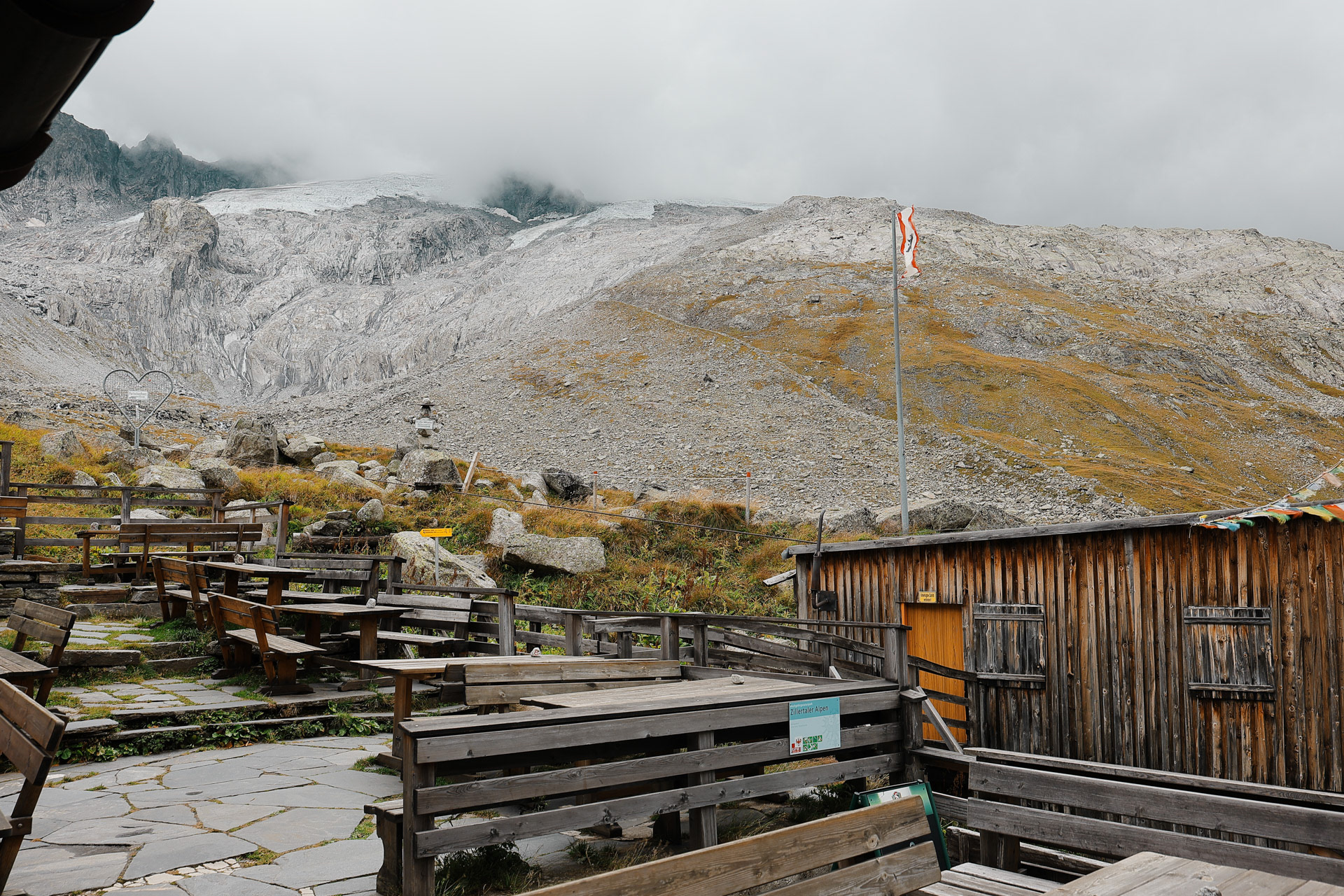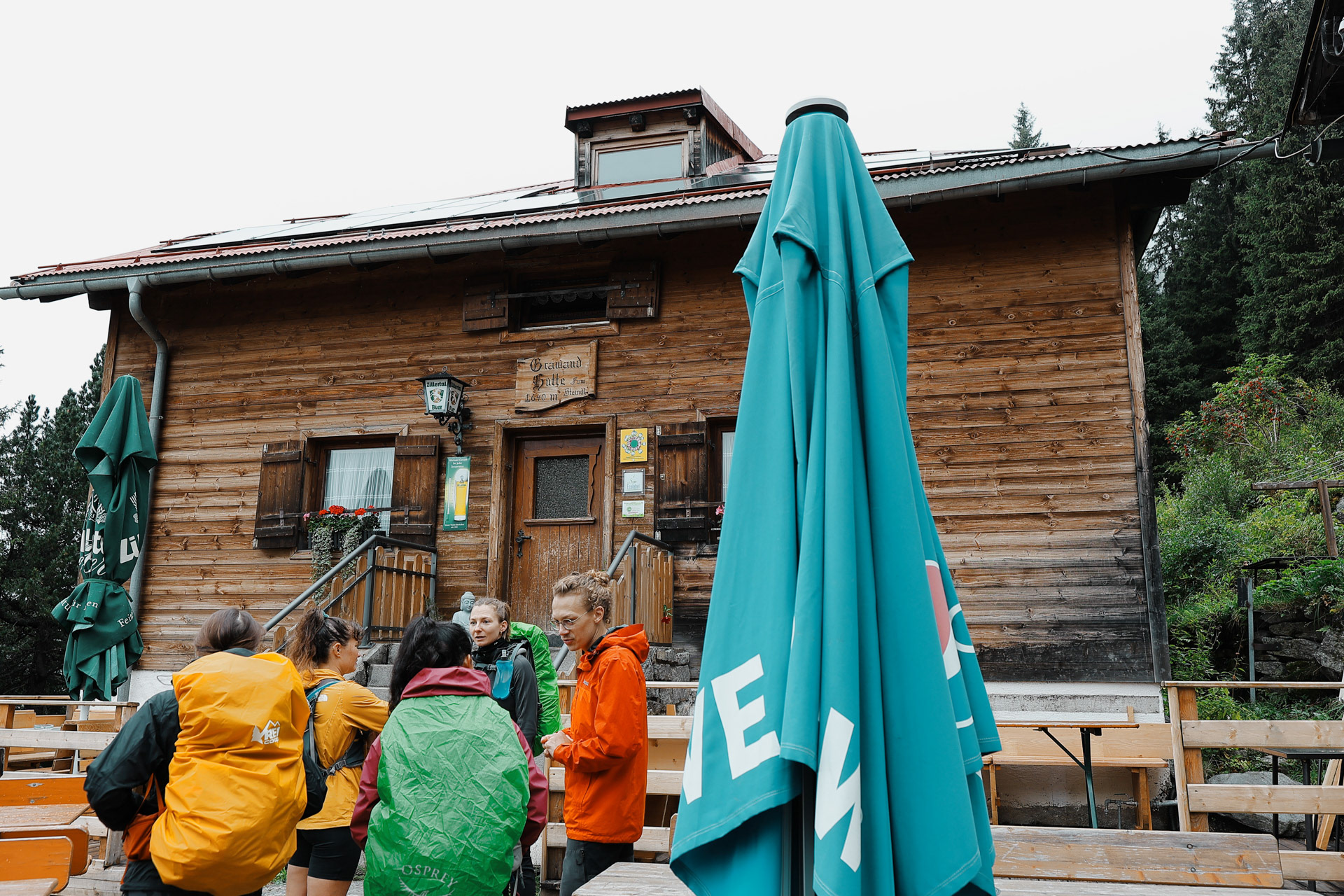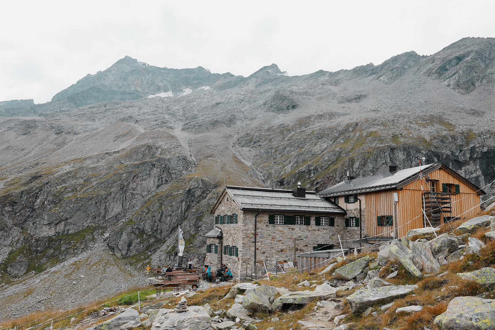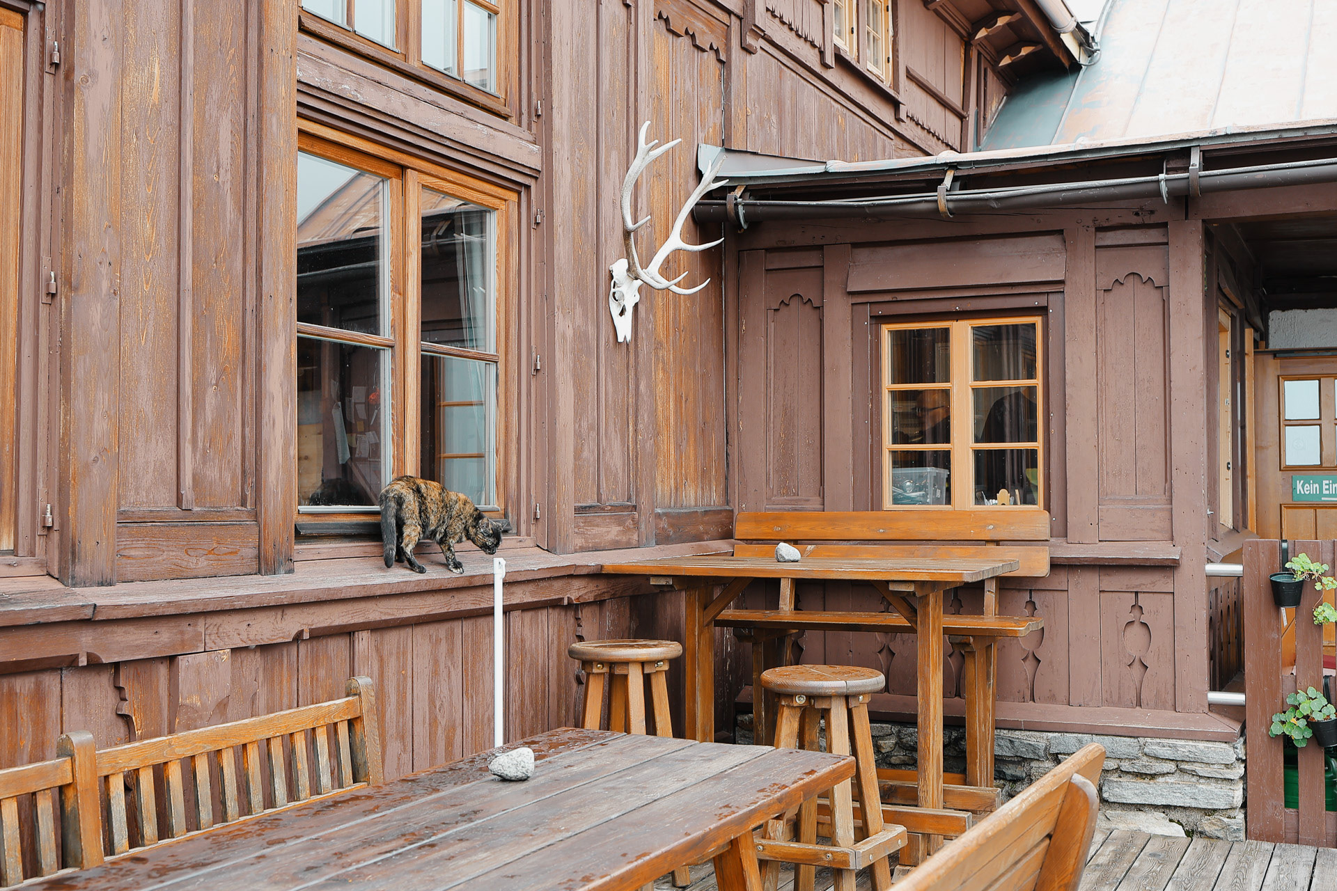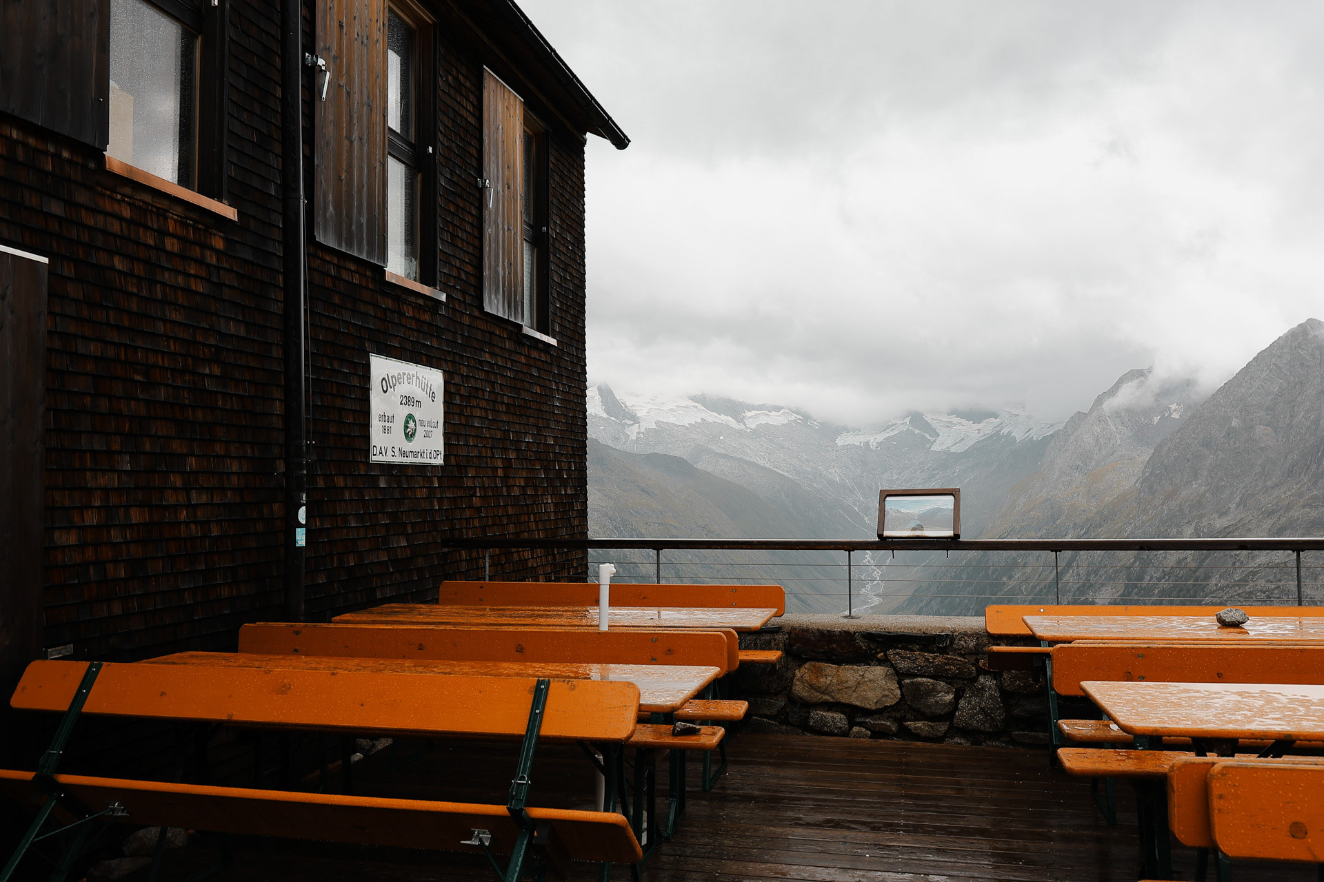 Friesenberghaus has some outdoor seating. When we arrived, it was still sunny and people were hanging outside. By the time, we wanted to hang out on the deck, it had started drizzling and the tables emptied.