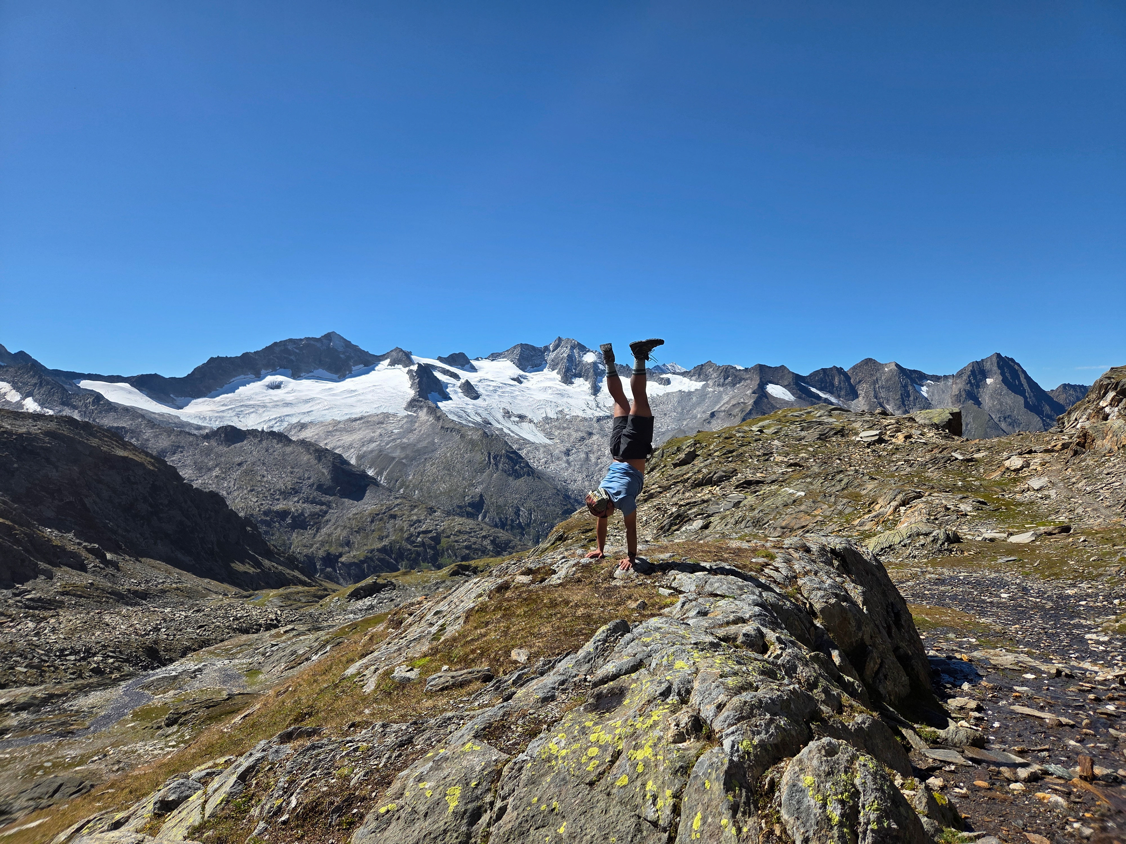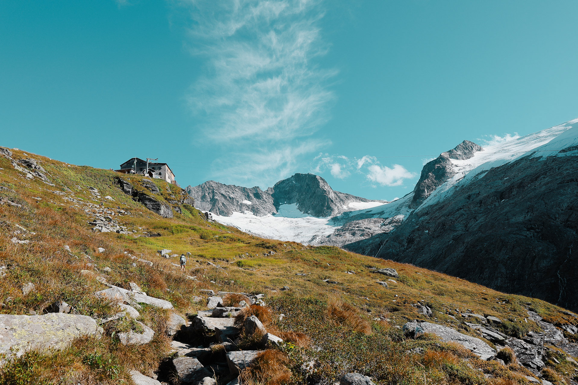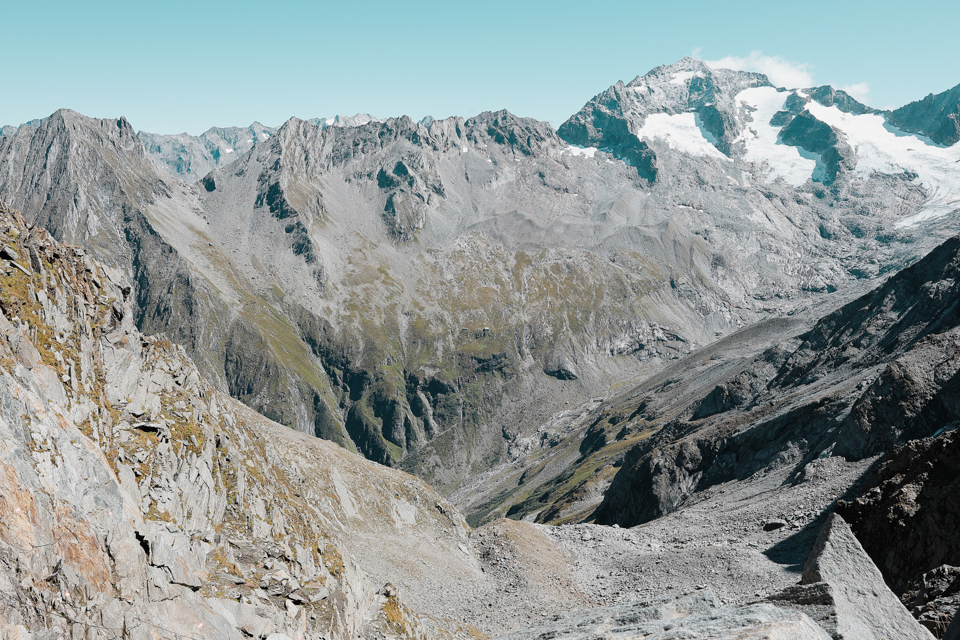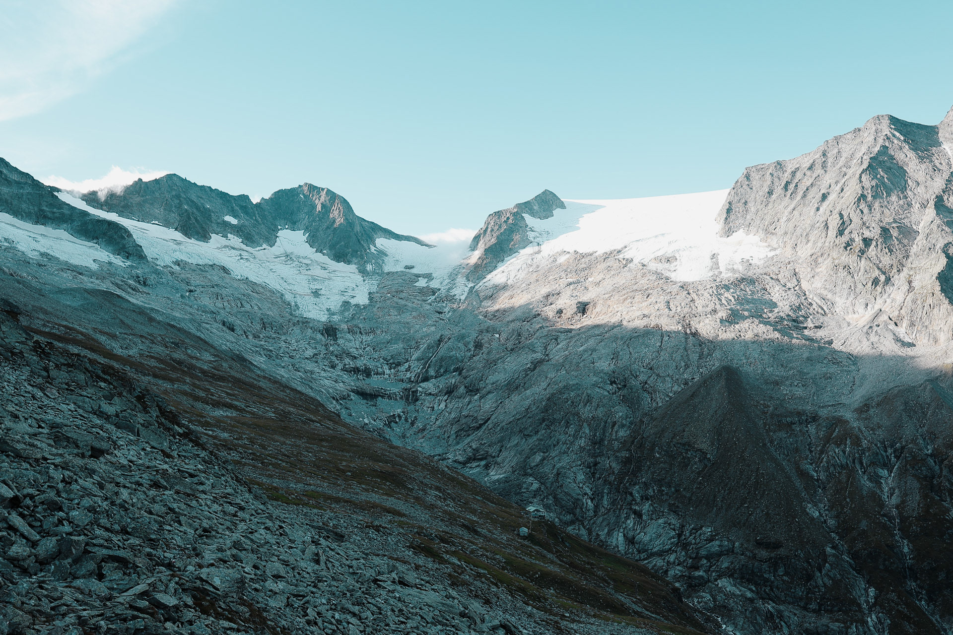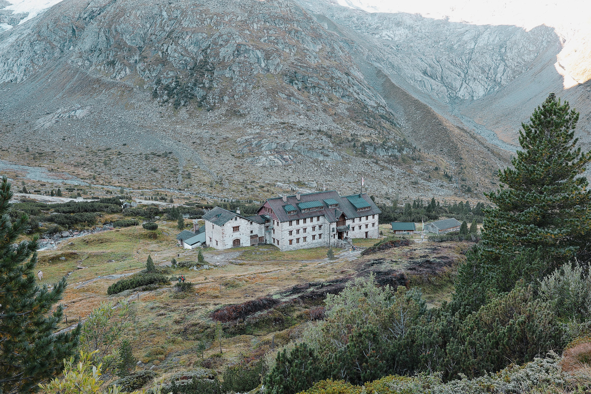 Greizer Hutte at the bottom, still in the shadow of the valley. This hut has been the hut closest to snow on the glacier. You can definitely feel it too! I did feel it as I was close to the open window in the room and only had one blanket (I was too tired to get another one in the middle of the night).