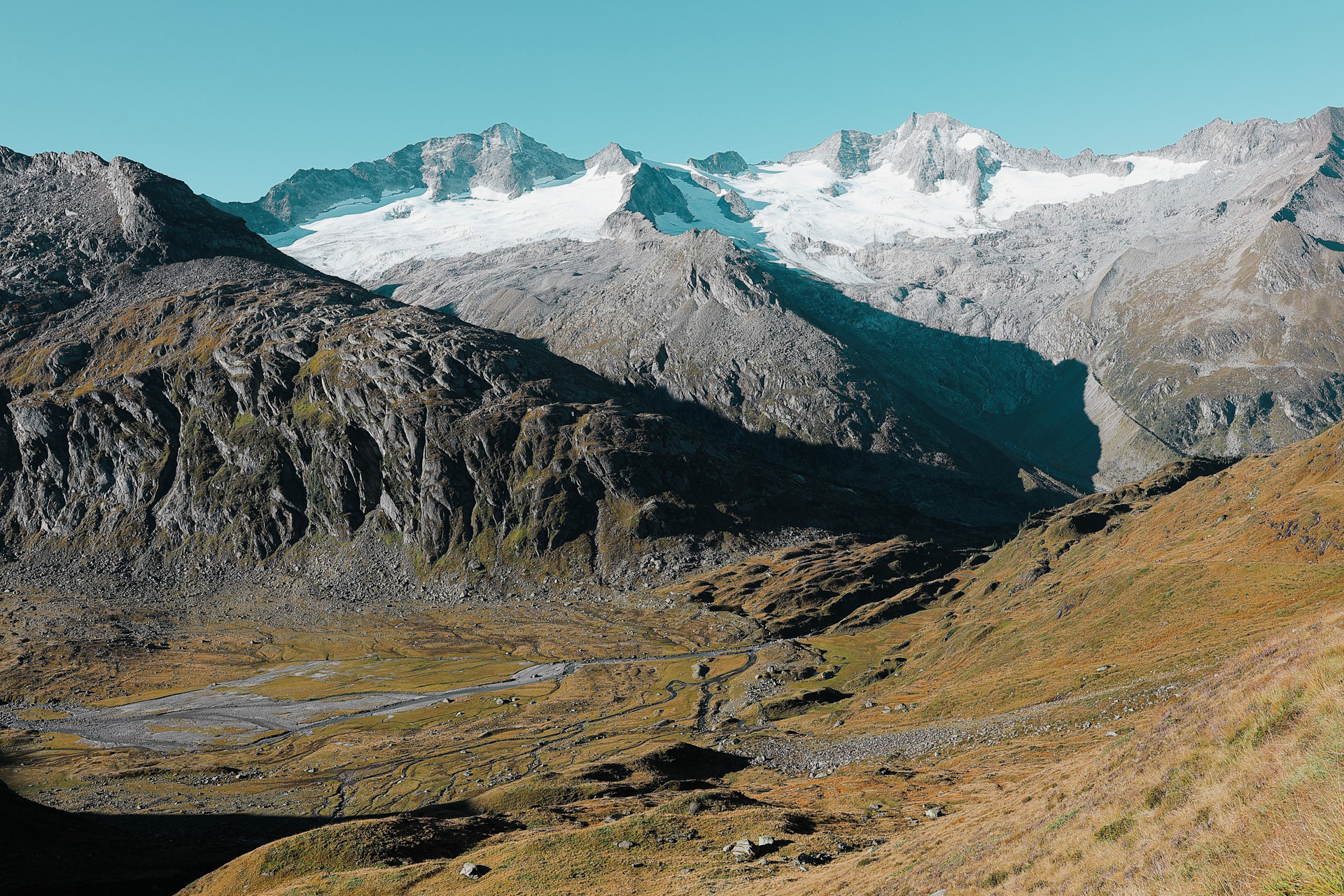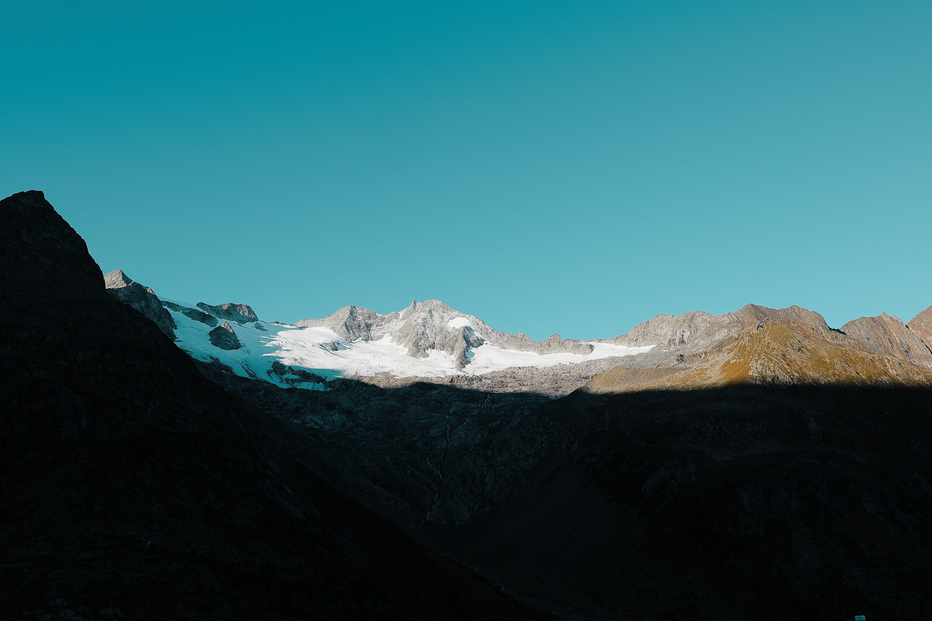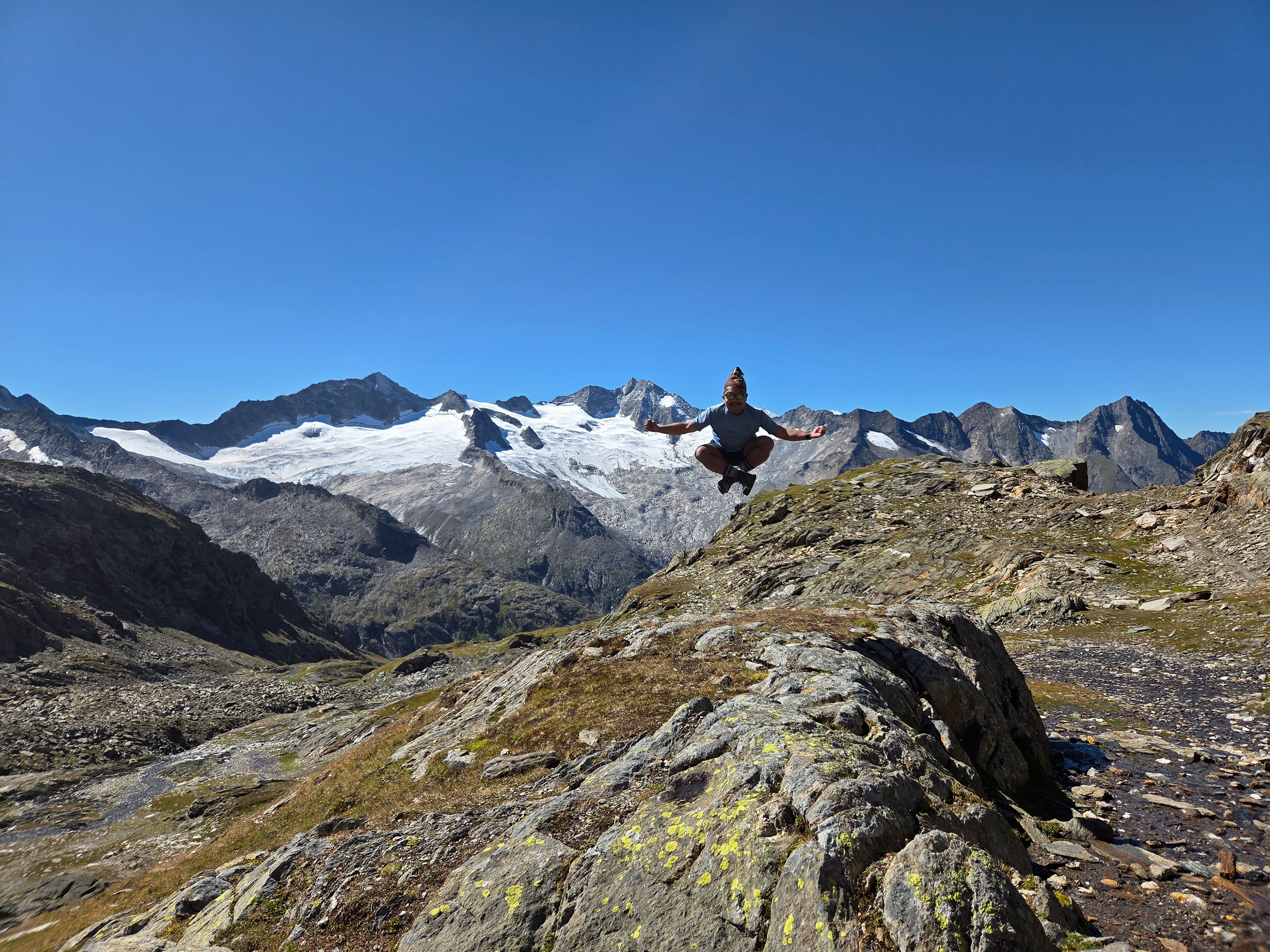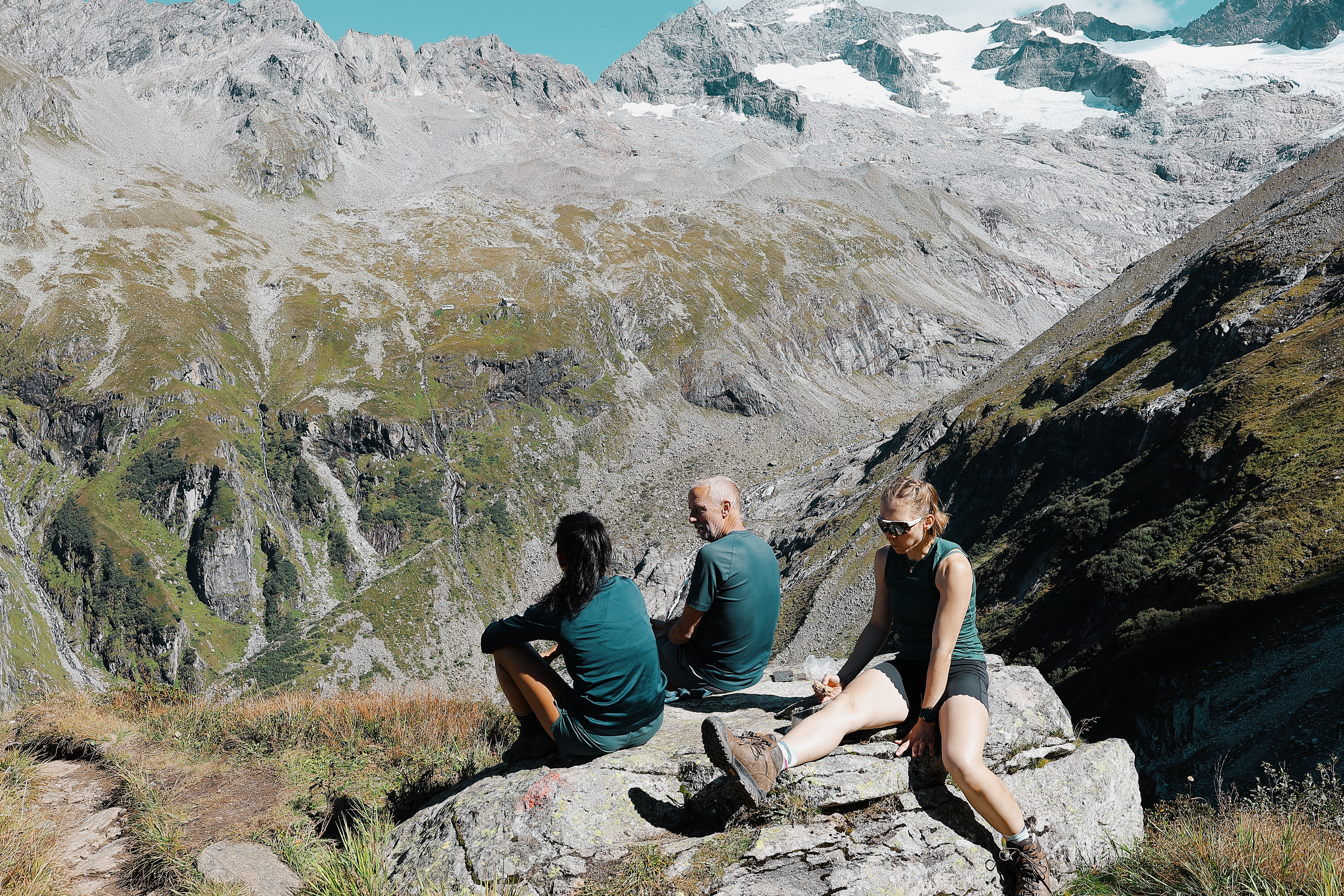Greizer Hutte at the bottom, still in the shadow of the valley. This hut has been the hut closest to snow on the glacier. You can definitely feel it too! I did feel it as I was close to the open window in the room and only had one blanket (I was too tired to get another one in the middle of the night).
