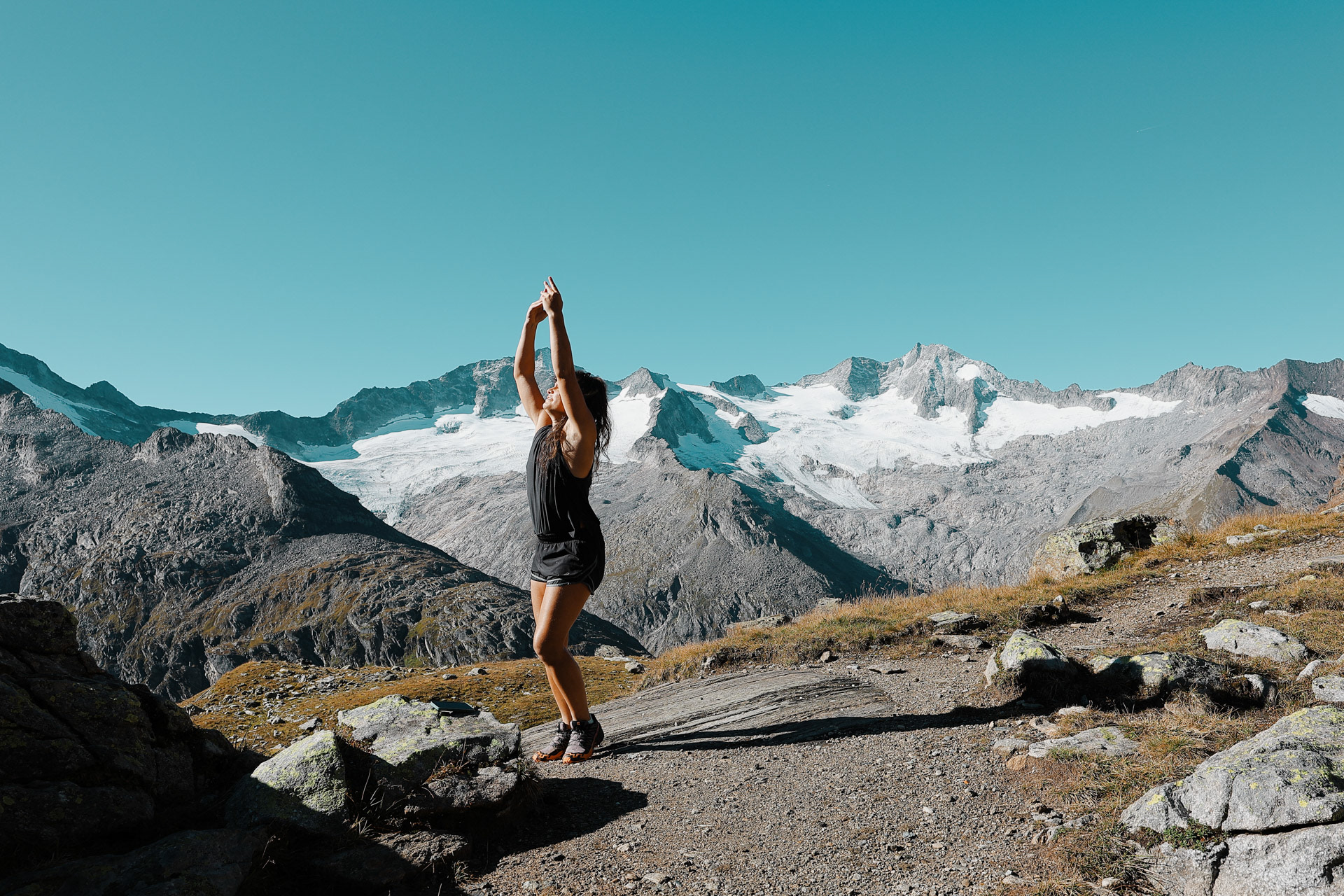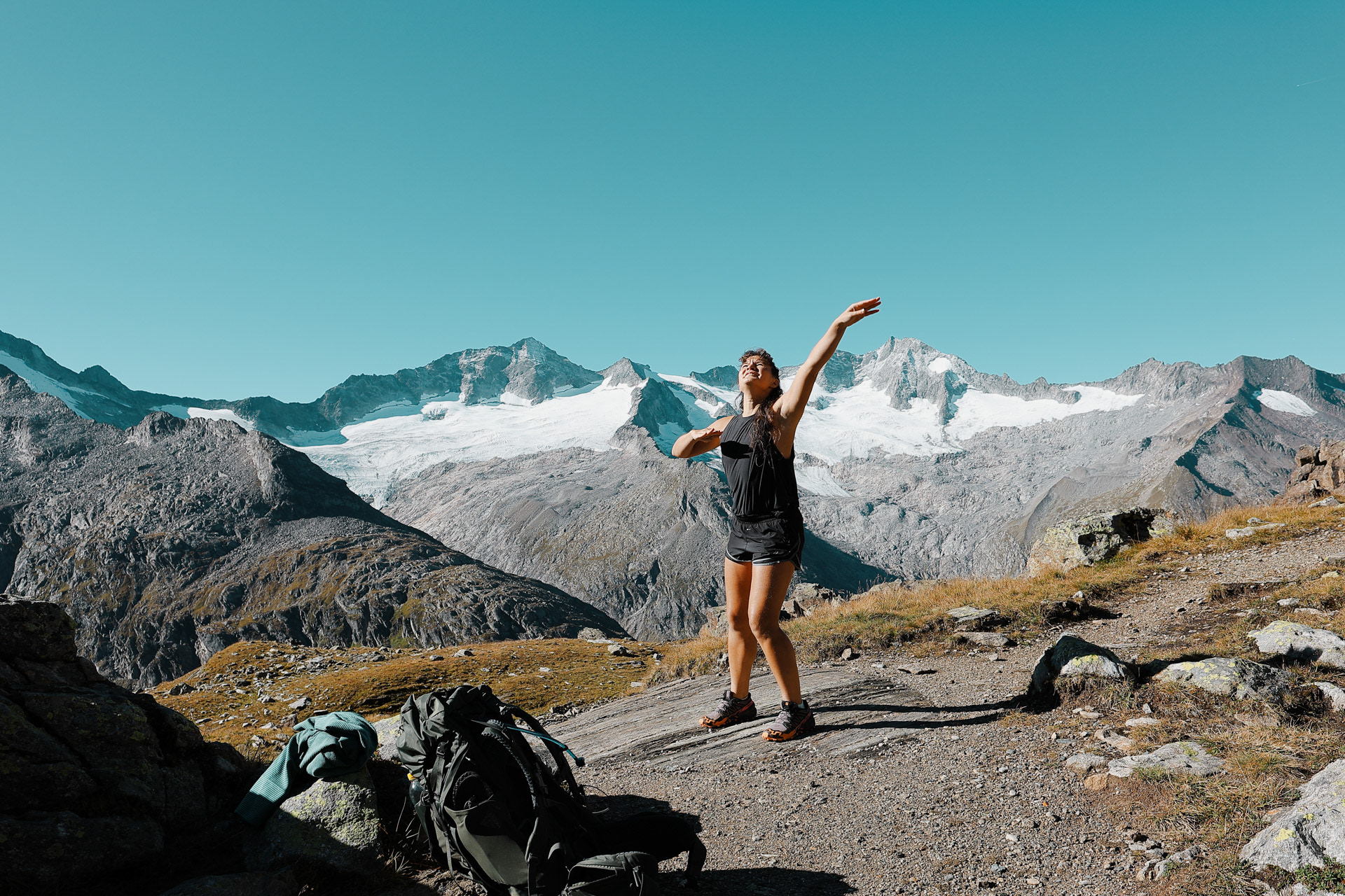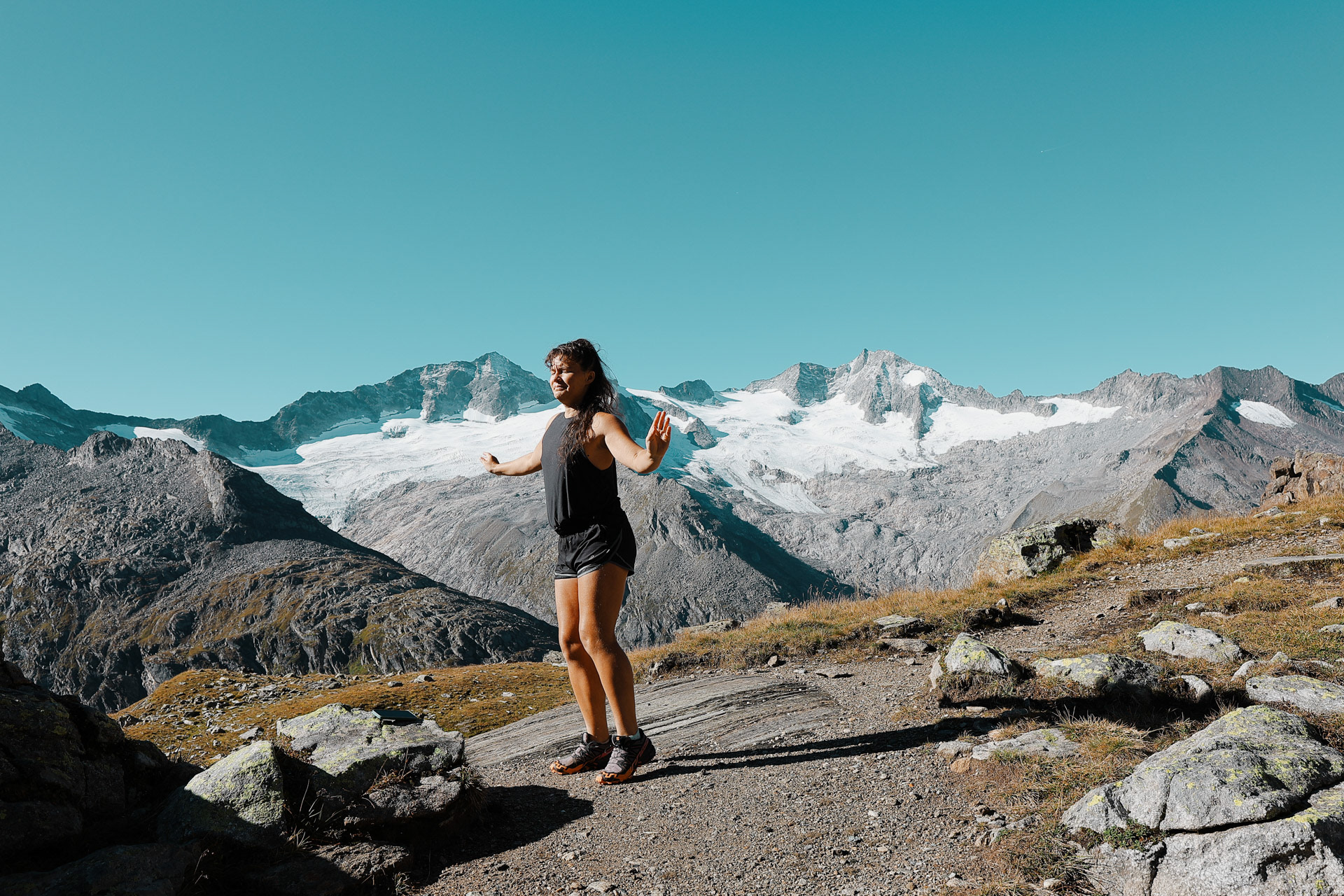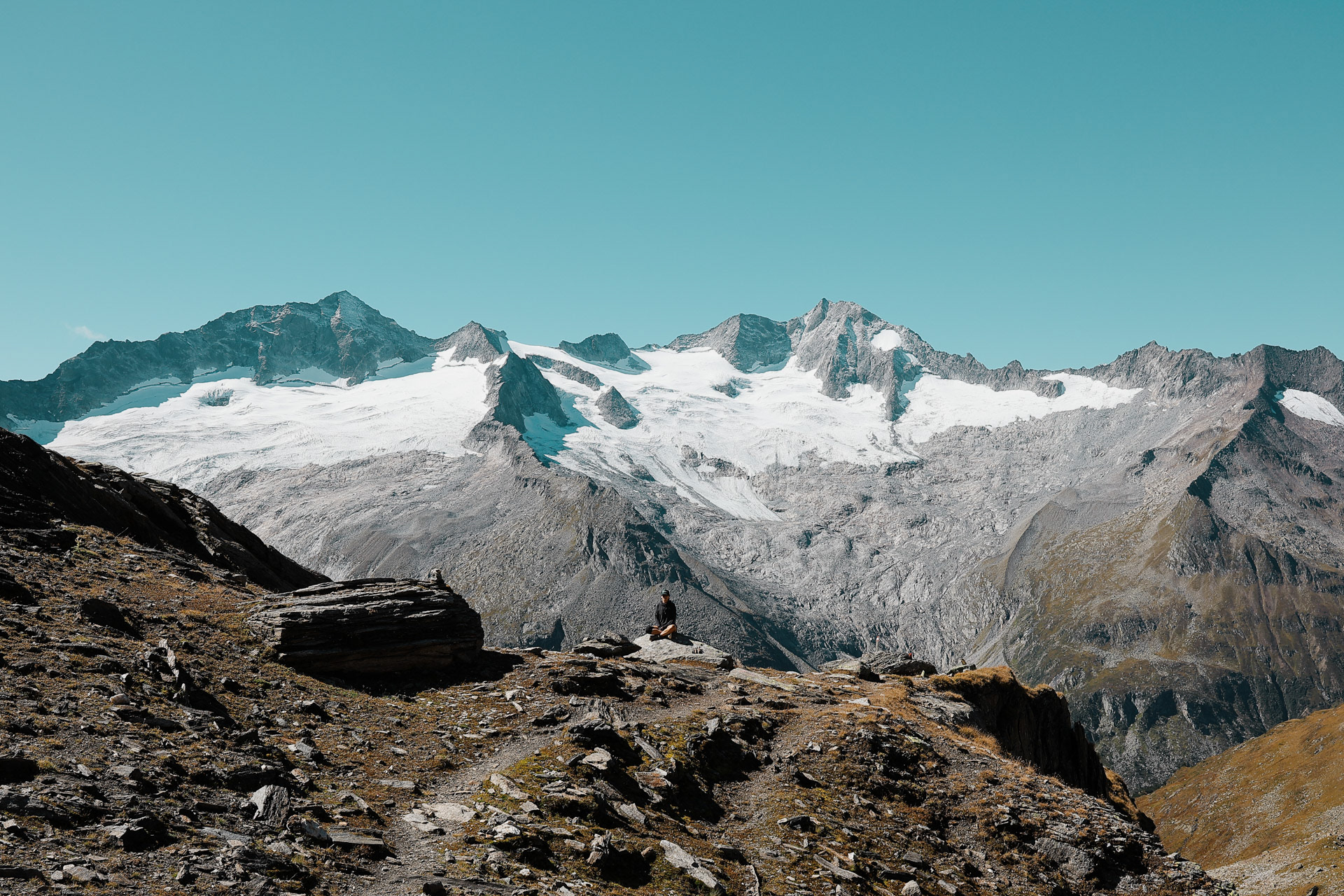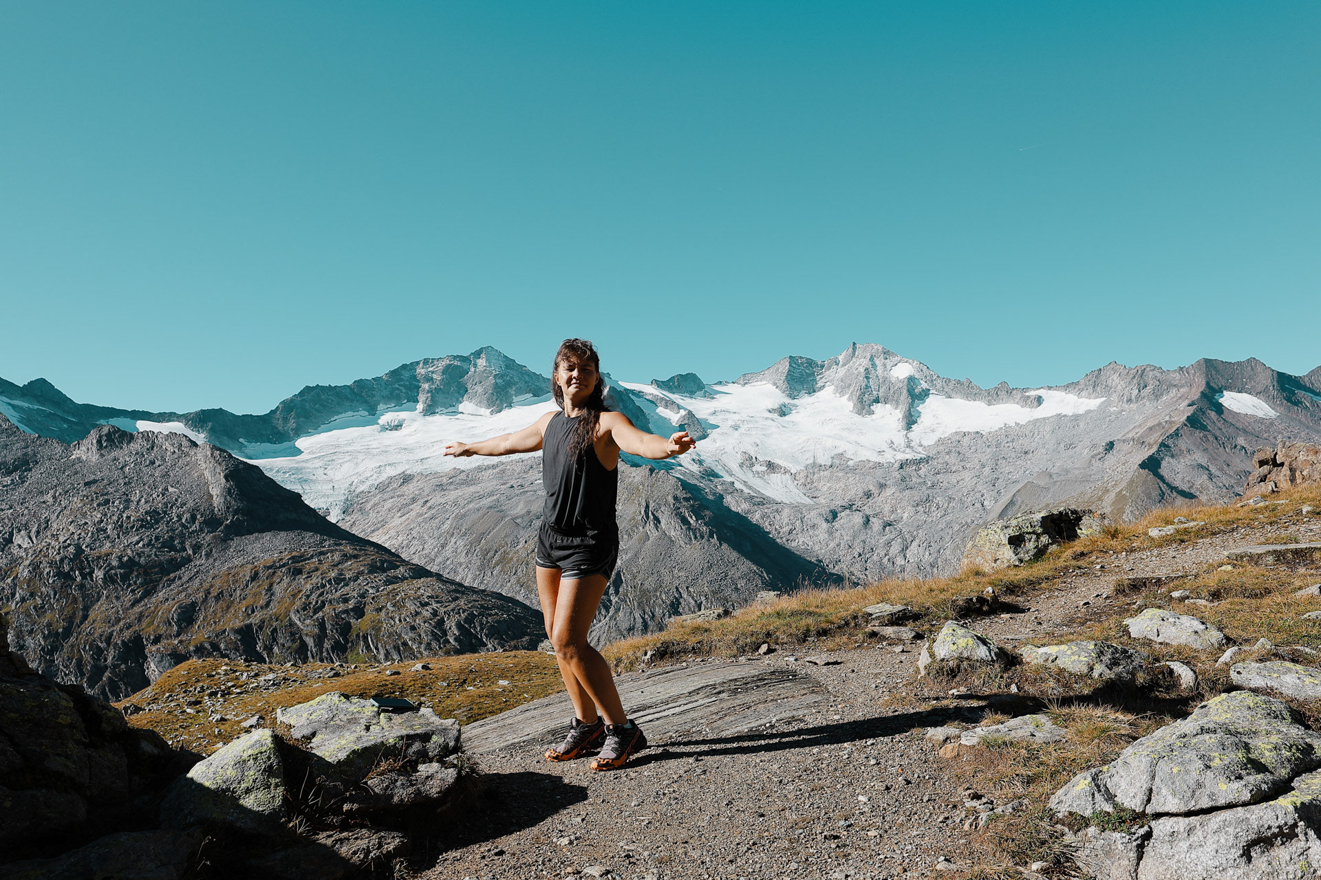 Greizer Hutte at the bottom, still in the shadow of the valley. This hut has been the hut closest to snow on the glacier. You can definitely feel it too! I did feel it as I was close to the open window in the room and only had one blanket (I was too tired to get another one in the middle of the night).