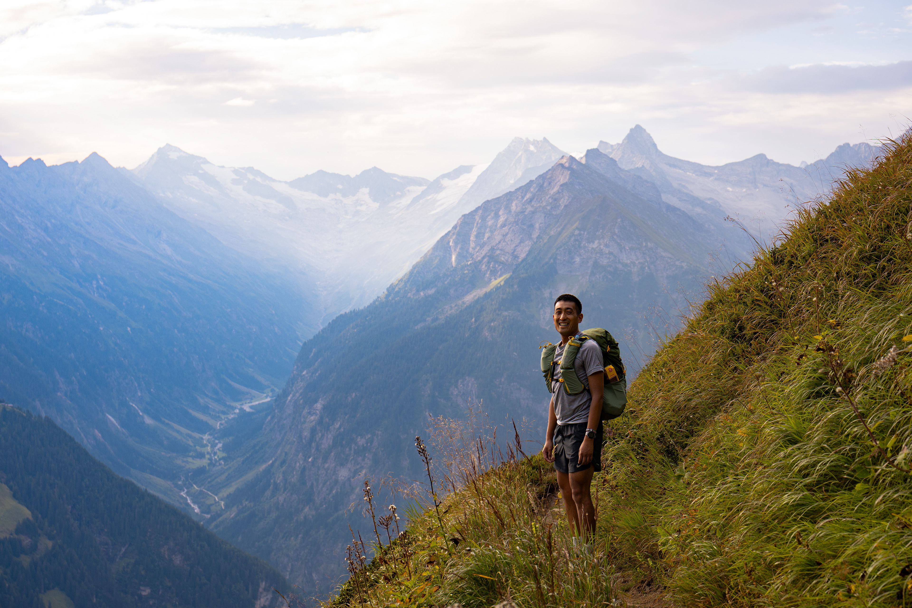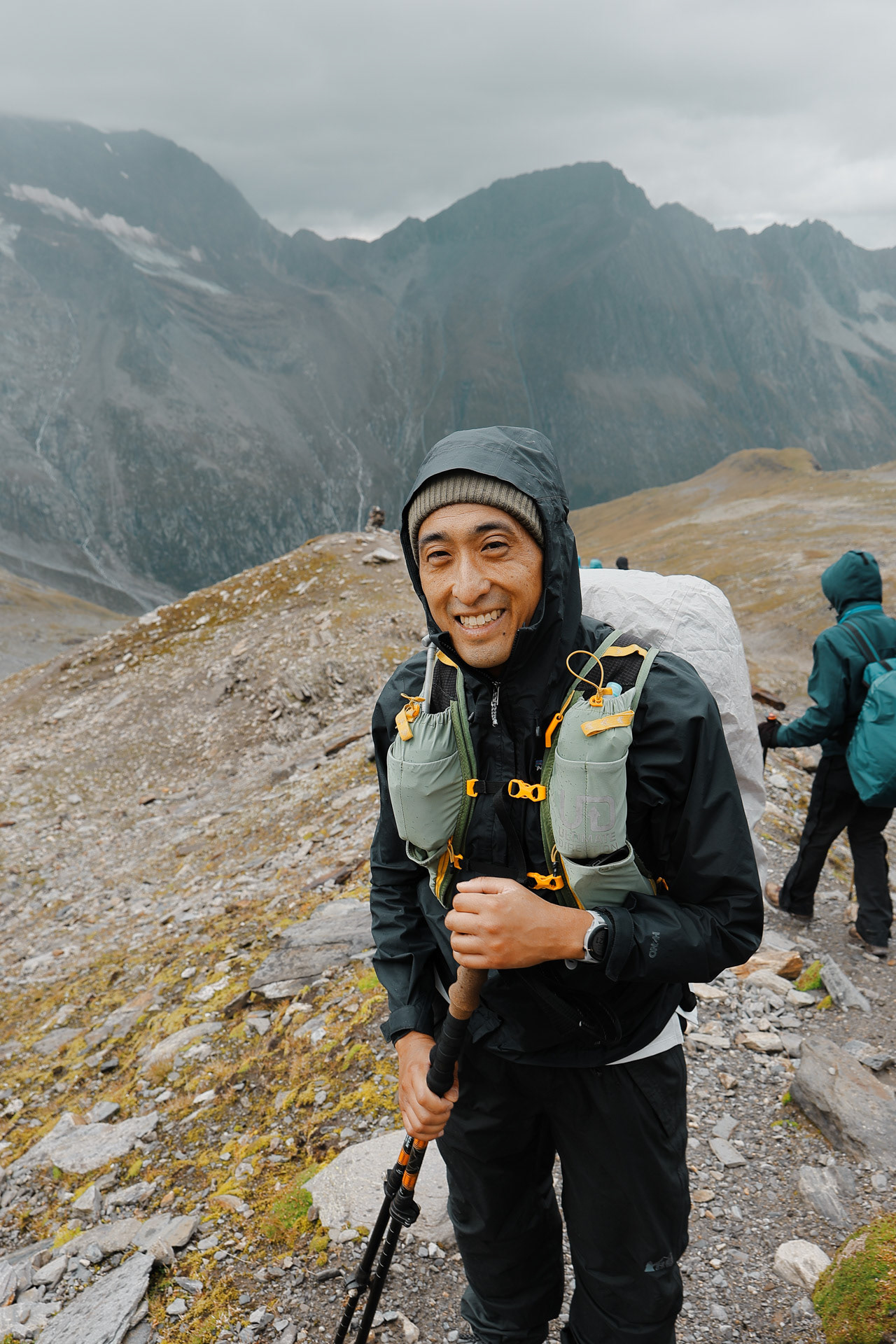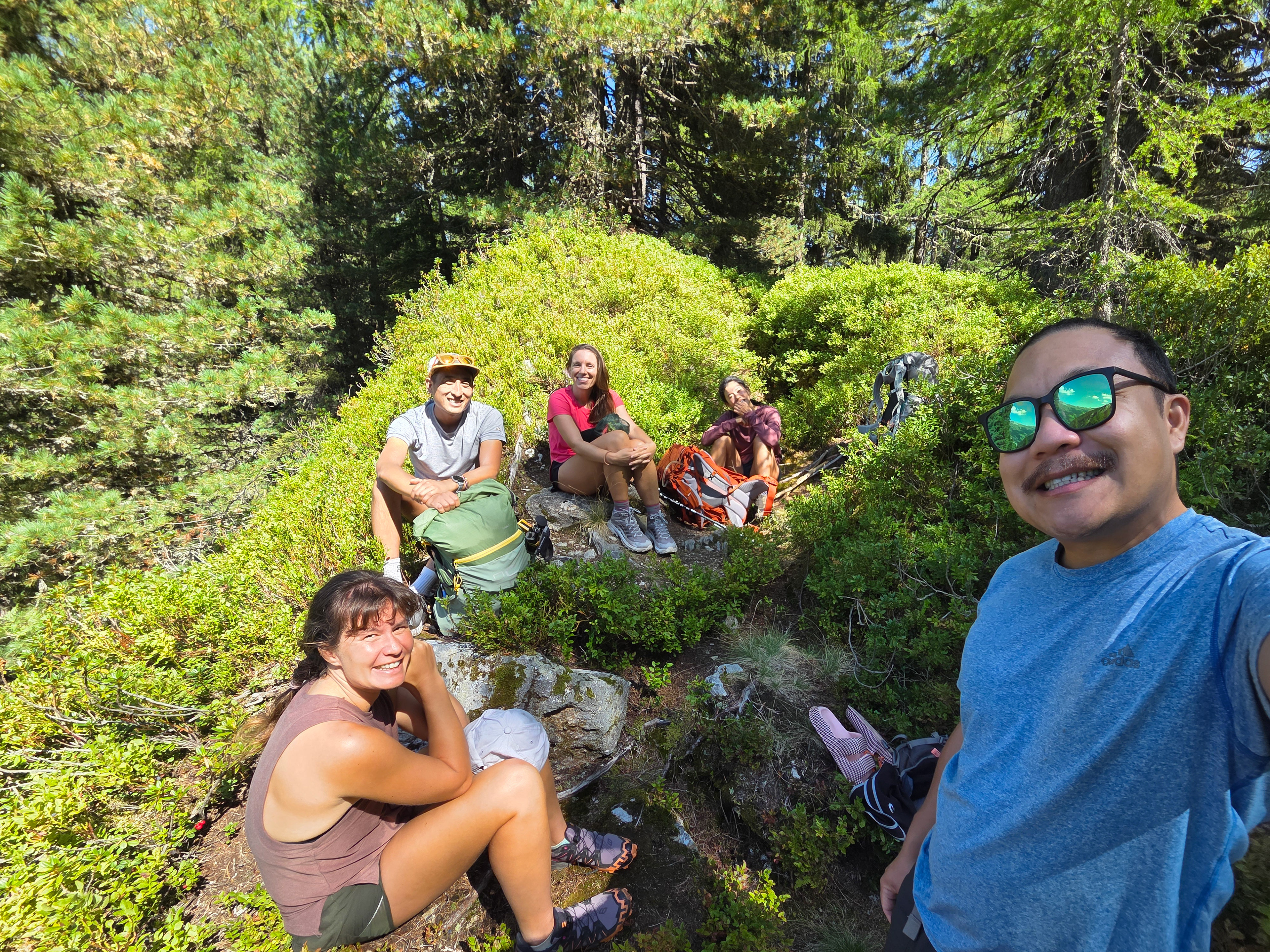 A quick rest stop on a ridge after a relatively intense ascent. We learn that Han has a lot of mountaineering experience and has done backpacking trips all over the world.