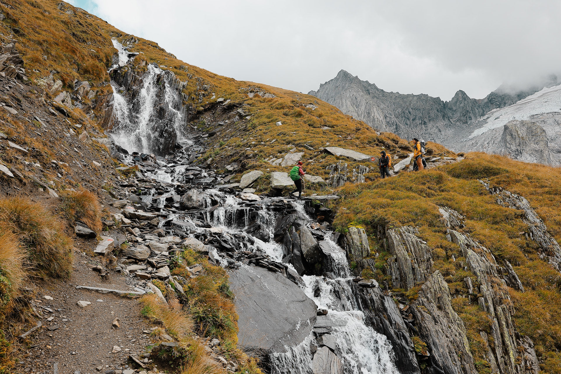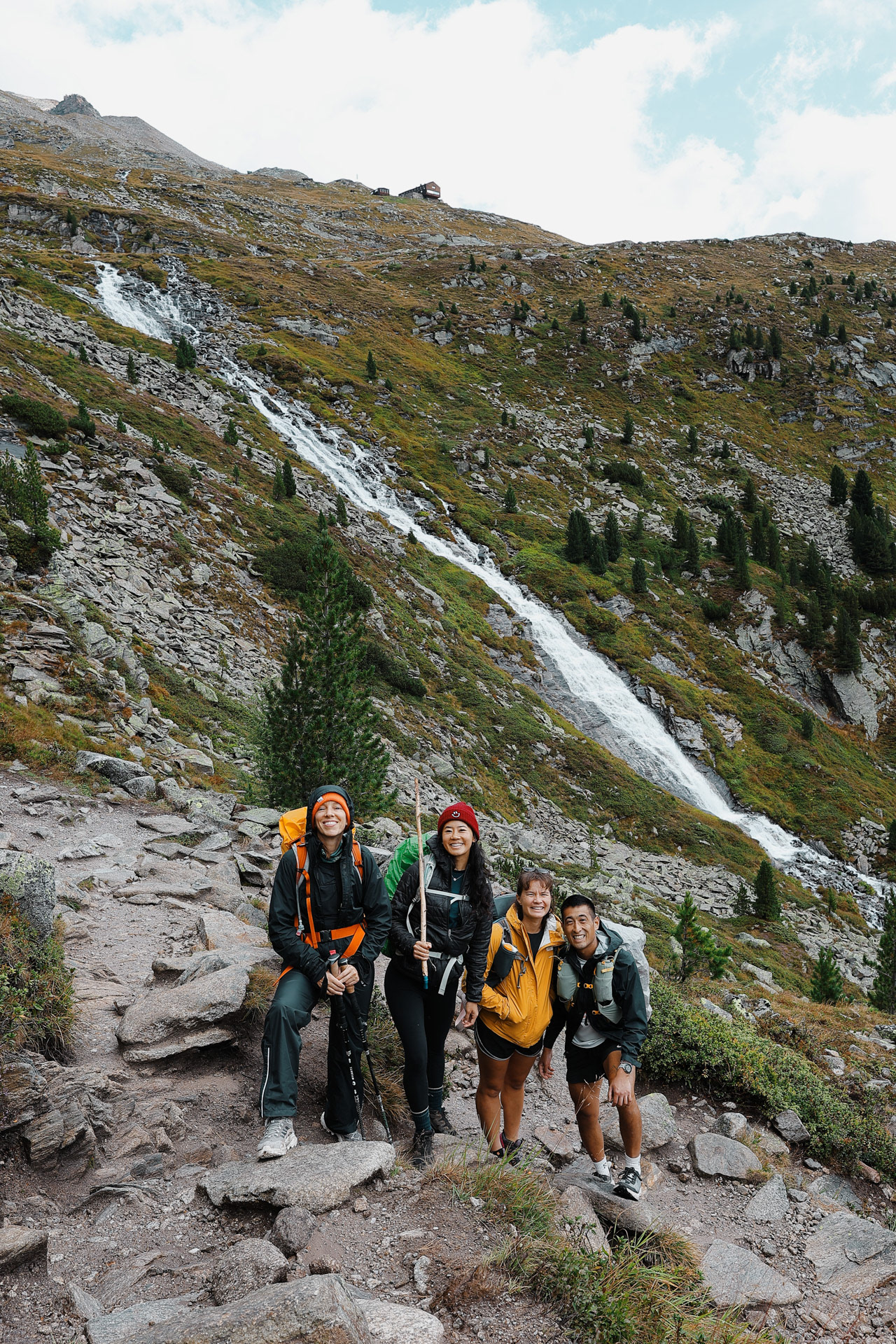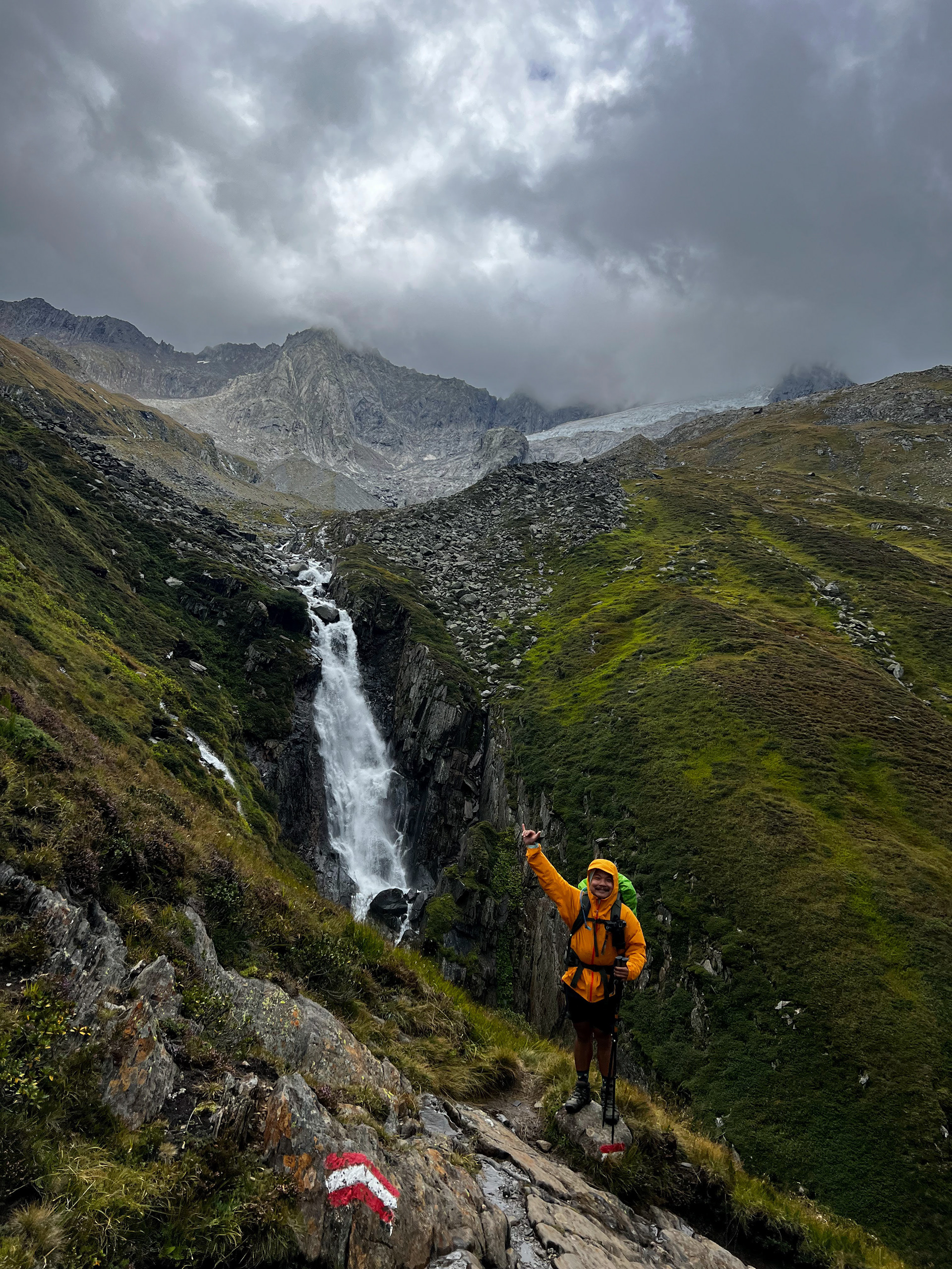 The waterfall we were hiking by! There are portions of the trail where the trail takes us right beside the waterfall. It was around this time that someone floated an idea: Since there could be hike-canceling thunderstorms looming tomorrow, should we just hike from Olpererhutte to Berliner Hutte today? If we were going to get stuck at a hut, the thinking was, we might as well go to the next and likely better one.