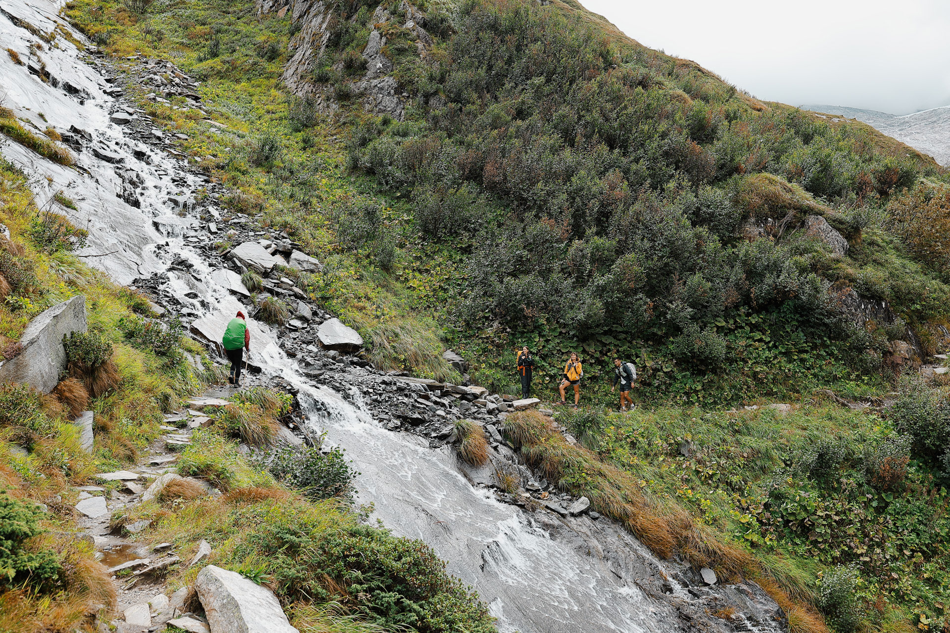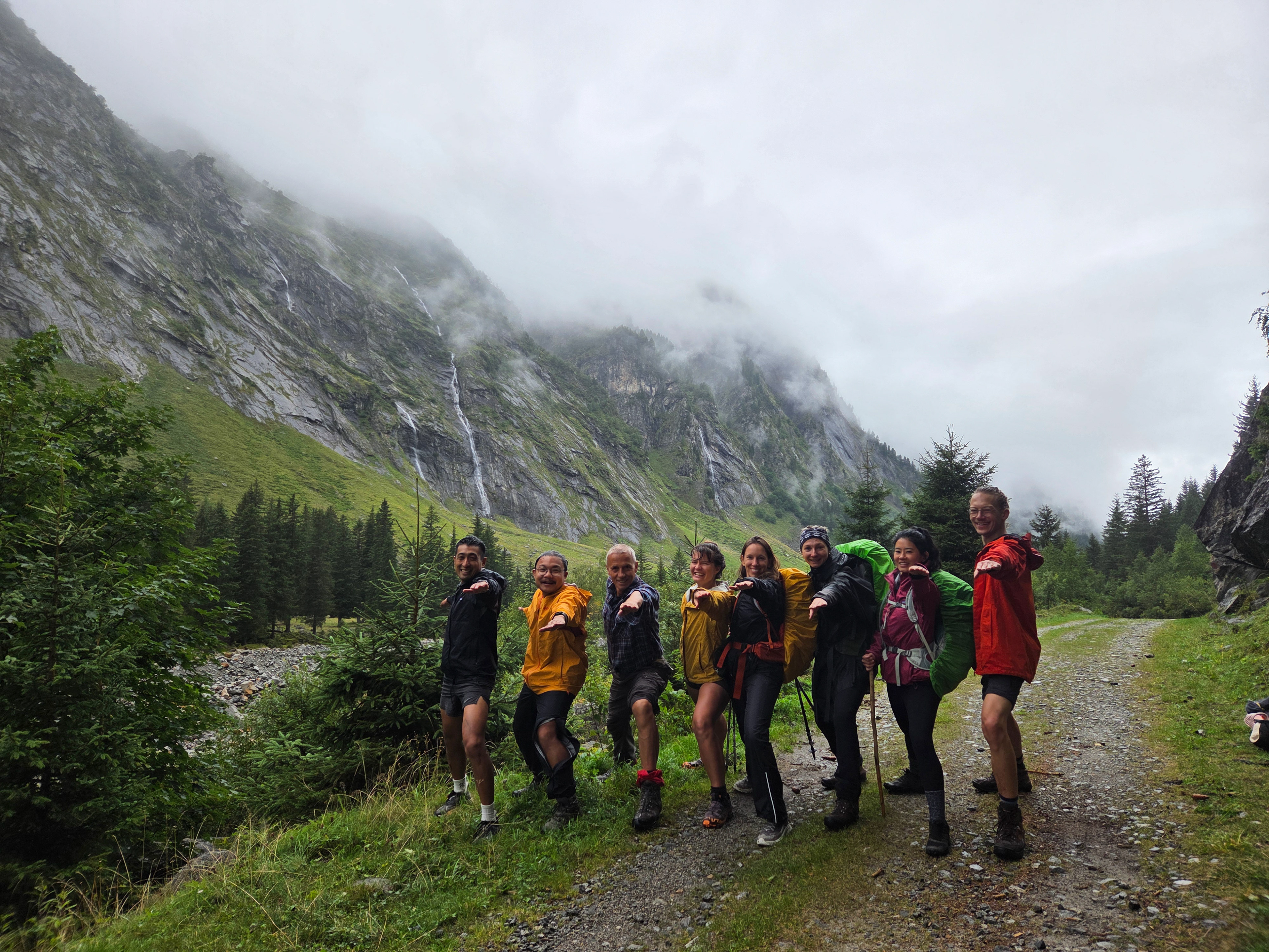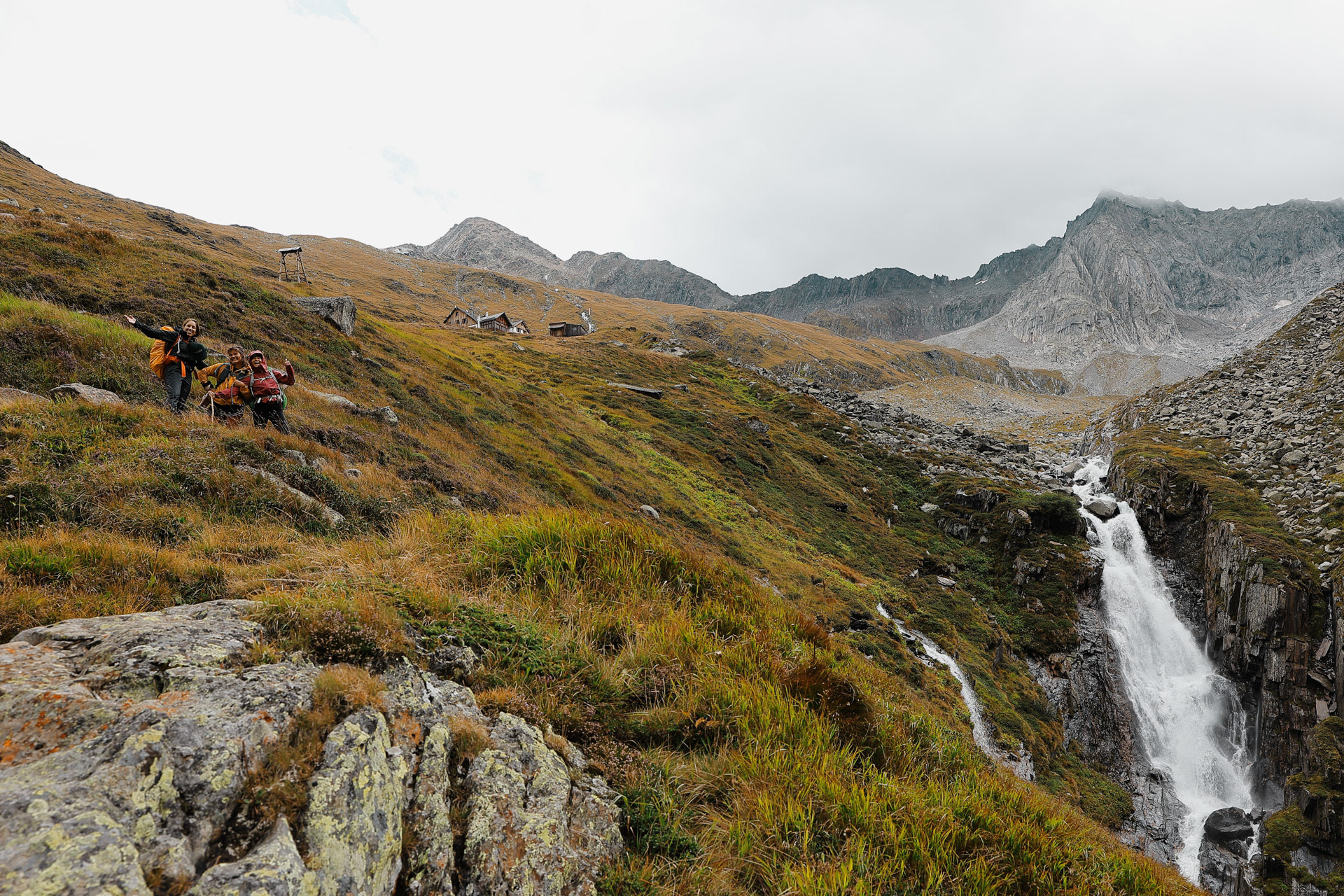 The waterfall we were hiking by! There are portions of the trail where the trail takes us right beside the waterfall. It was around this time that someone floated an idea: Since there could be hike-canceling thunderstorms looming tomorrow, should we just hike from Olpererhutte to Berliner Hutte today? If we were going to get stuck at a hut, the thinking was, we might as well go to the next and likely better one.