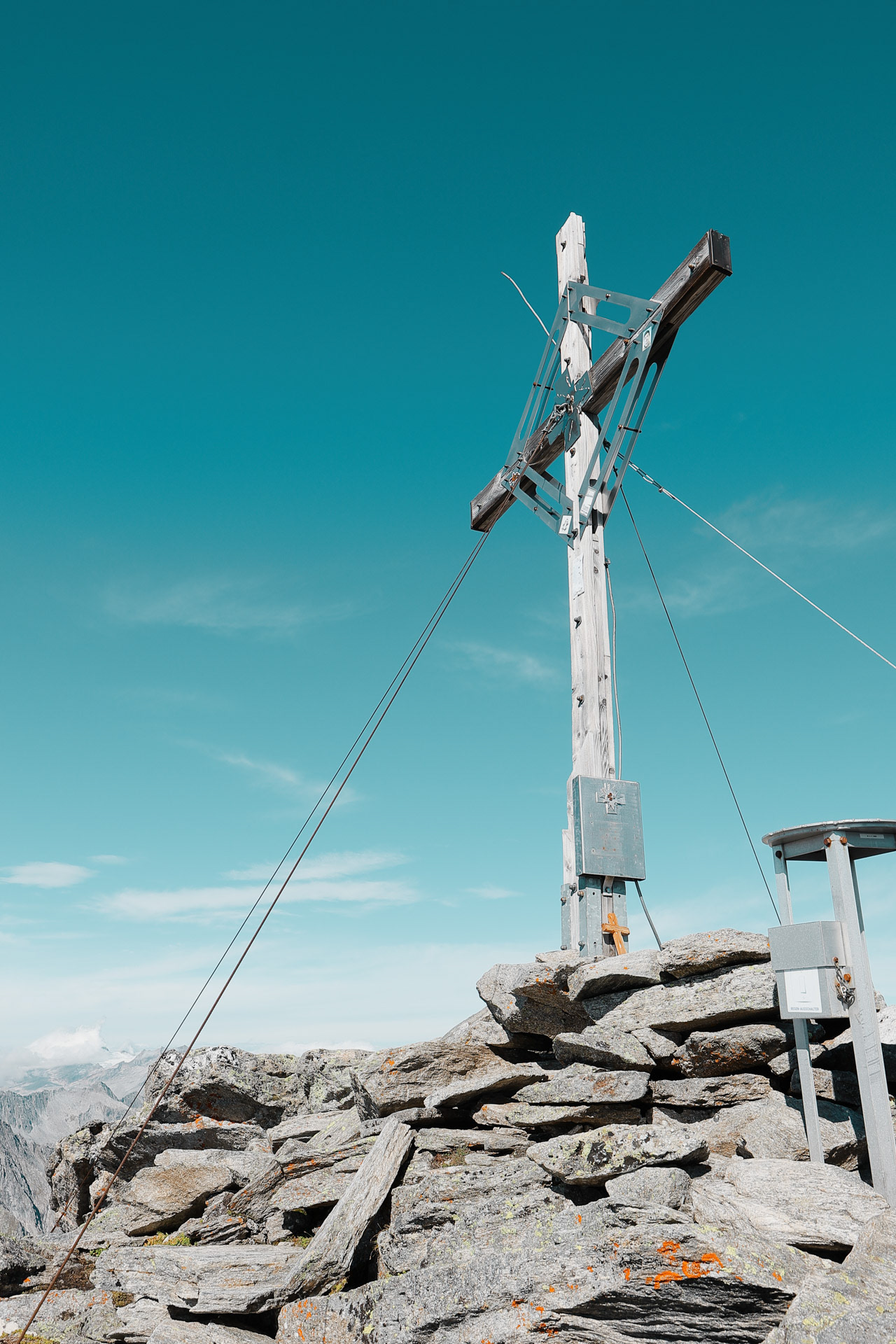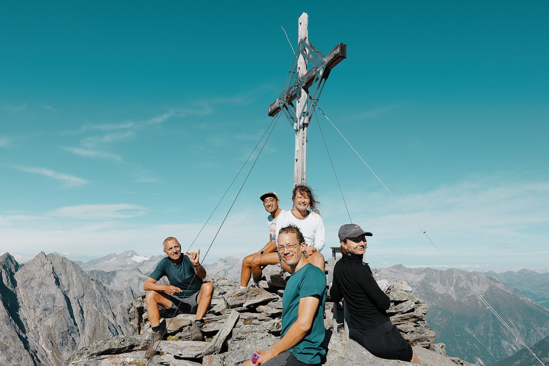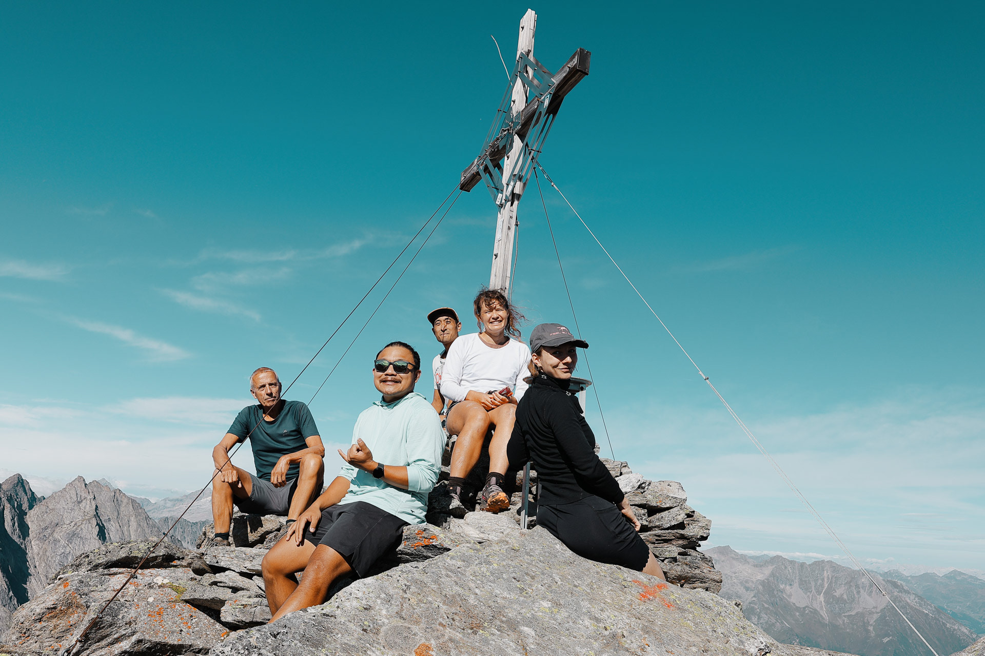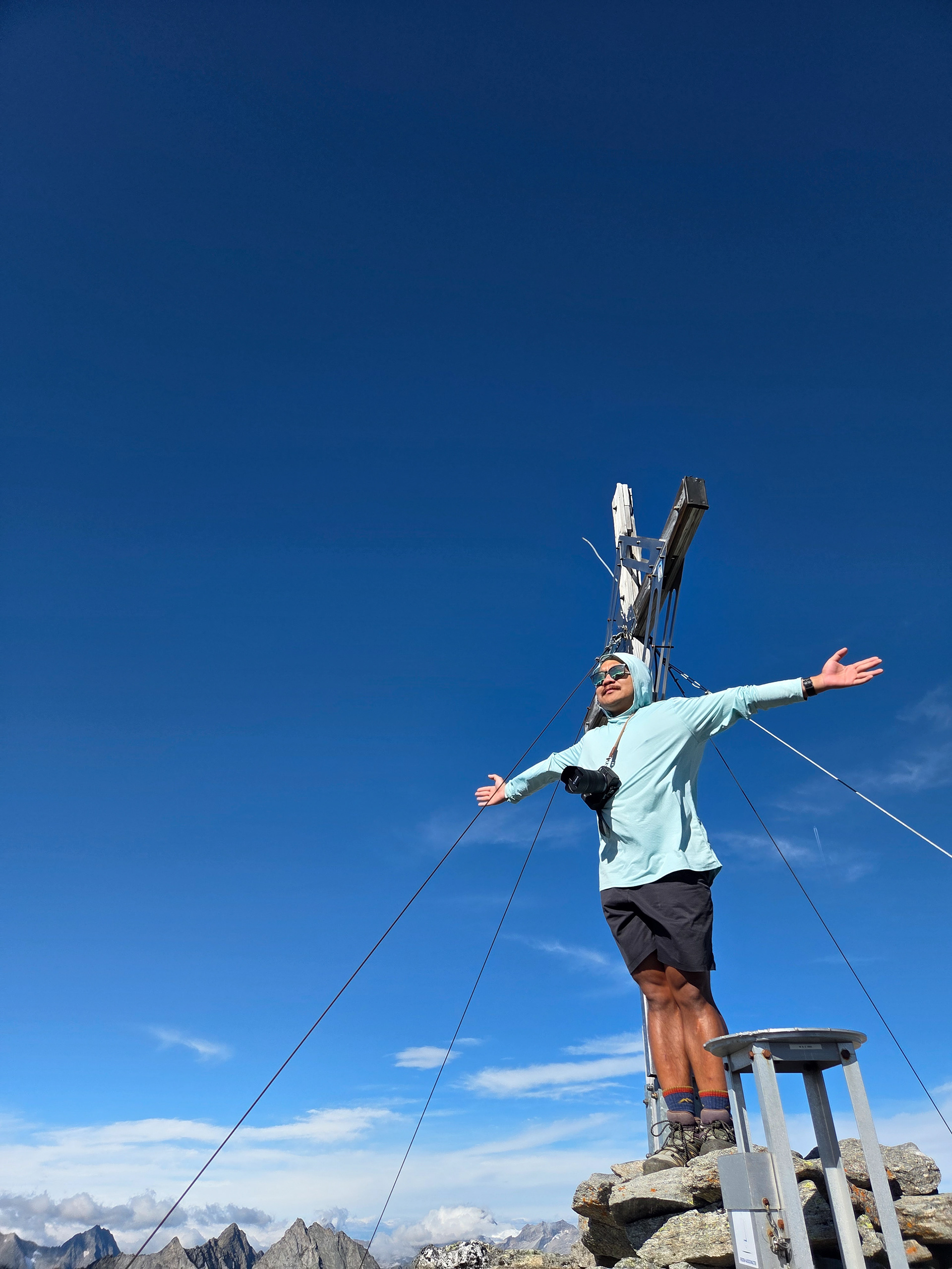 At the top of Gigalitz Peak is a cross, just like many other peaks. There were already a couple of people here when we got here and we asked them if they could take a picture before we headed down!