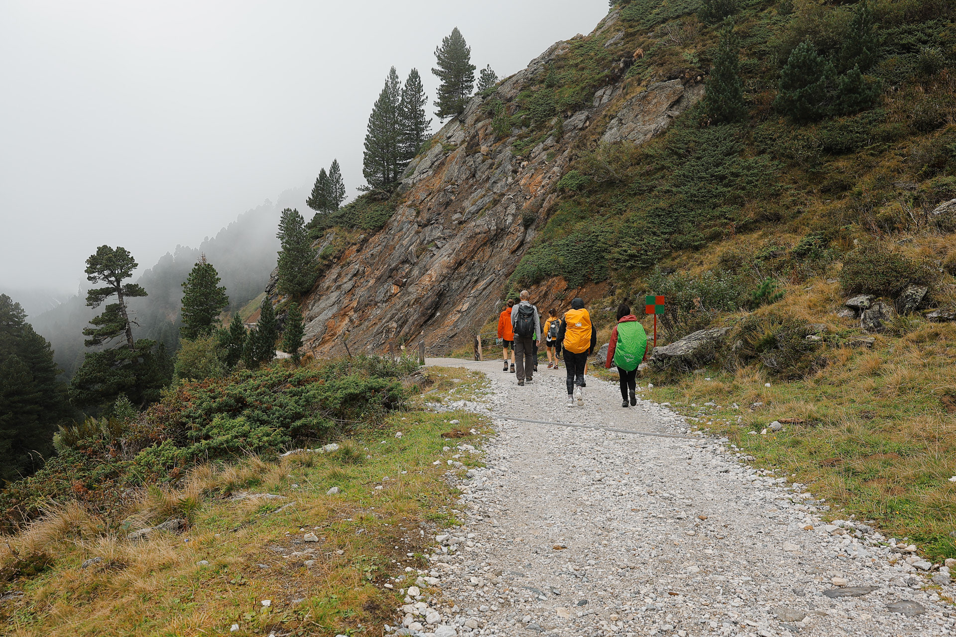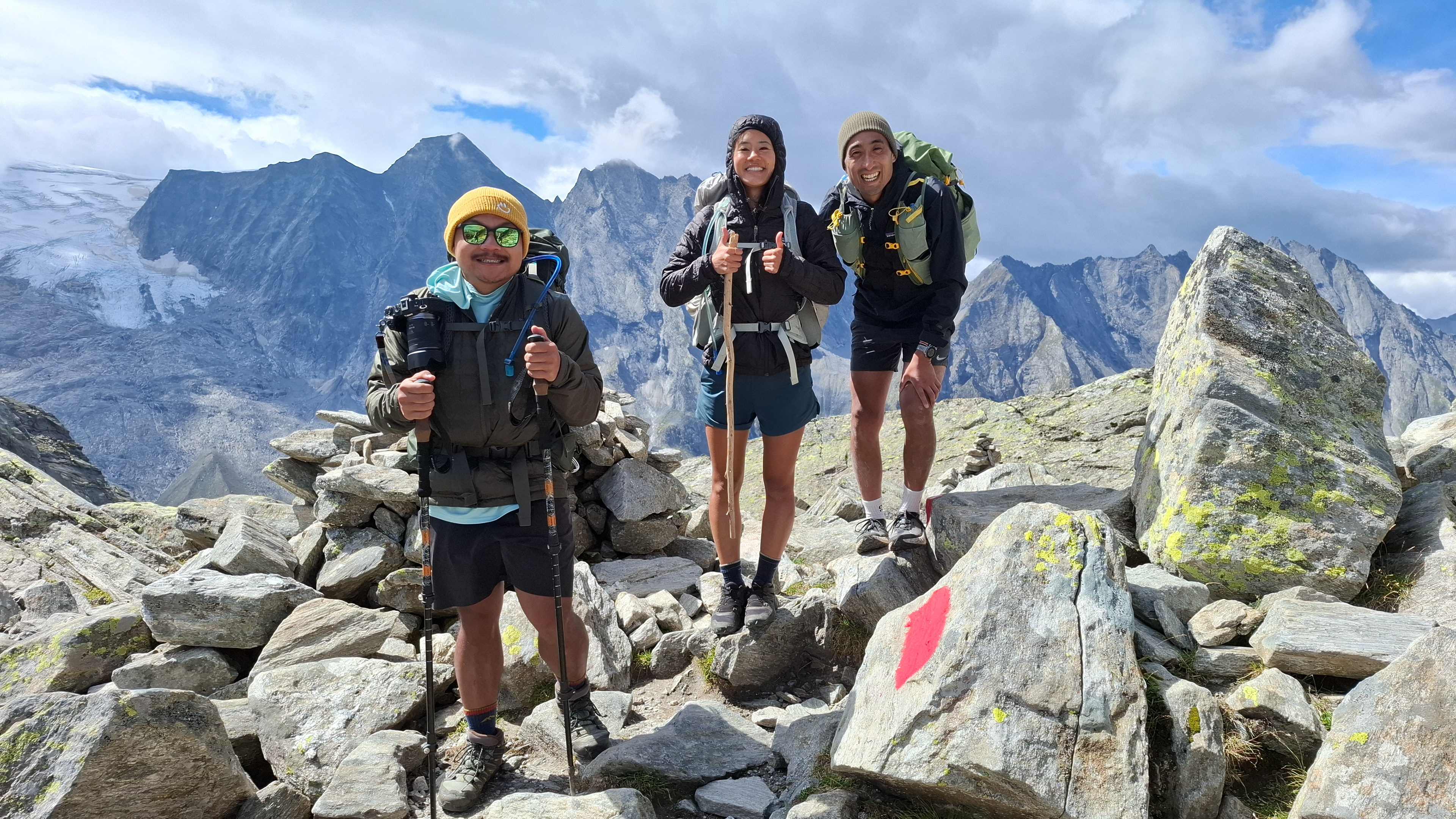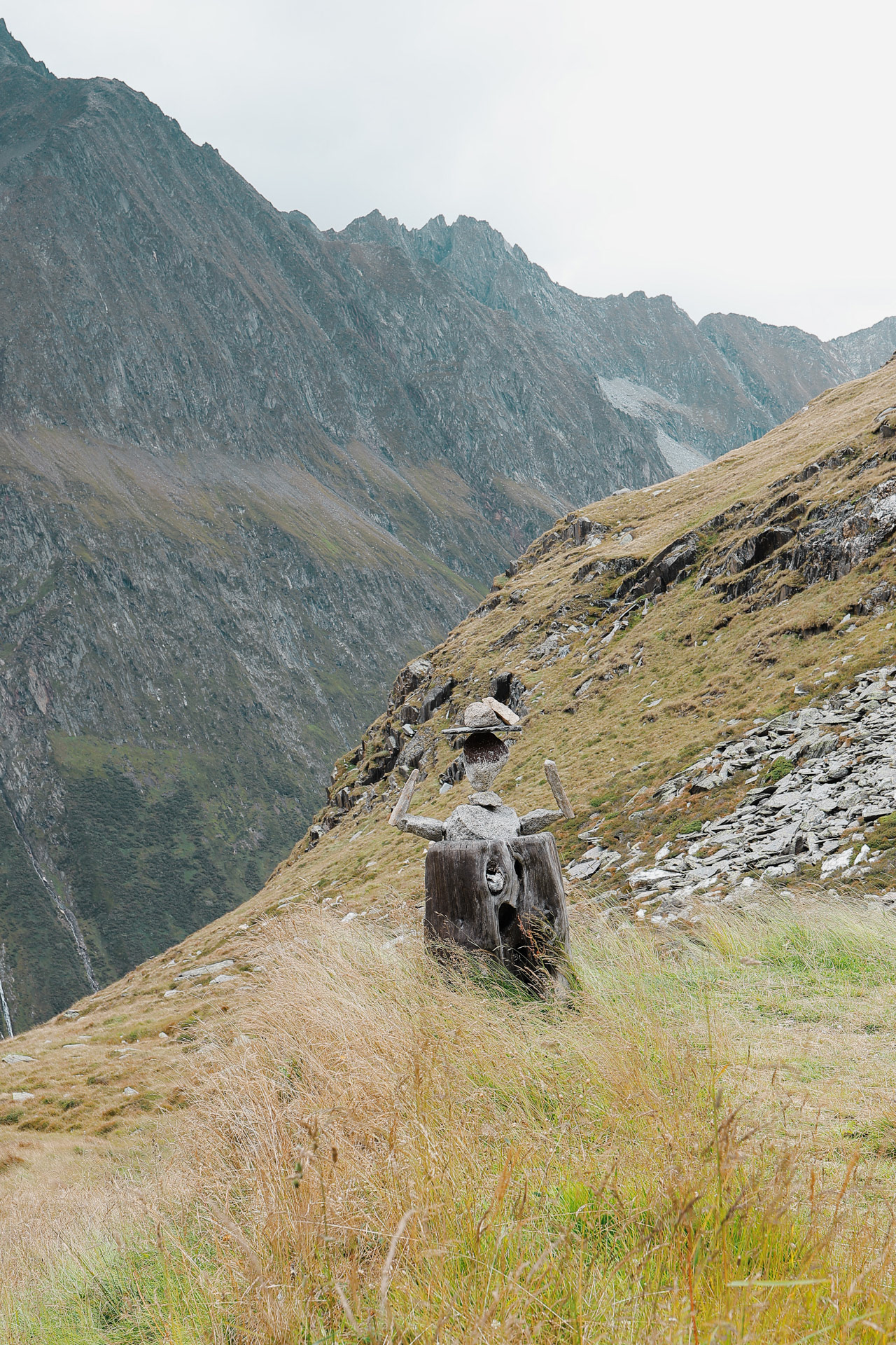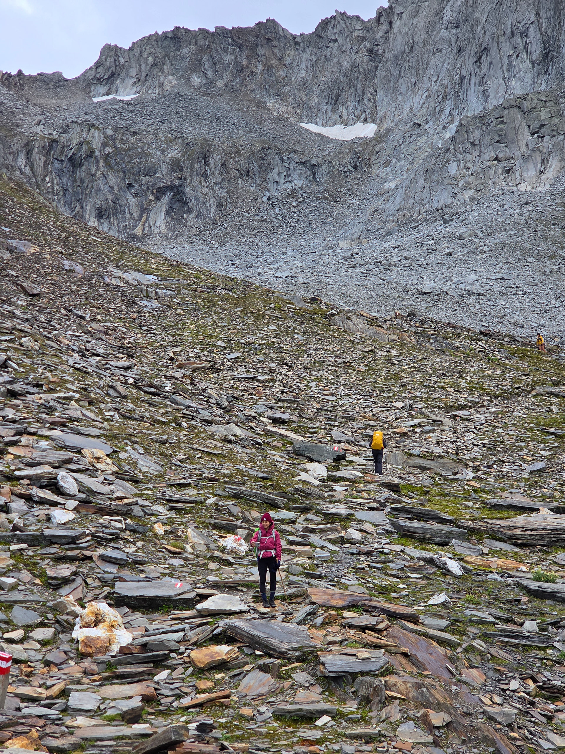 Throughout the trek, there are 2 other kinds of trail markers besides the yellow signs: 1) stone cairns that could be .5 to 4 meters tall 2) red and/or white spray painted markers, oftentimes in the shape of the Austrian flag.