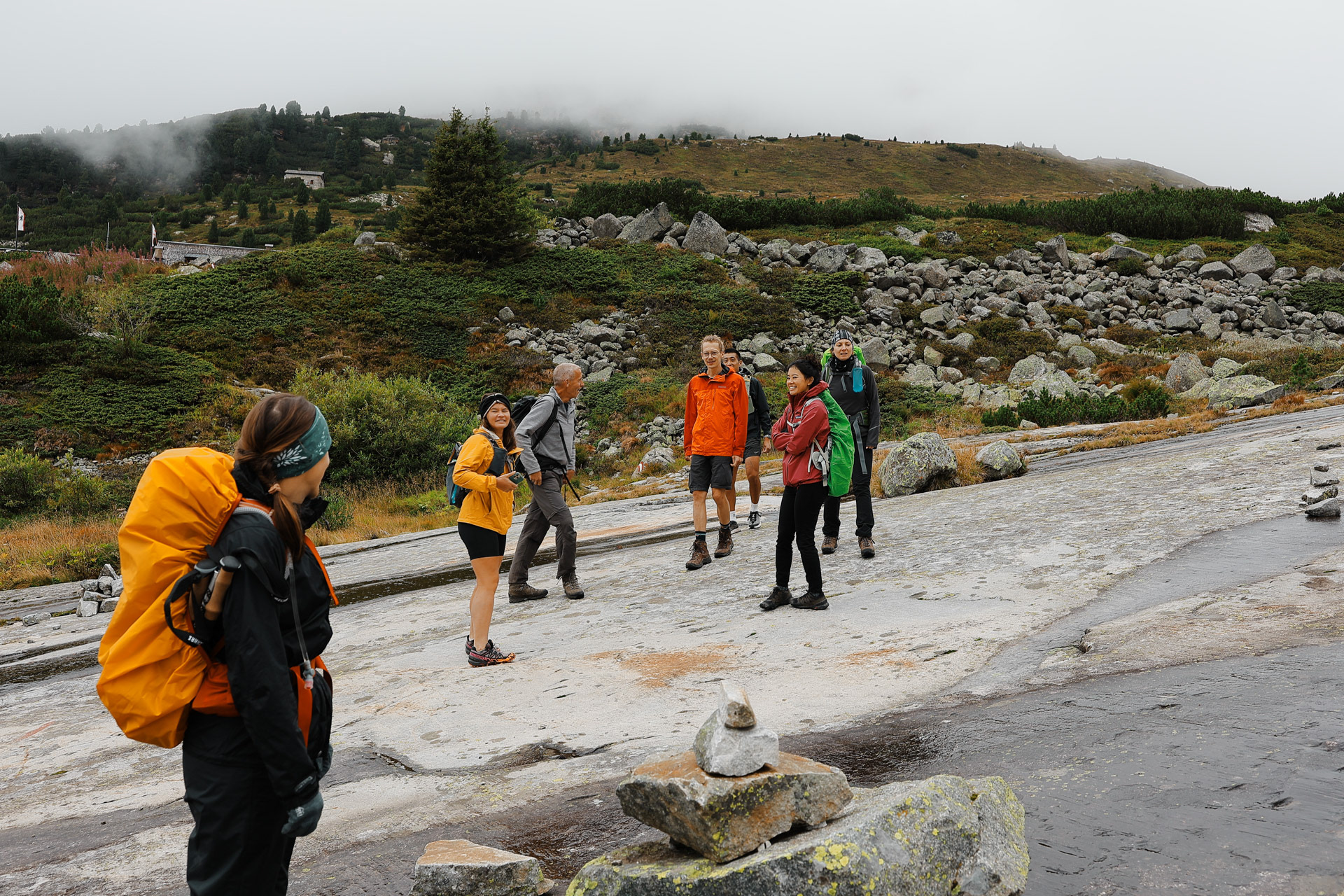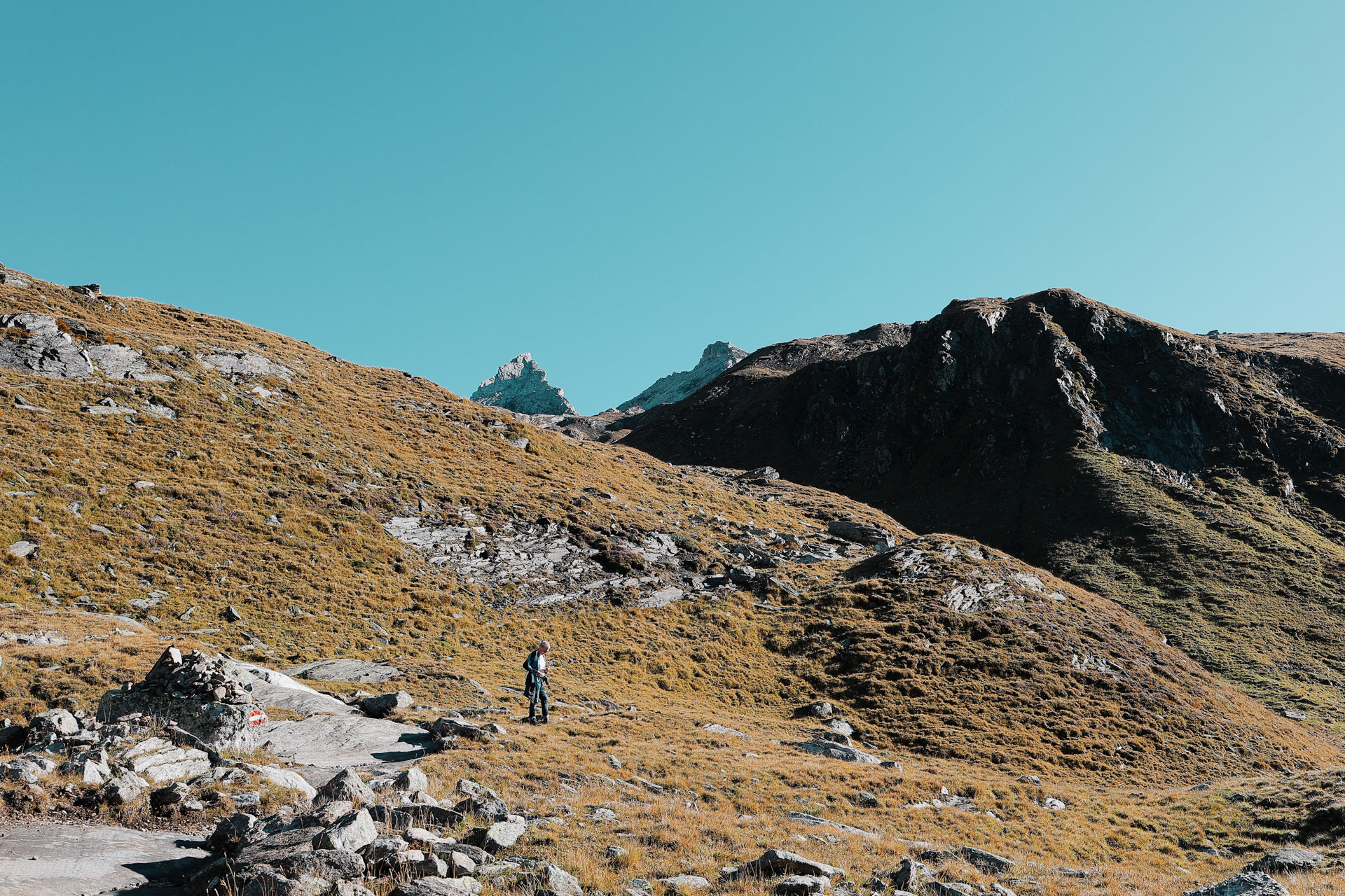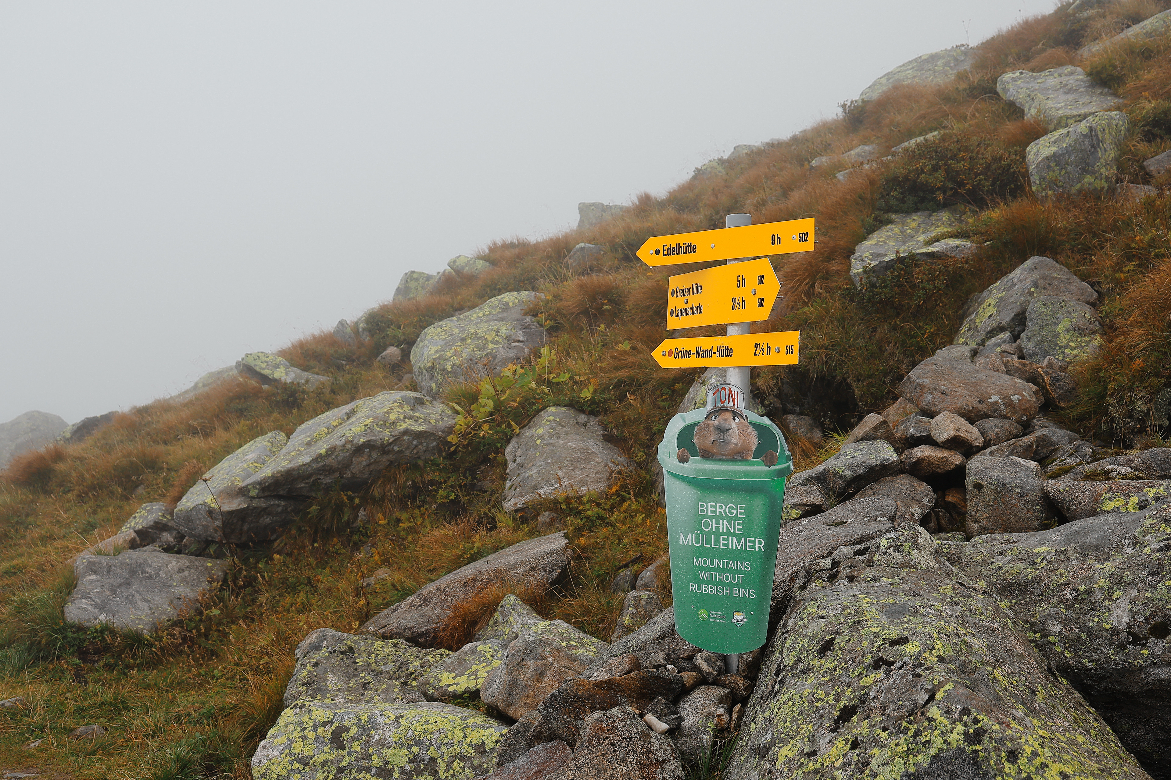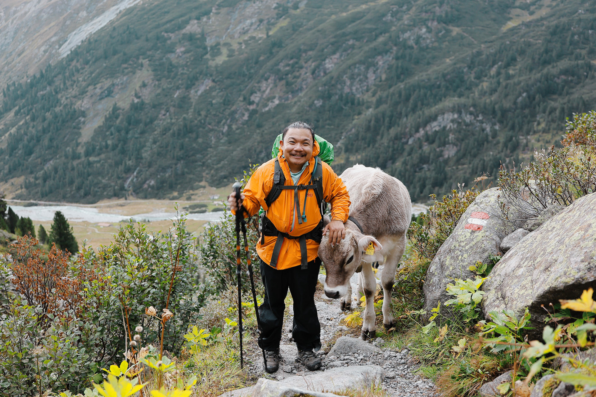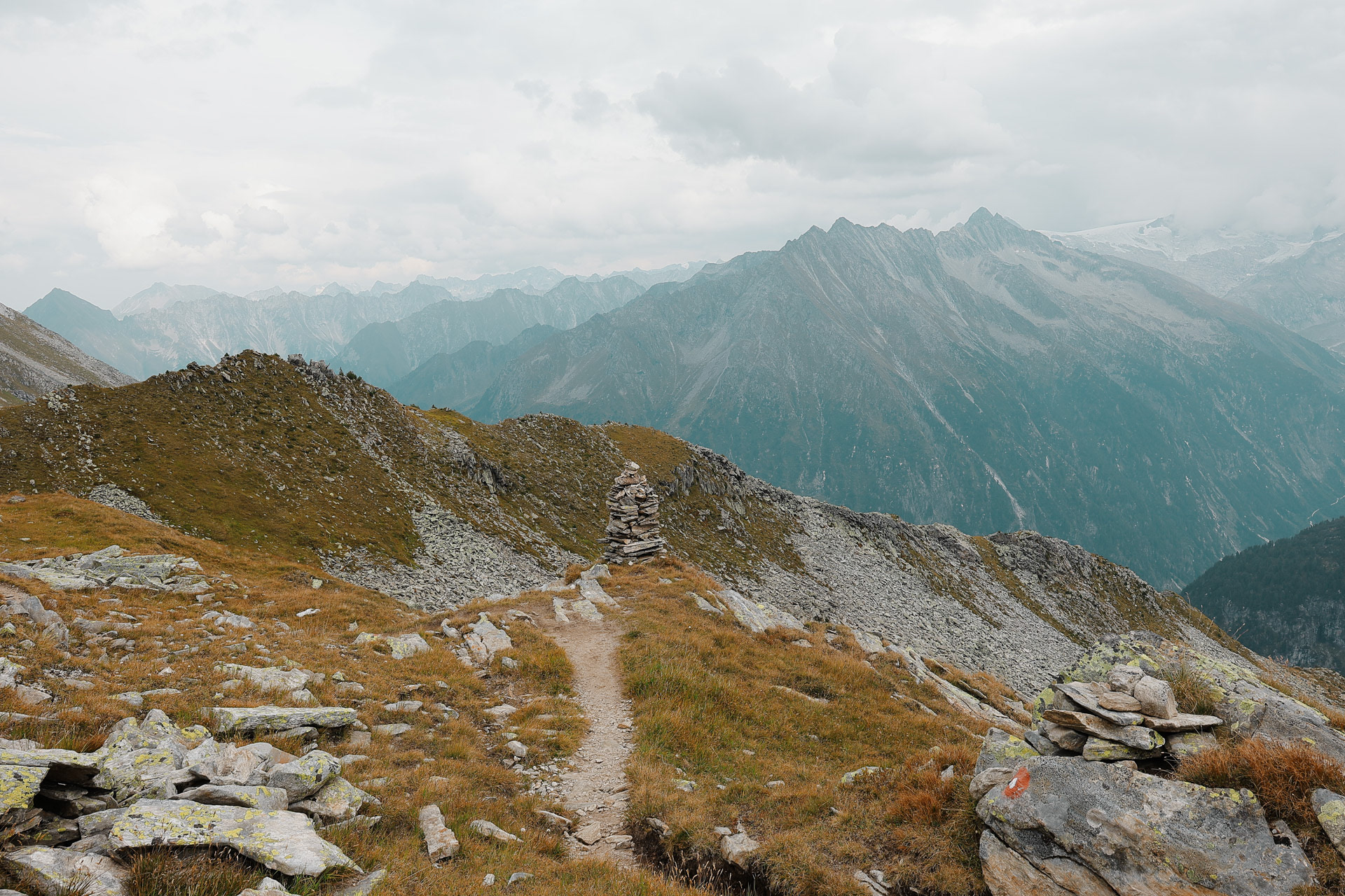 Throughout the trek, there are 2 other kinds of trail markers besides the yellow signs: 1) stone cairns that could be .5 to 4 meters tall 2) red and/or white spray painted markers, oftentimes in the shape of the Austrian flag.
