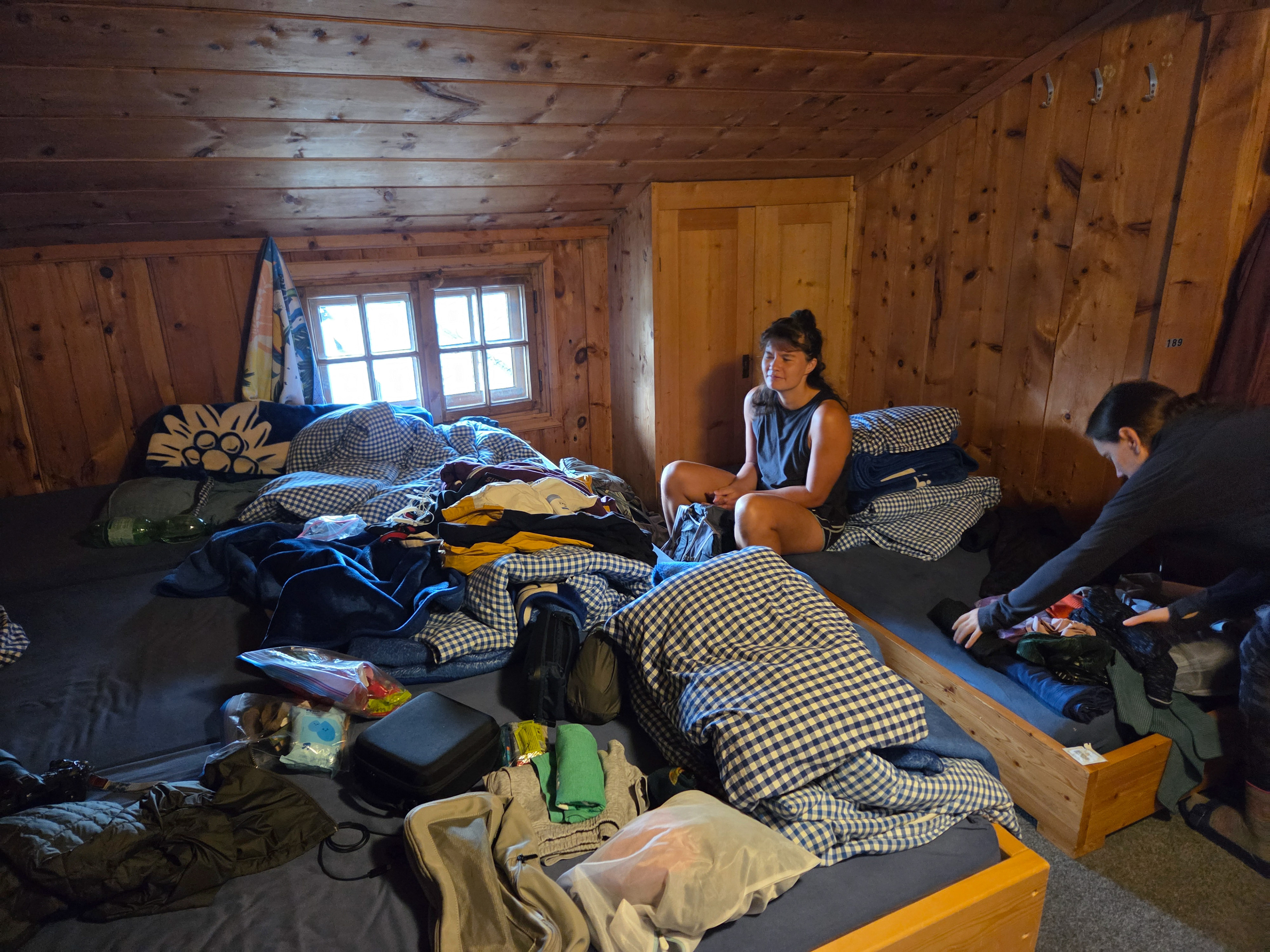 A picture of what a room looks like after we move in. Each hut offers a pillow, 1-3 blankets, and a bed. People are required to bring sleeping bag liners for hygienic purposes. If you don’t use the bedding set directly, they don't have to wash it as often. This is one of the lucky times where we got to stay in mostly one room!