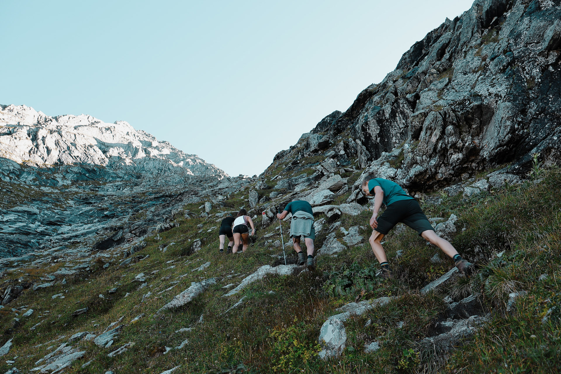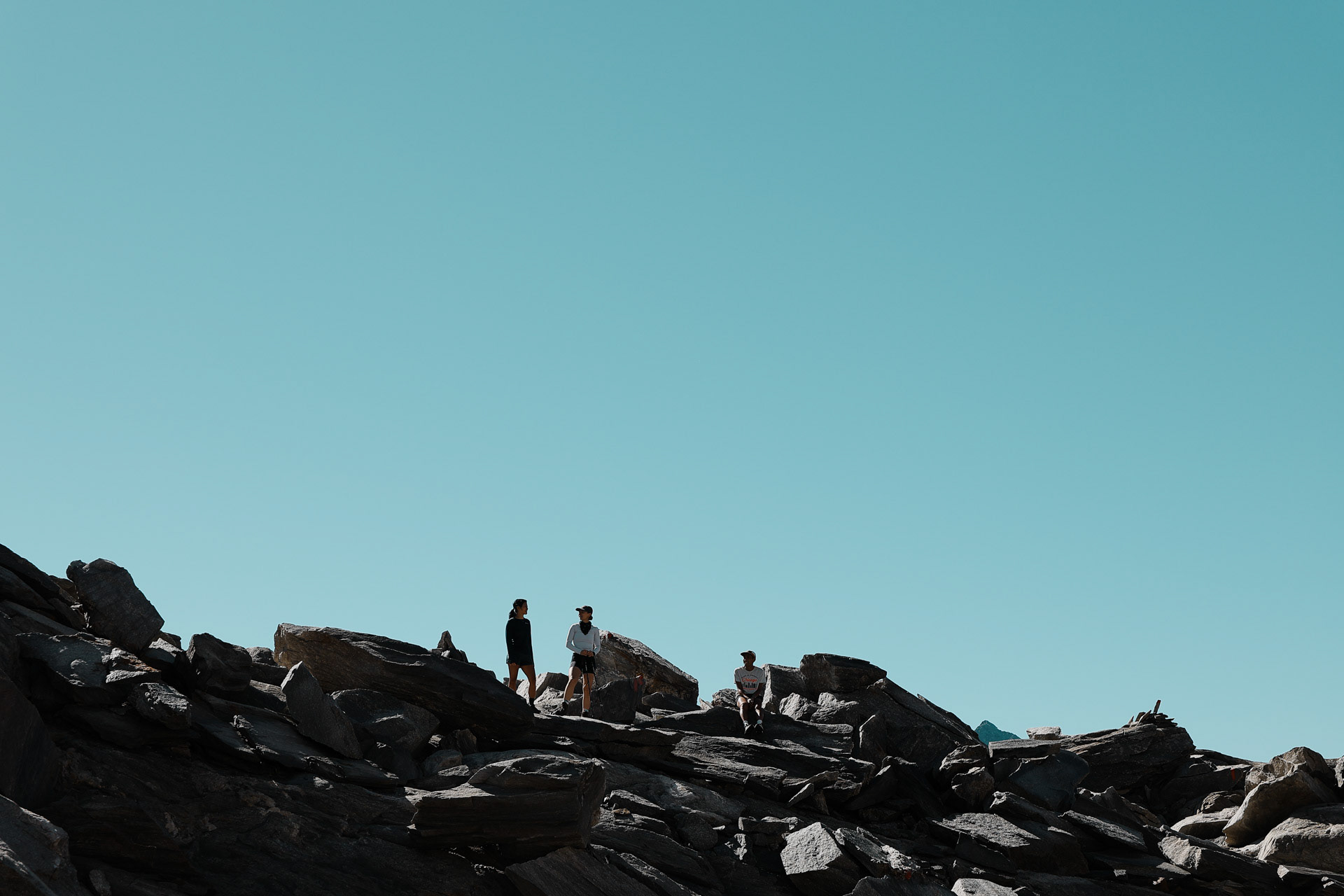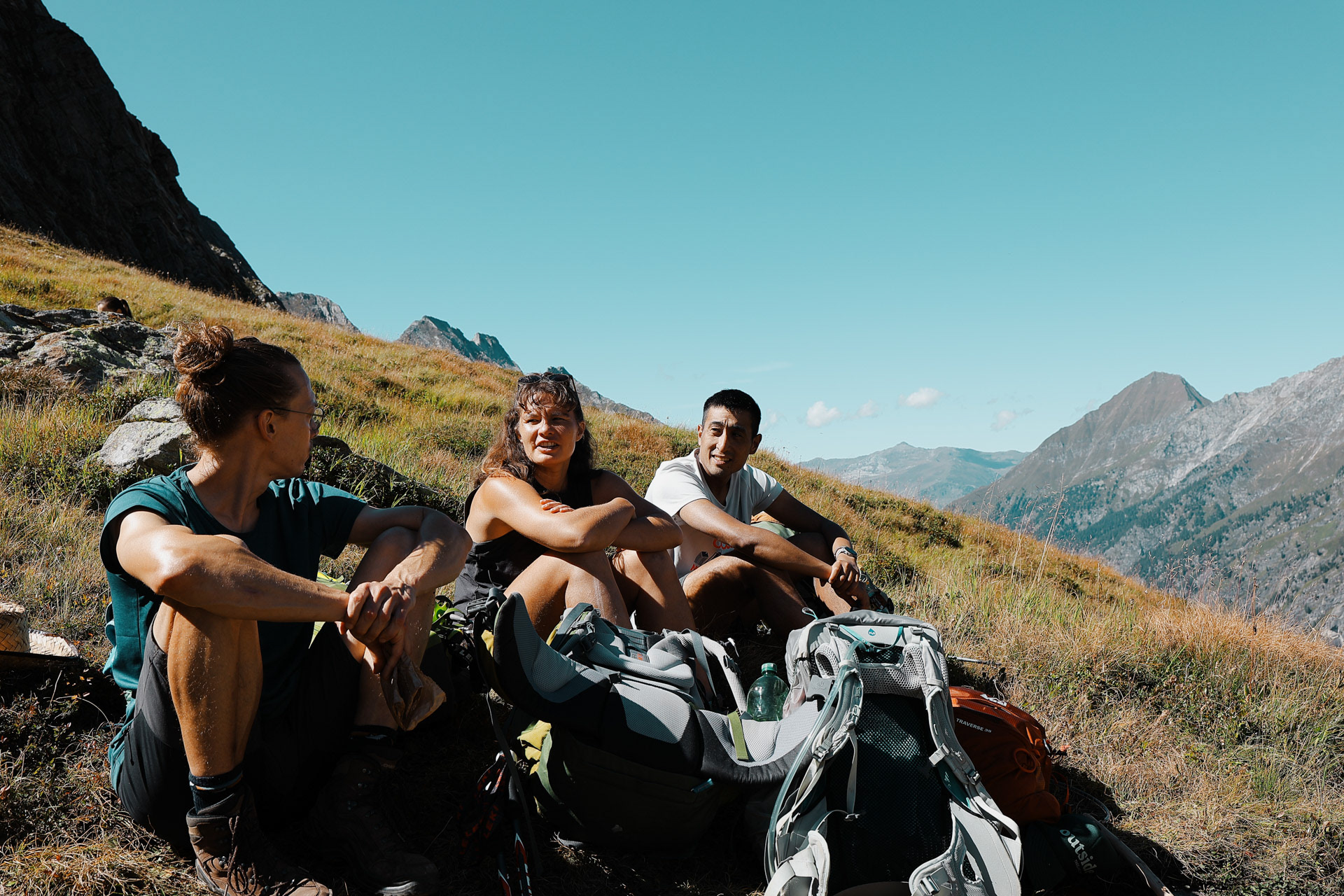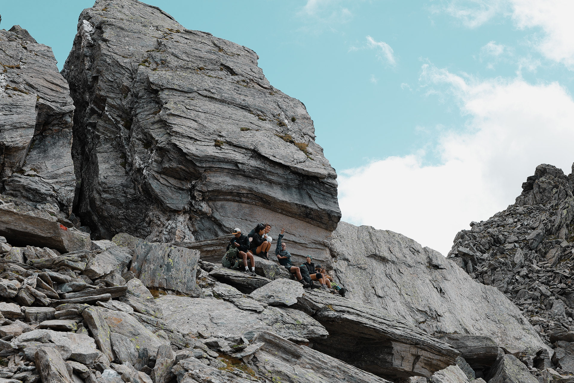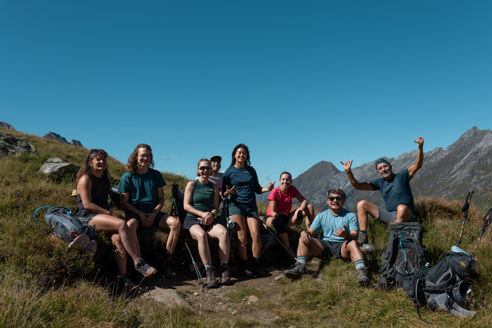 We then meet up with Eva and Einny who have been waiting for us for a while (they were about to leave a note: minus 100 points for all of us who were late). We apologize profusely and start hiking again. We reach the pass and per tradition we take a quick lunch.