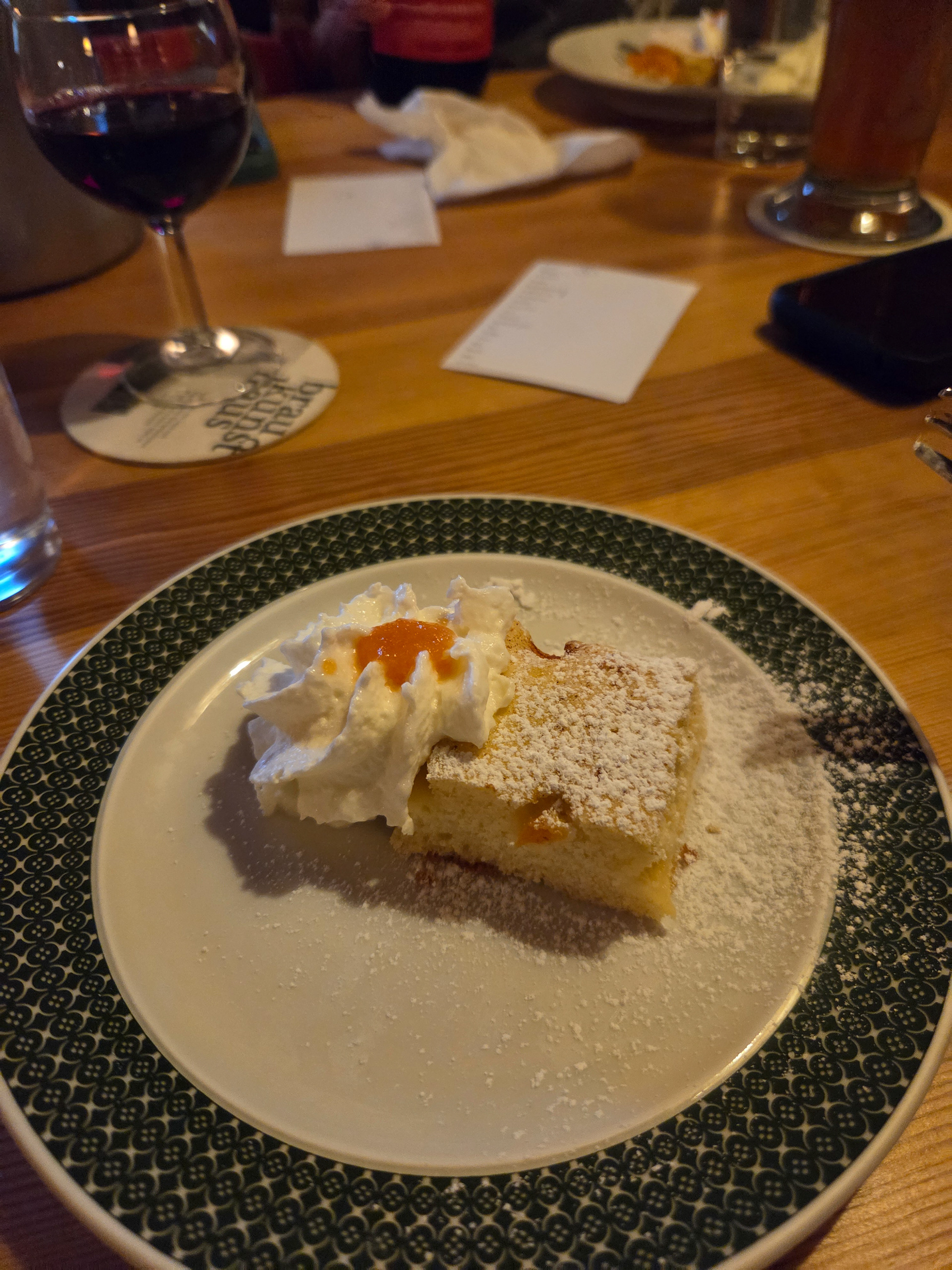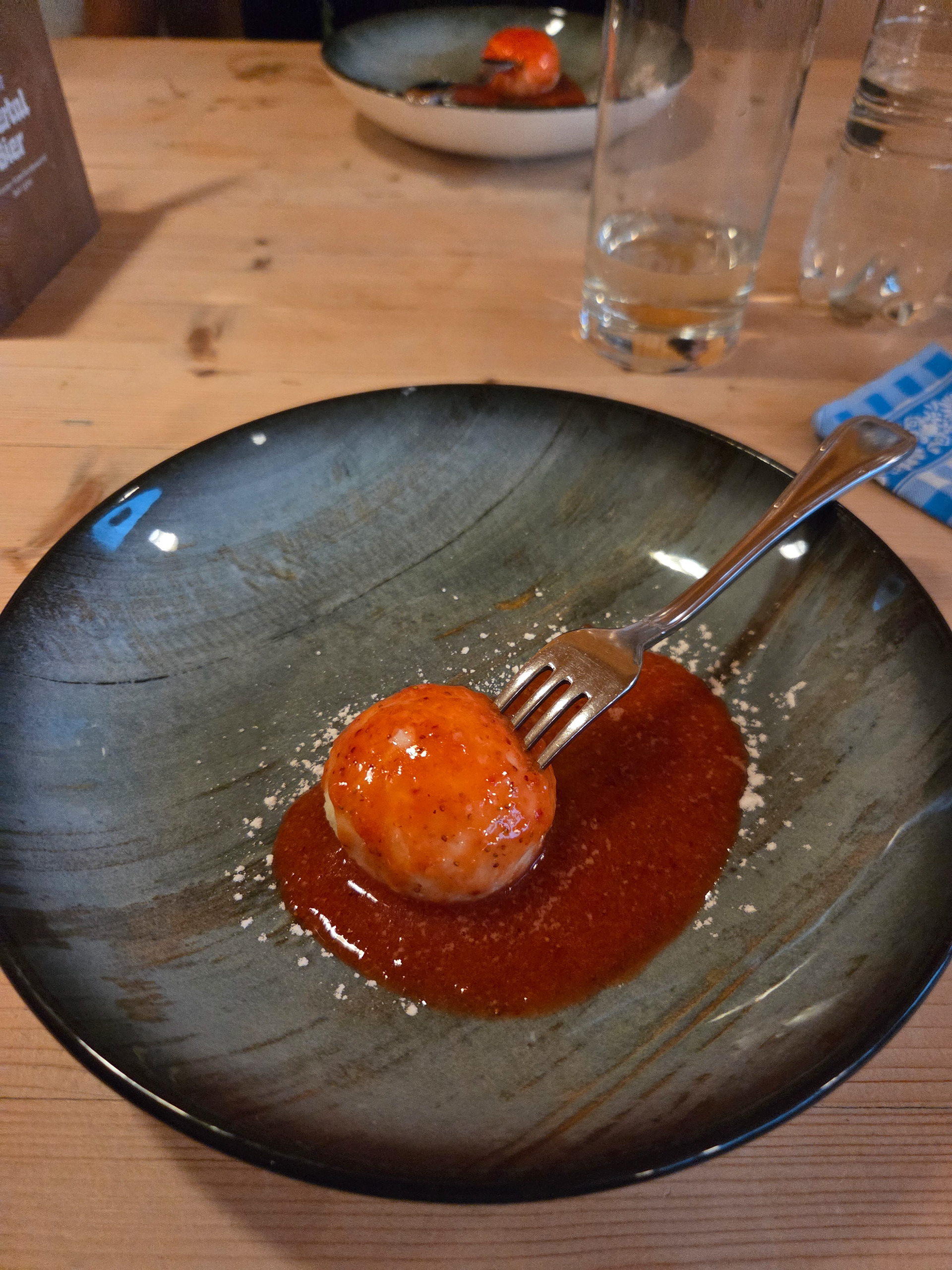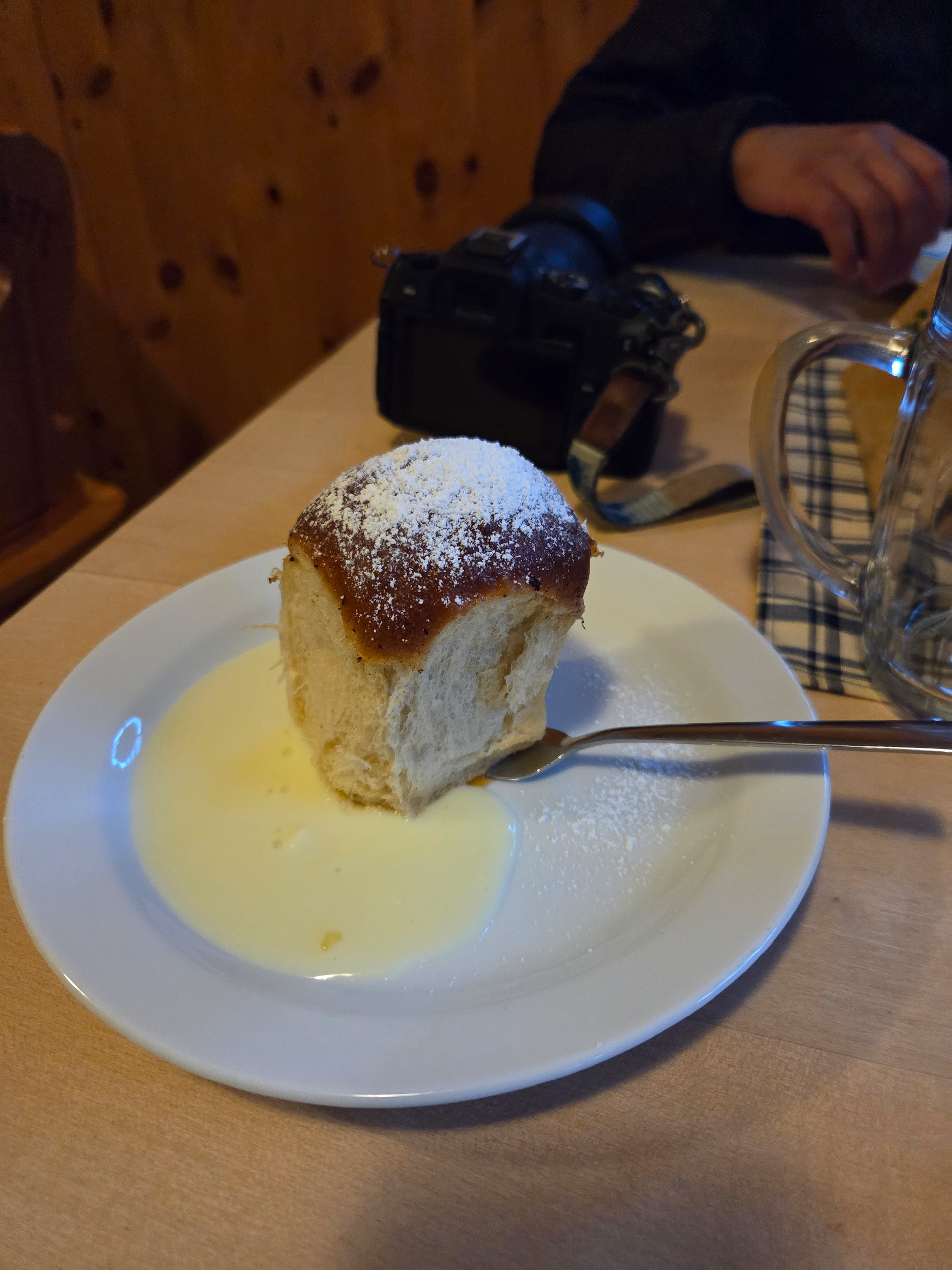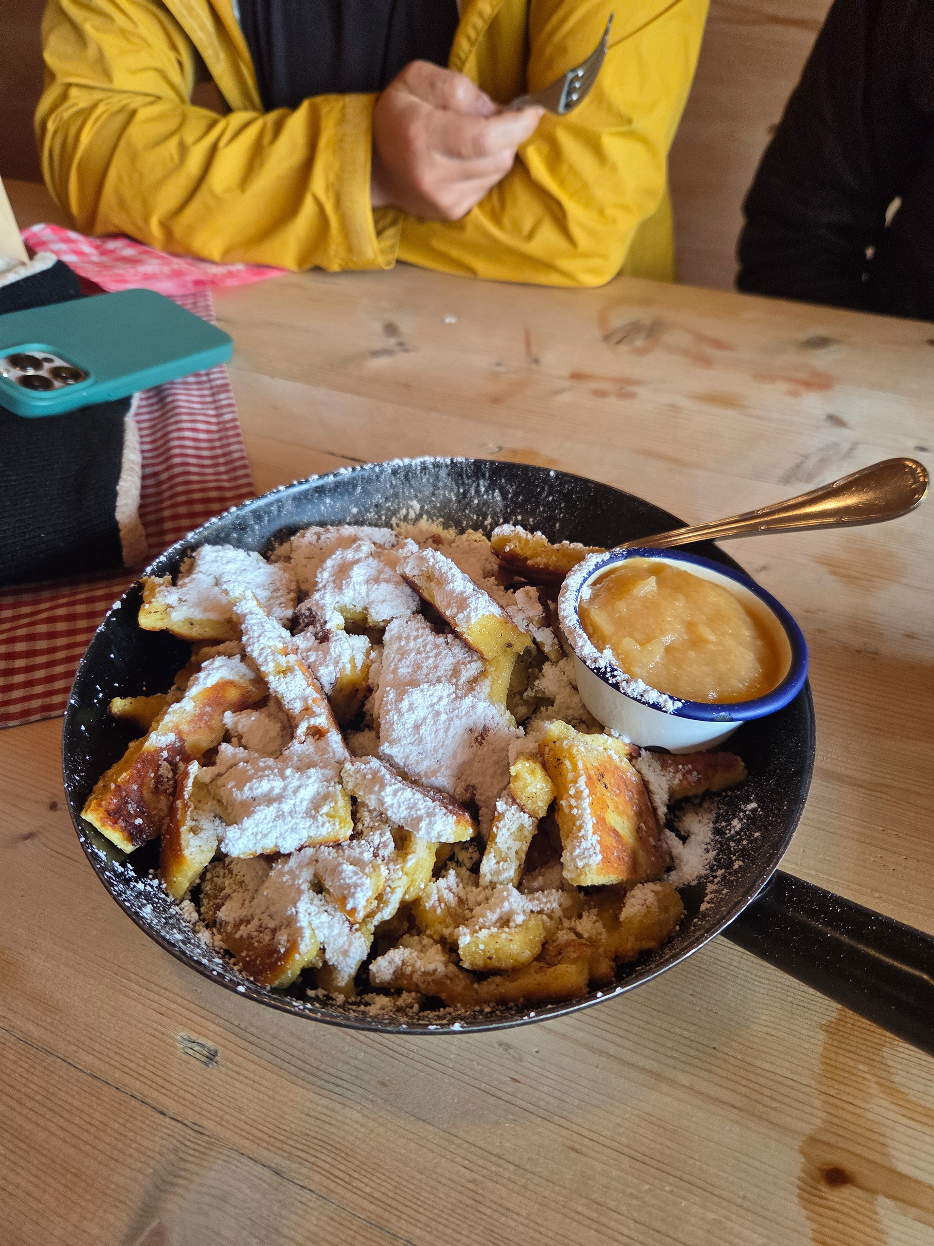 Our first Kaiserschmarrn! It is a pancake type snack/dessert that is fluffy and sometimes filled with fruit (blueberries is common) and also dipped in a sauce (apple is common). This is one of our favorite Austrian dishes. Great to share with friends but also finishable by yourself.
