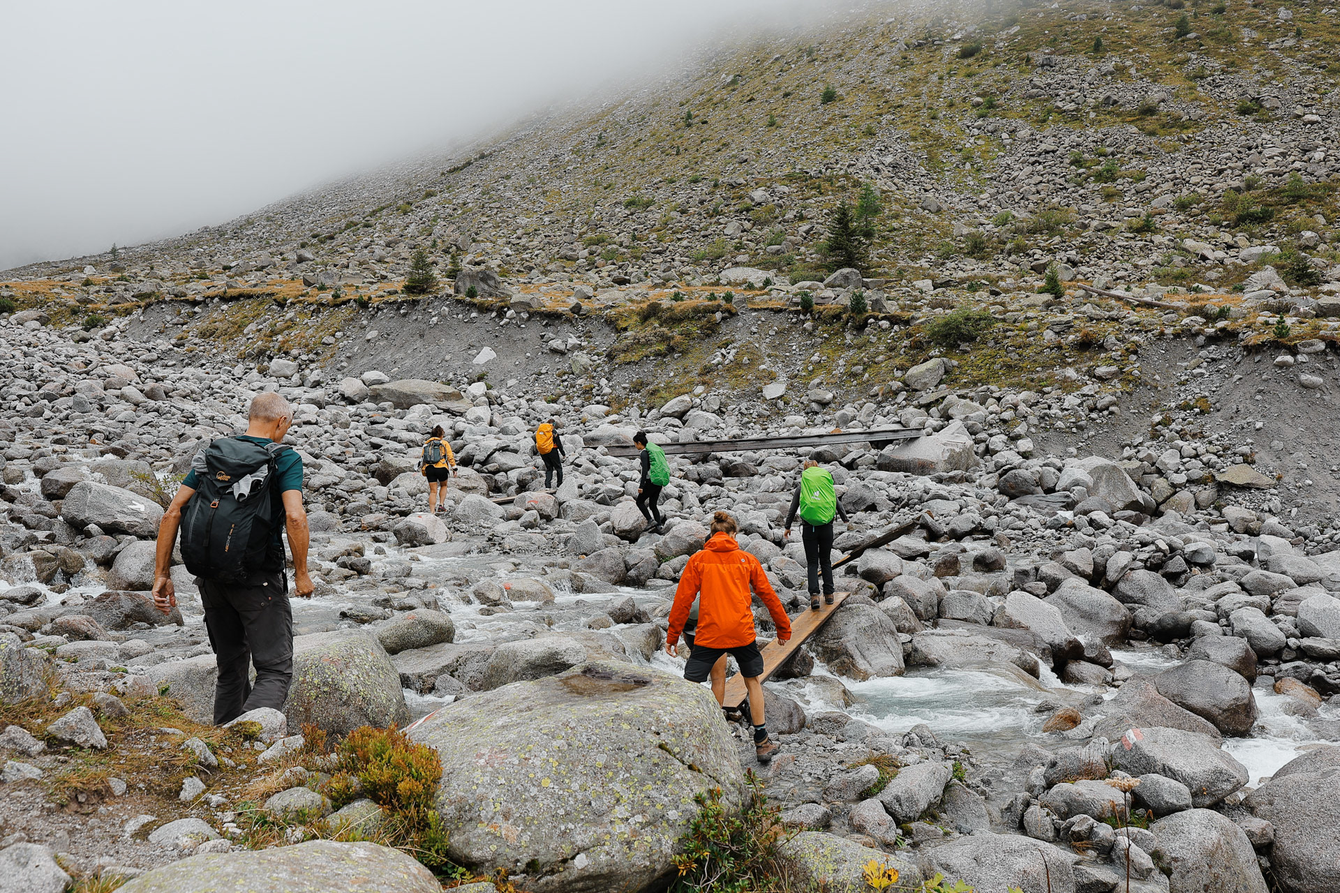 Nearing the back of the valley, Dan and Morgan led the way. This section had a lot of glacier melt-offs. Most of them were going through rocks that we just had to jump over. Until...