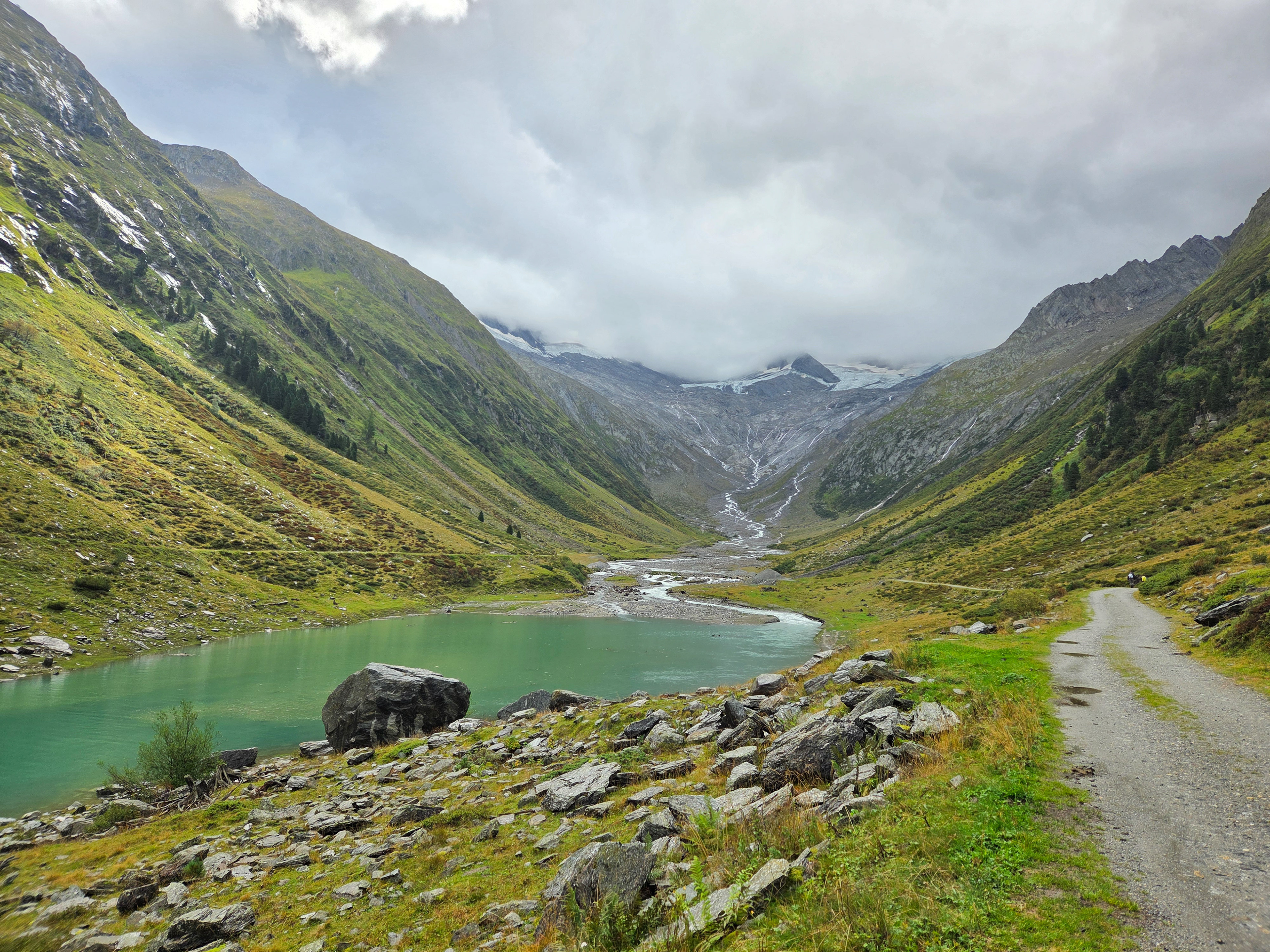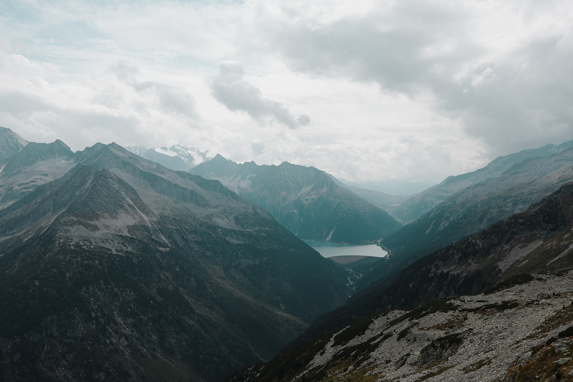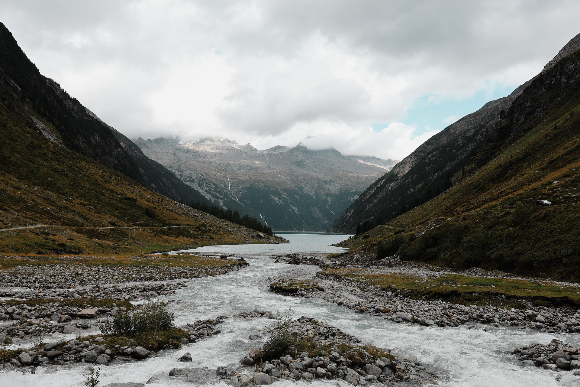 The Stillupertal subvalley. A calm scenery after what we just experienced! Everyone was a little shaken but very glad that everyone was okay. You can see Speicher Stillup or Stillup Lake in the back of this picture.