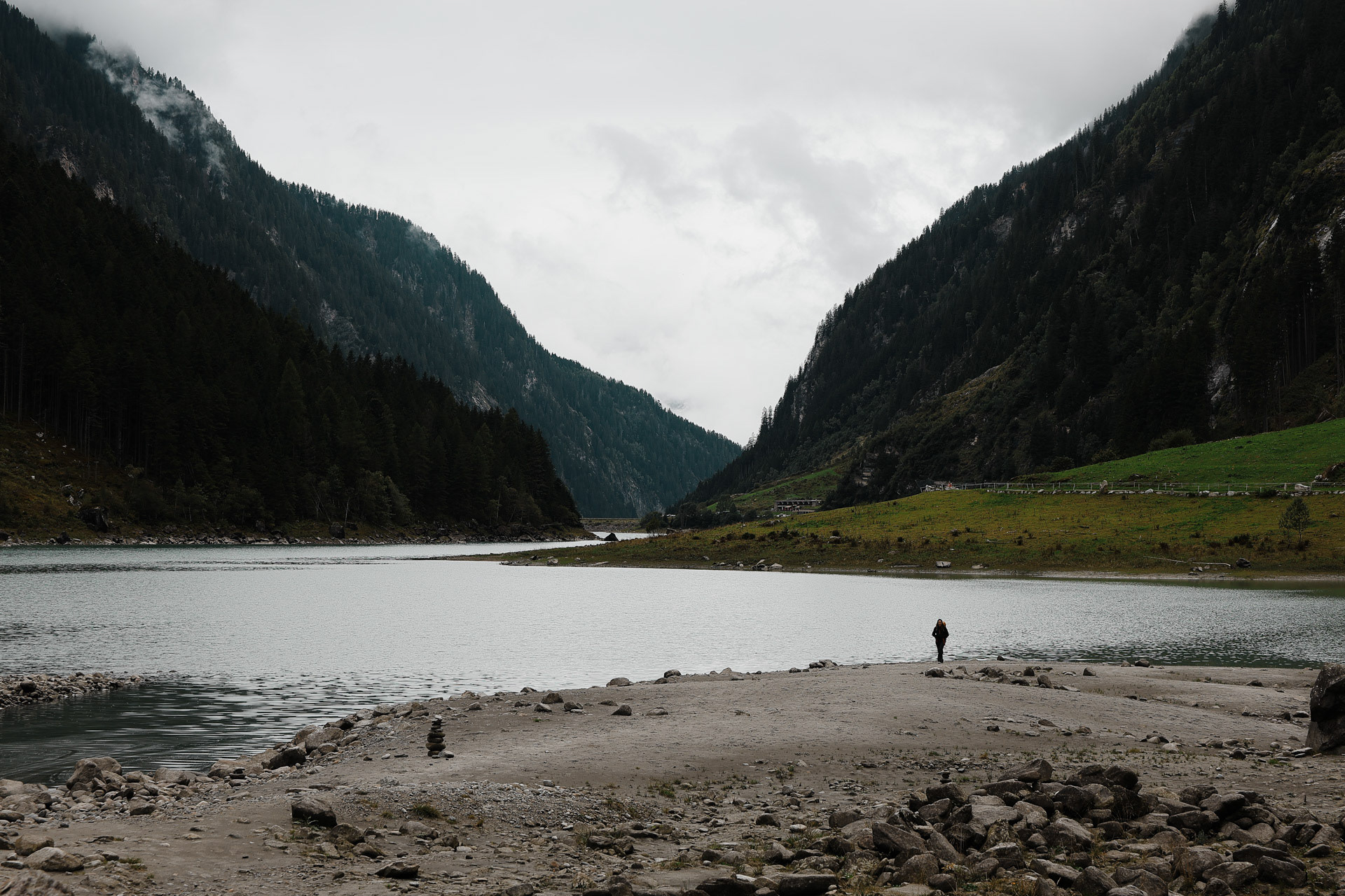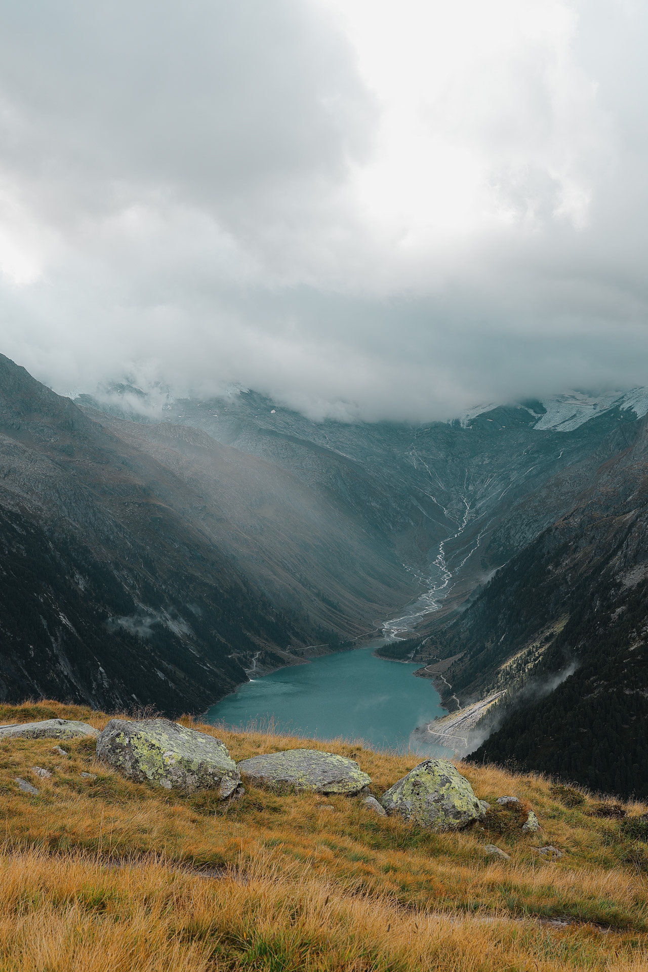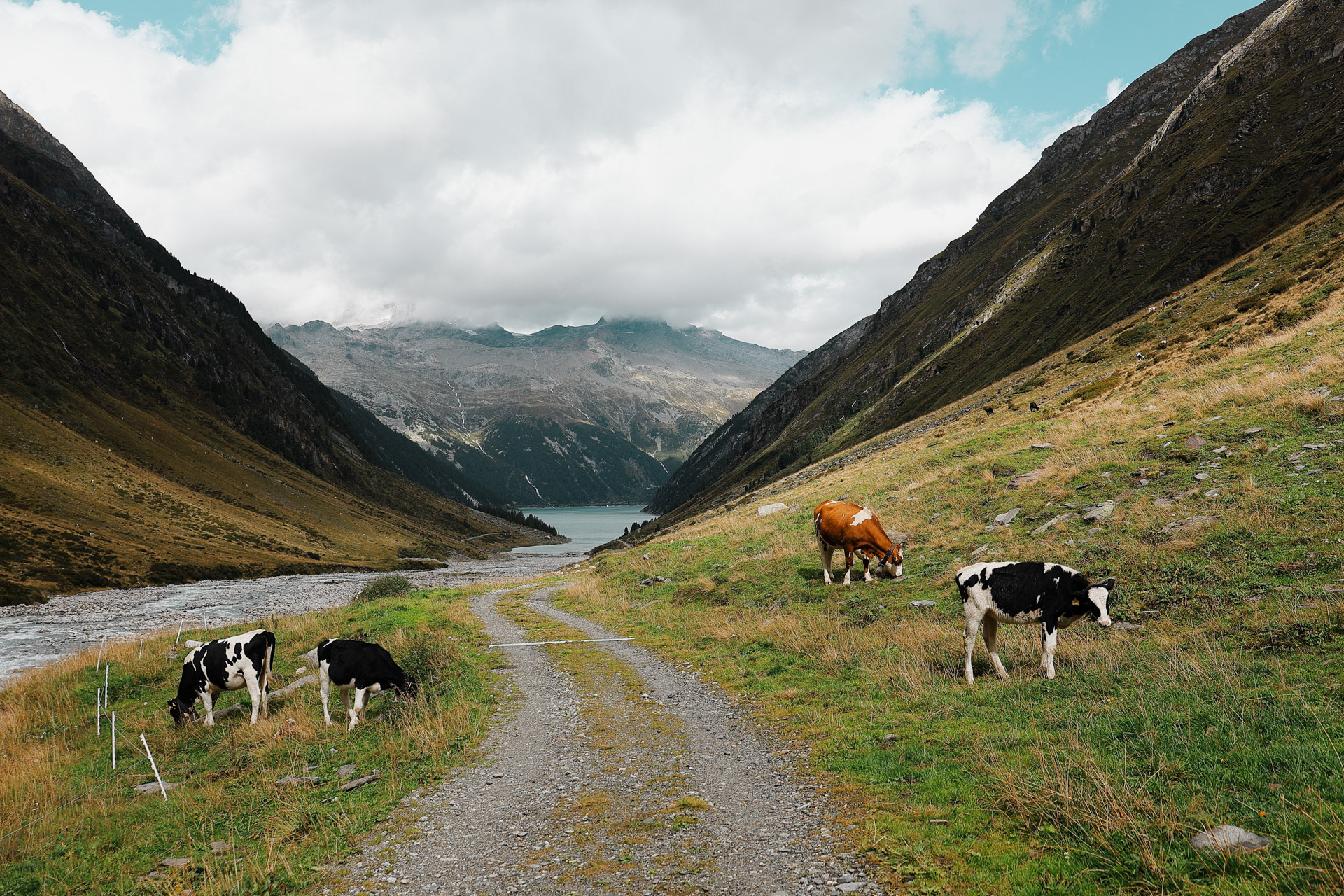 The Stillupertal subvalley. A calm scenery after what we just experienced! Everyone was a little shaken but very glad that everyone was okay. You can see Speicher Stillup or Stillup Lake in the back of this picture.