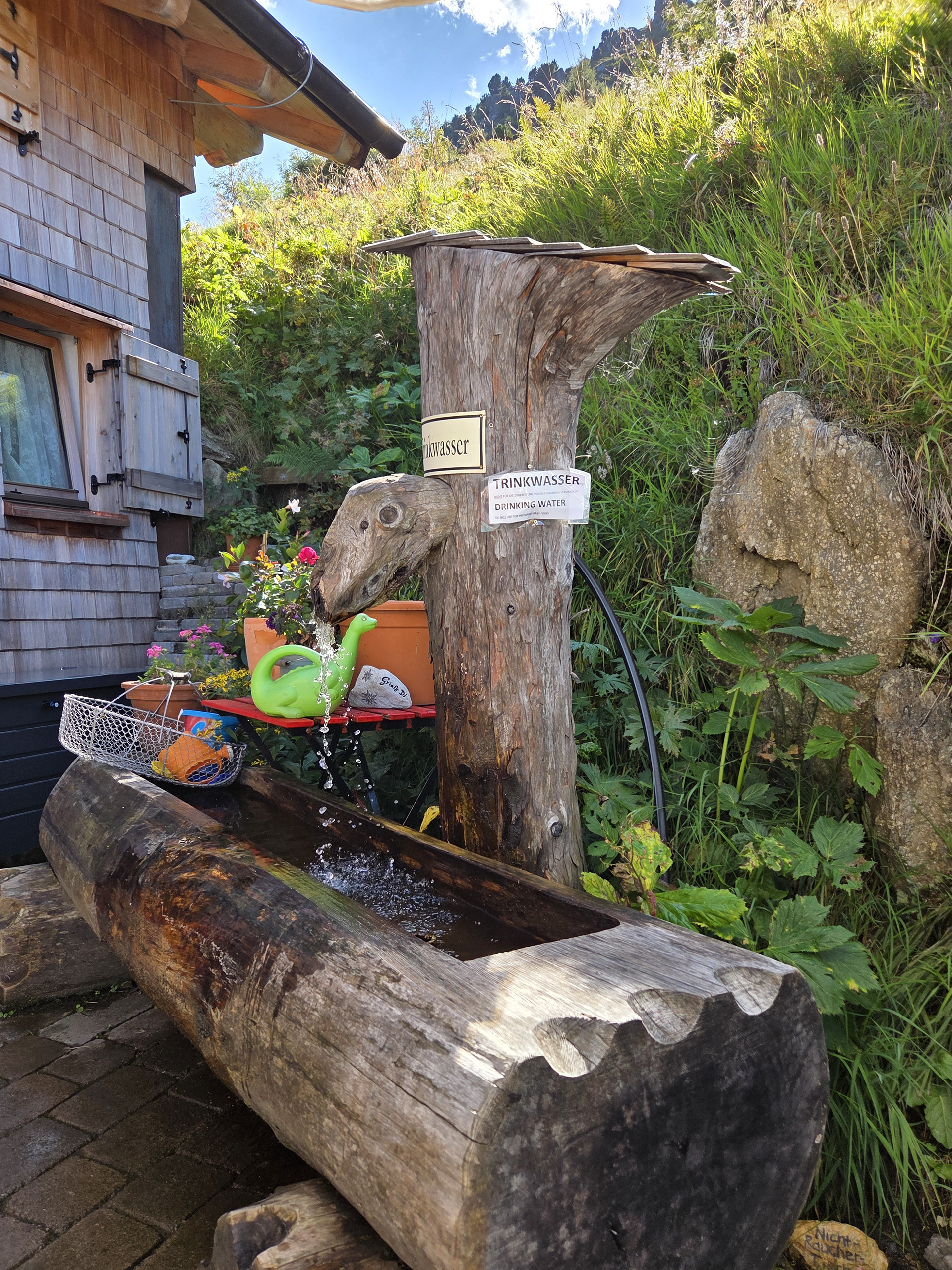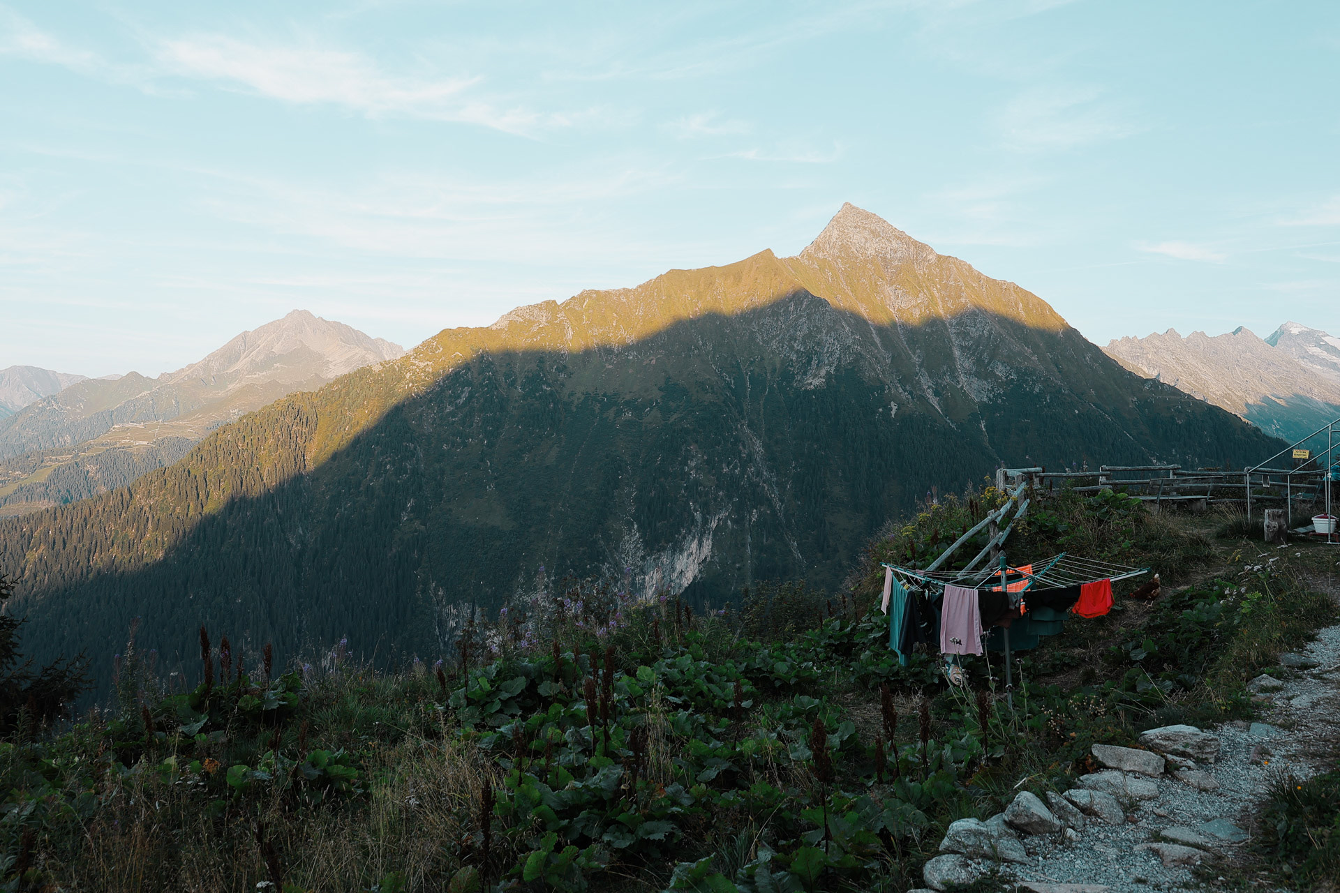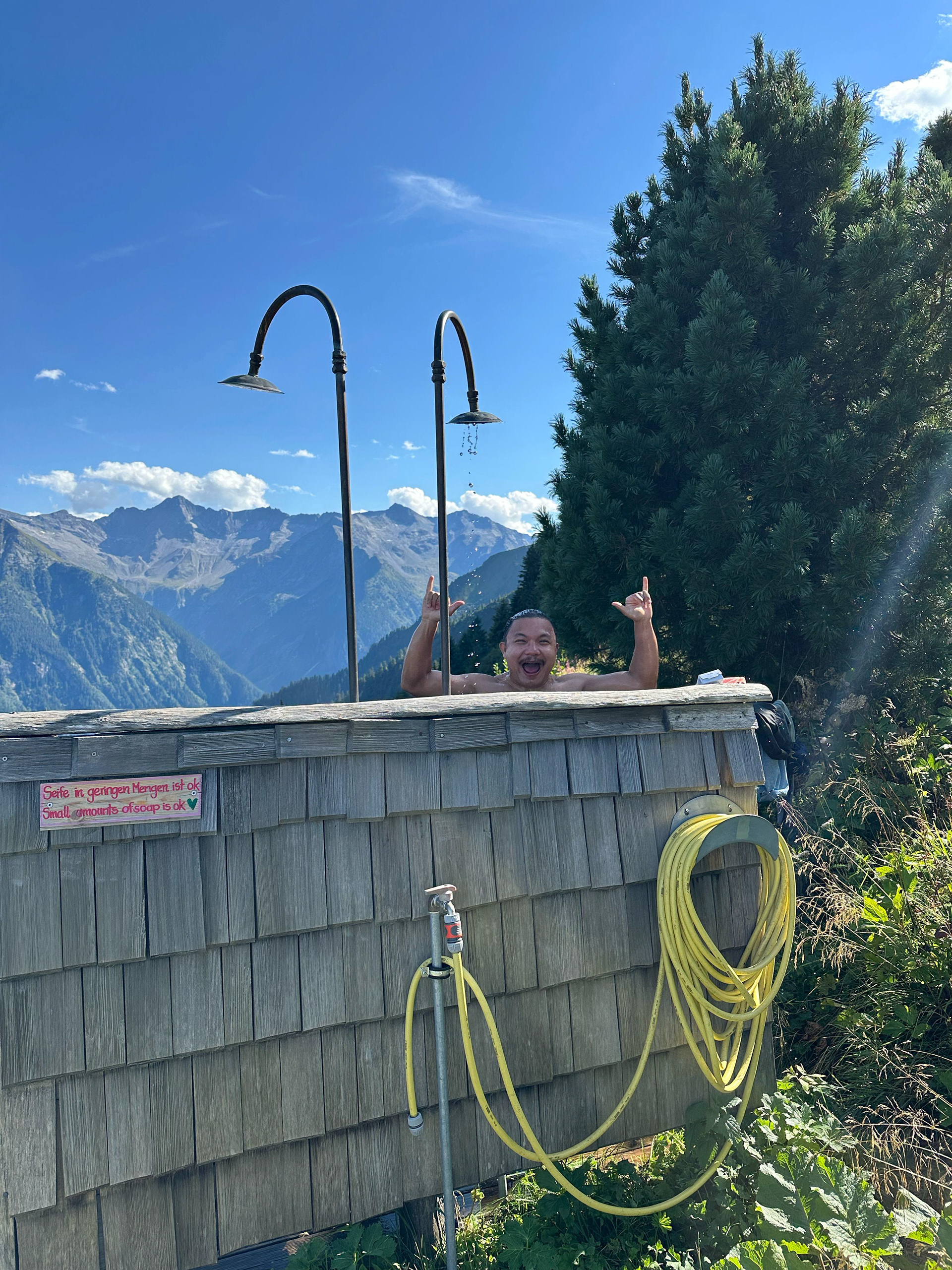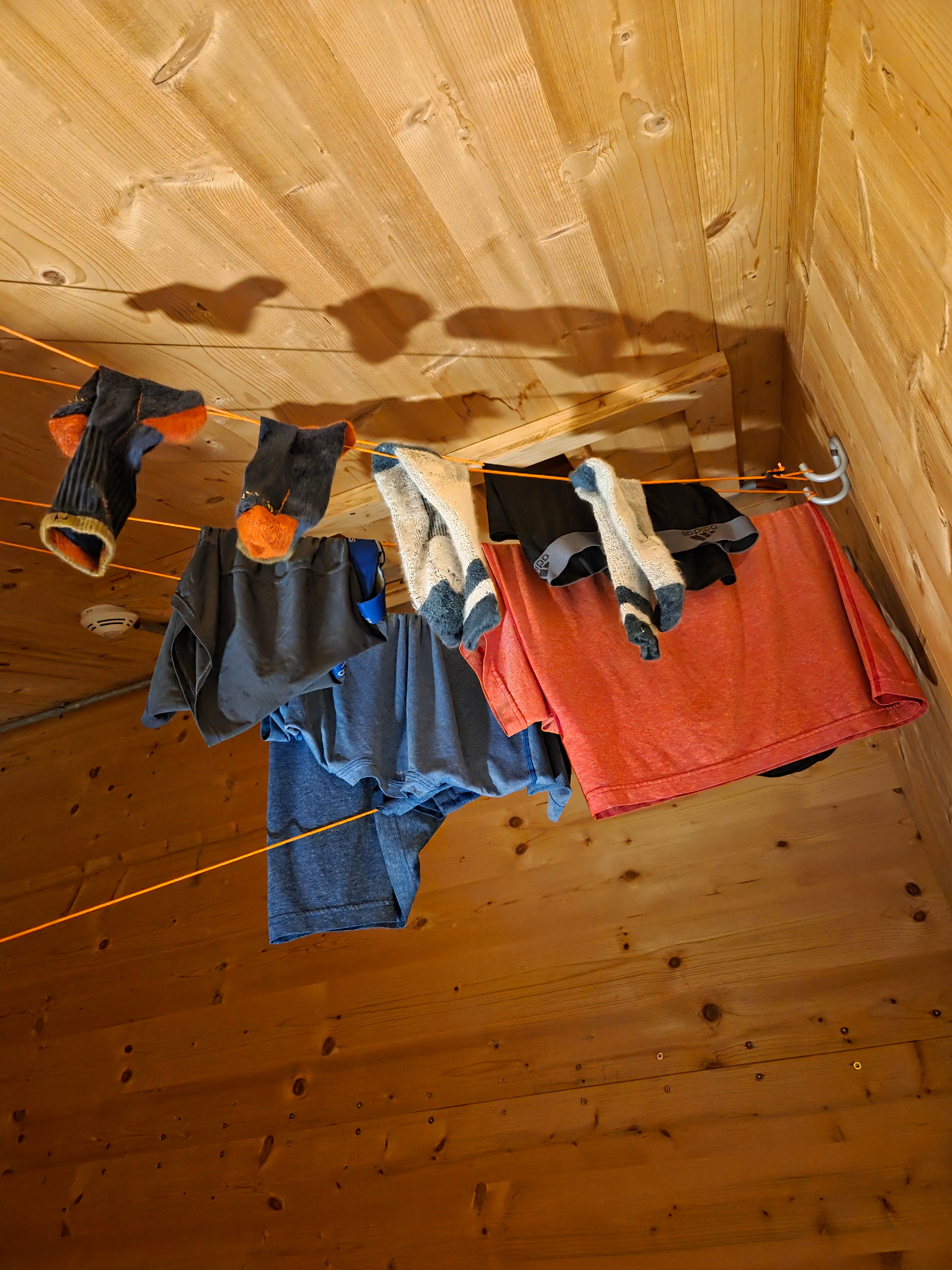 There are no washing machines on this trail. Everyone hand washes clothes and the huts have places for wet objects to hang drying. Gamshütte’s lines were outside but fancier huts had climate controlled drying rooms.
