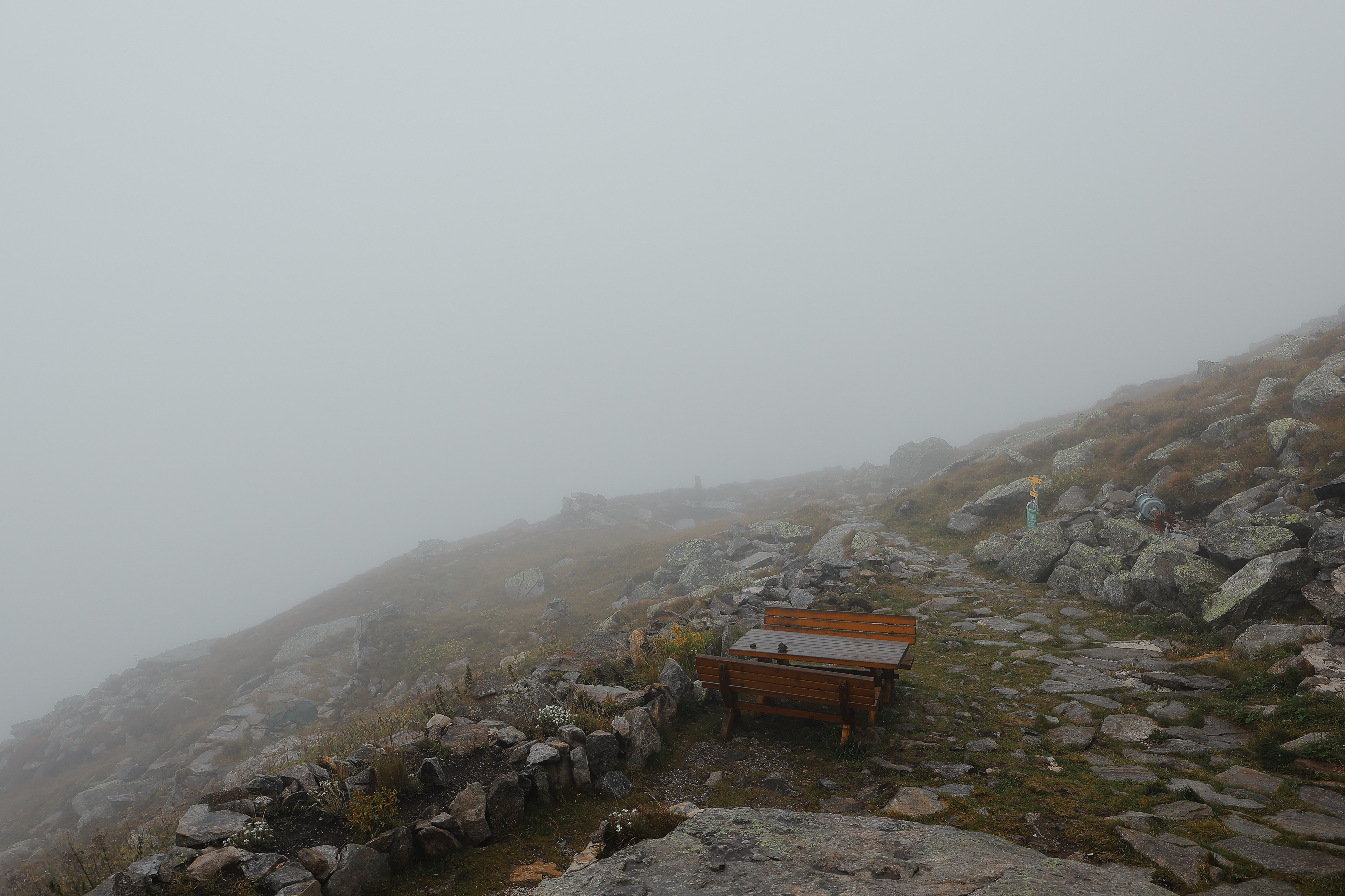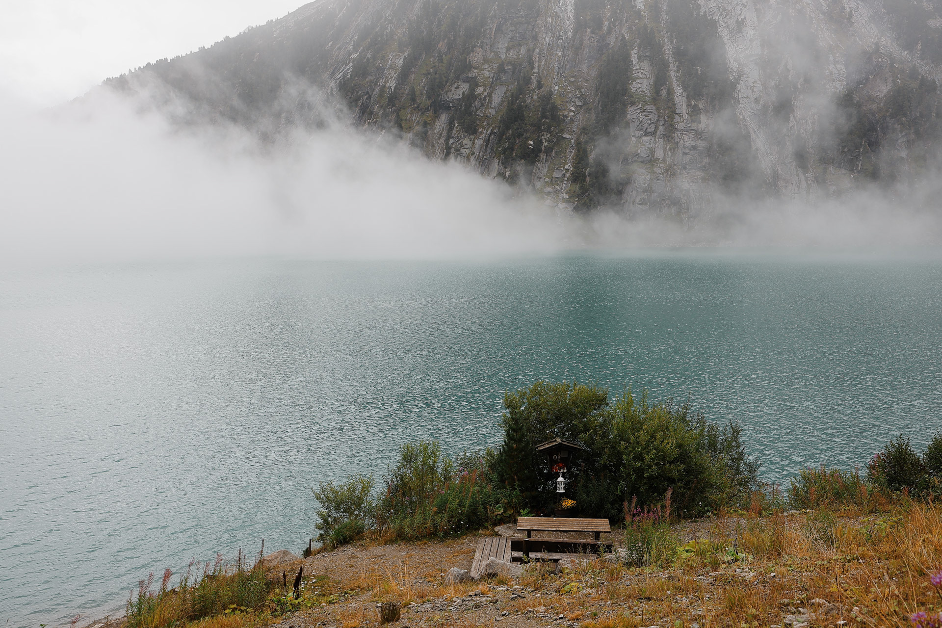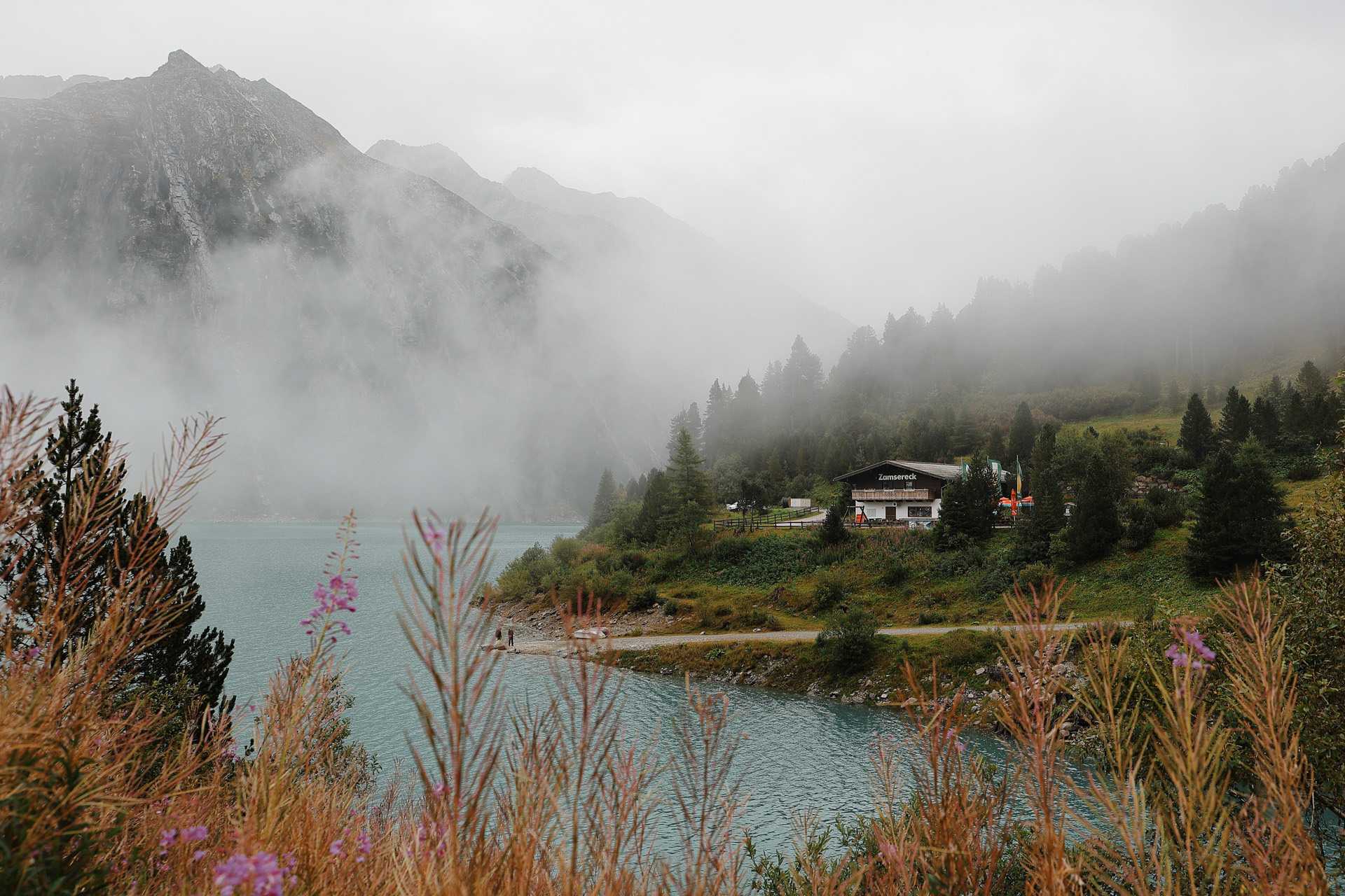 Fog and clouds in the back, a couple at the dock, fireweed in the foreground, and Zamsereck, a restaurant in the middle. I was surprised that there were not more people at the Schlegeisspeicher since the bus was so packed on Day 1 but perhaps the rain and clouds dissuaded them. We had no choice though.