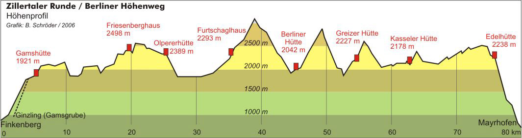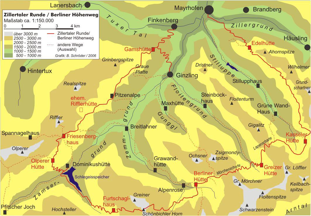 The Ziller valley has a bunch of subvalleys. We hiked through Zamsergrund, Zemmgrund, Floitengrund, and Stilluppe. Though the main route are the thick red lines, there are ways of getting to and from the huts through the valleys. If there was a minor accident (anything not needing airlift), anyone can get off the trail and head down from the valley and and get on a bus to get back to society.