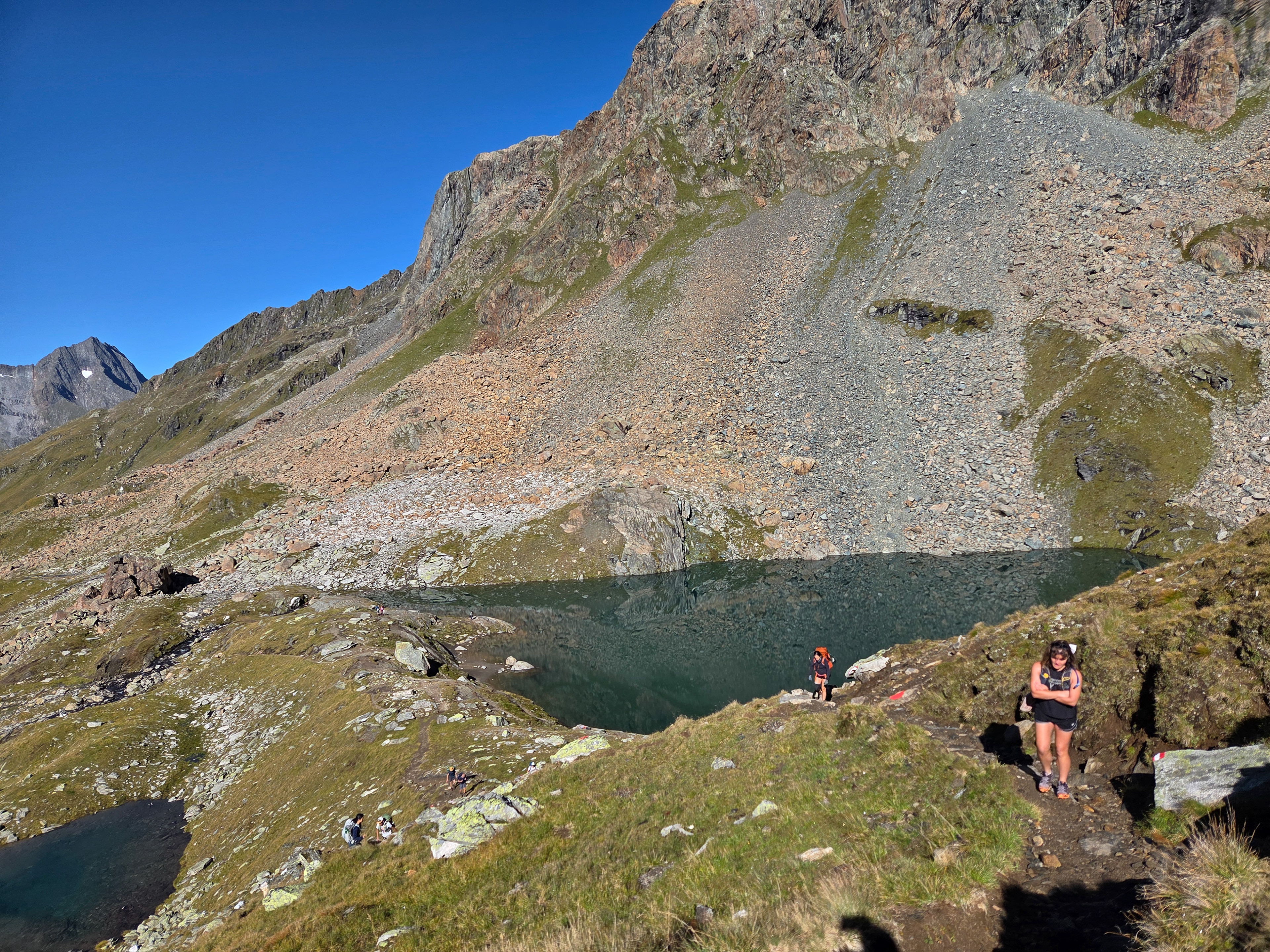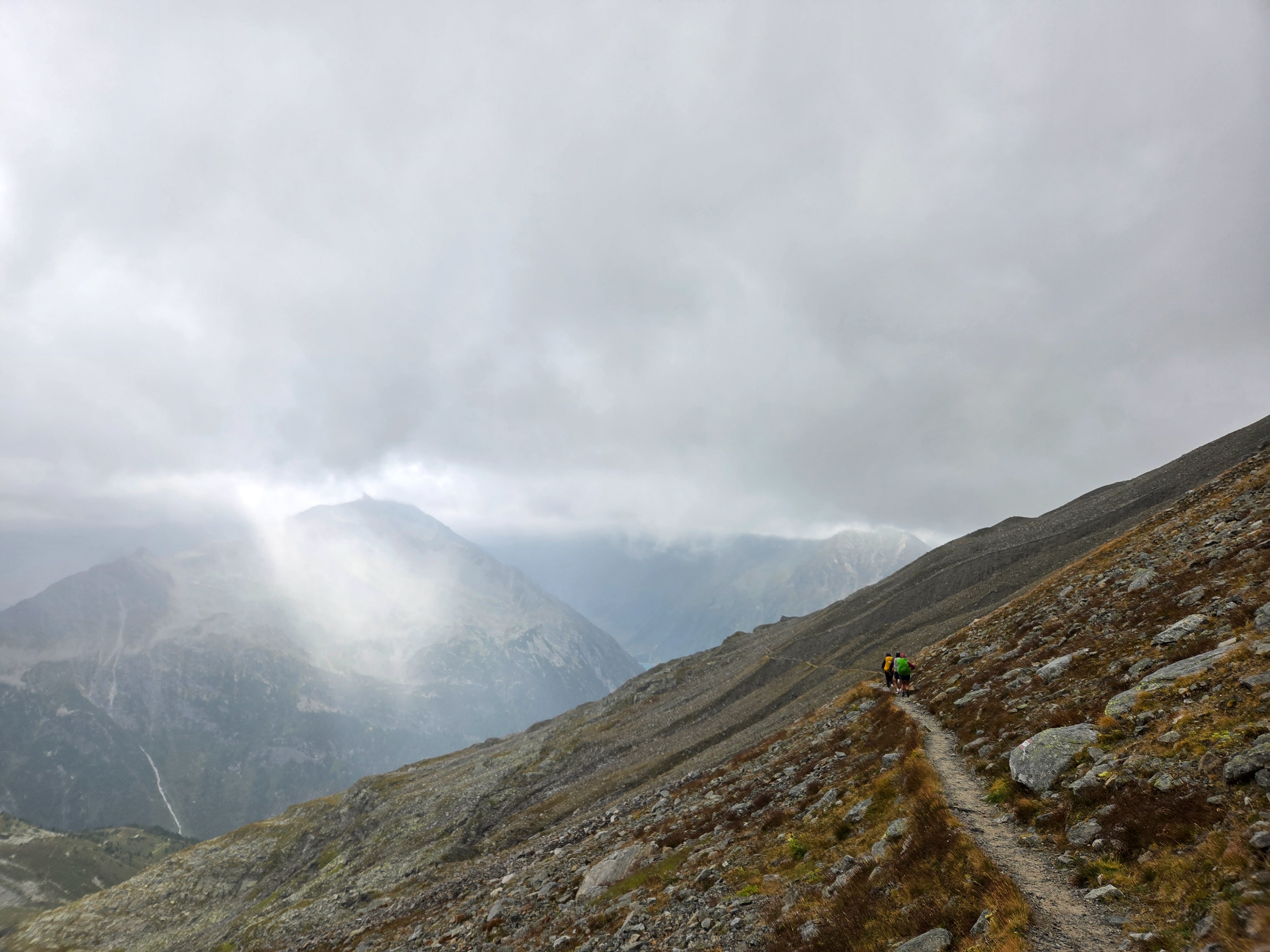 Morgan and Schlegeisspeicher . The hike descended from Olpererhütte to the dam and ran along the right side of the lake and then a little bit up on the left side of the stream in the back of the valley, then ascending up from there.