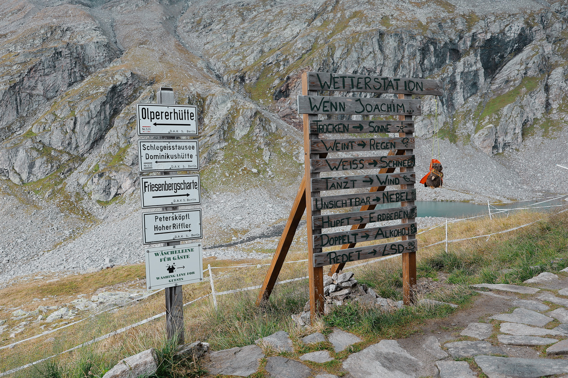 The signs at Greizer. The Gigalitz peak is 2 hours from here which means a 4 hour round trip from the hut.