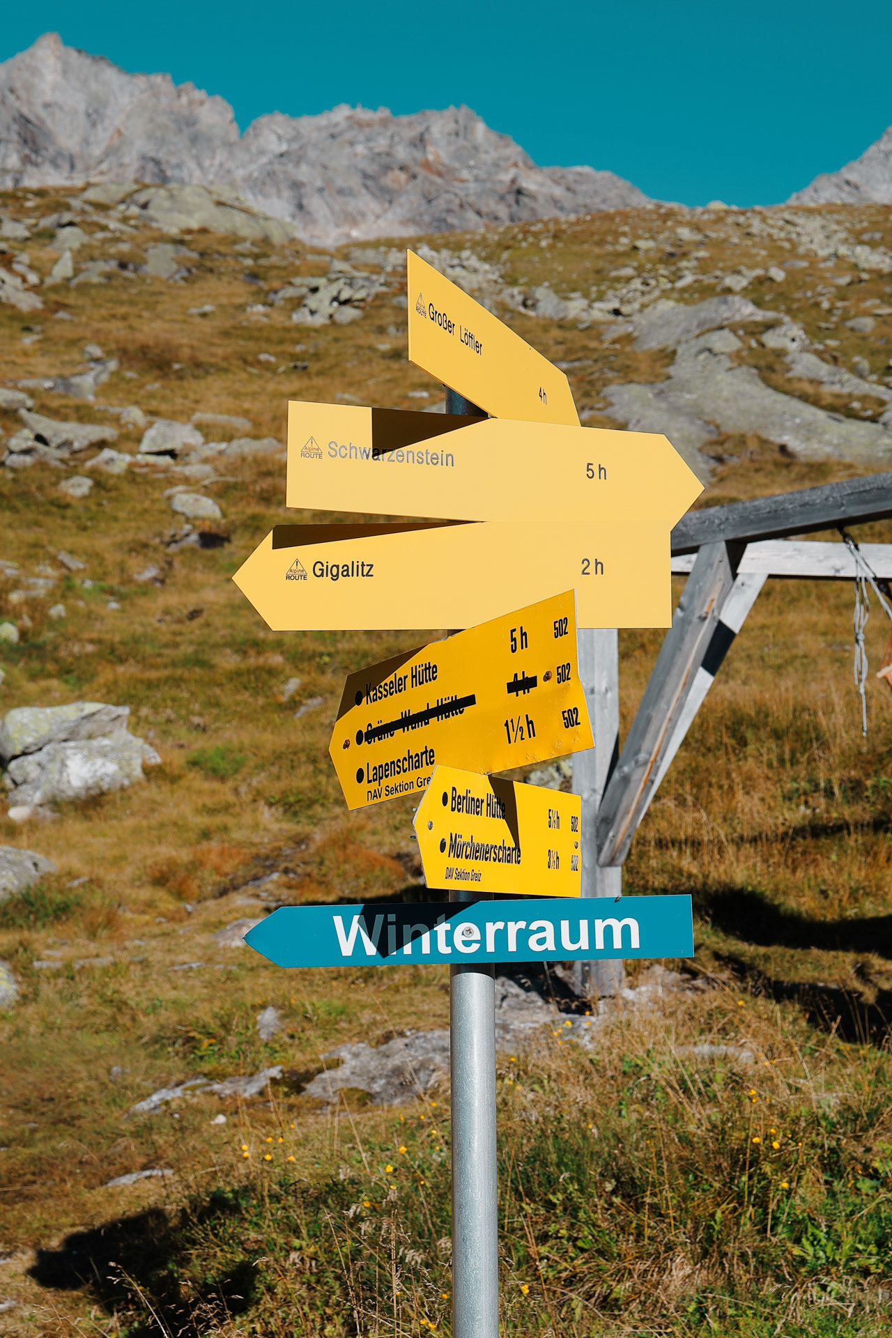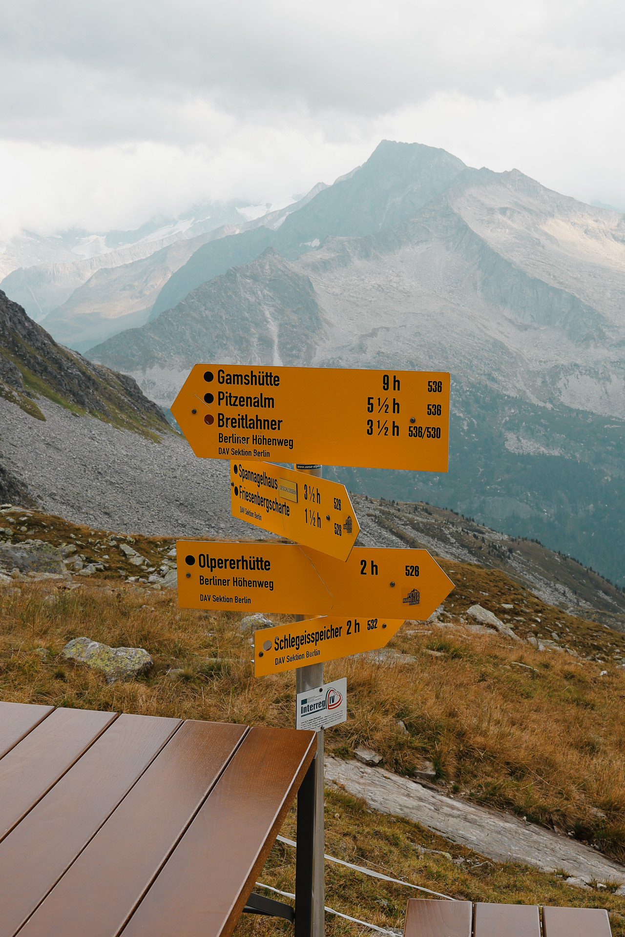 Trail signs at Friesenberghaus. The numbers on the right side of the sign denote the trail number on maps.