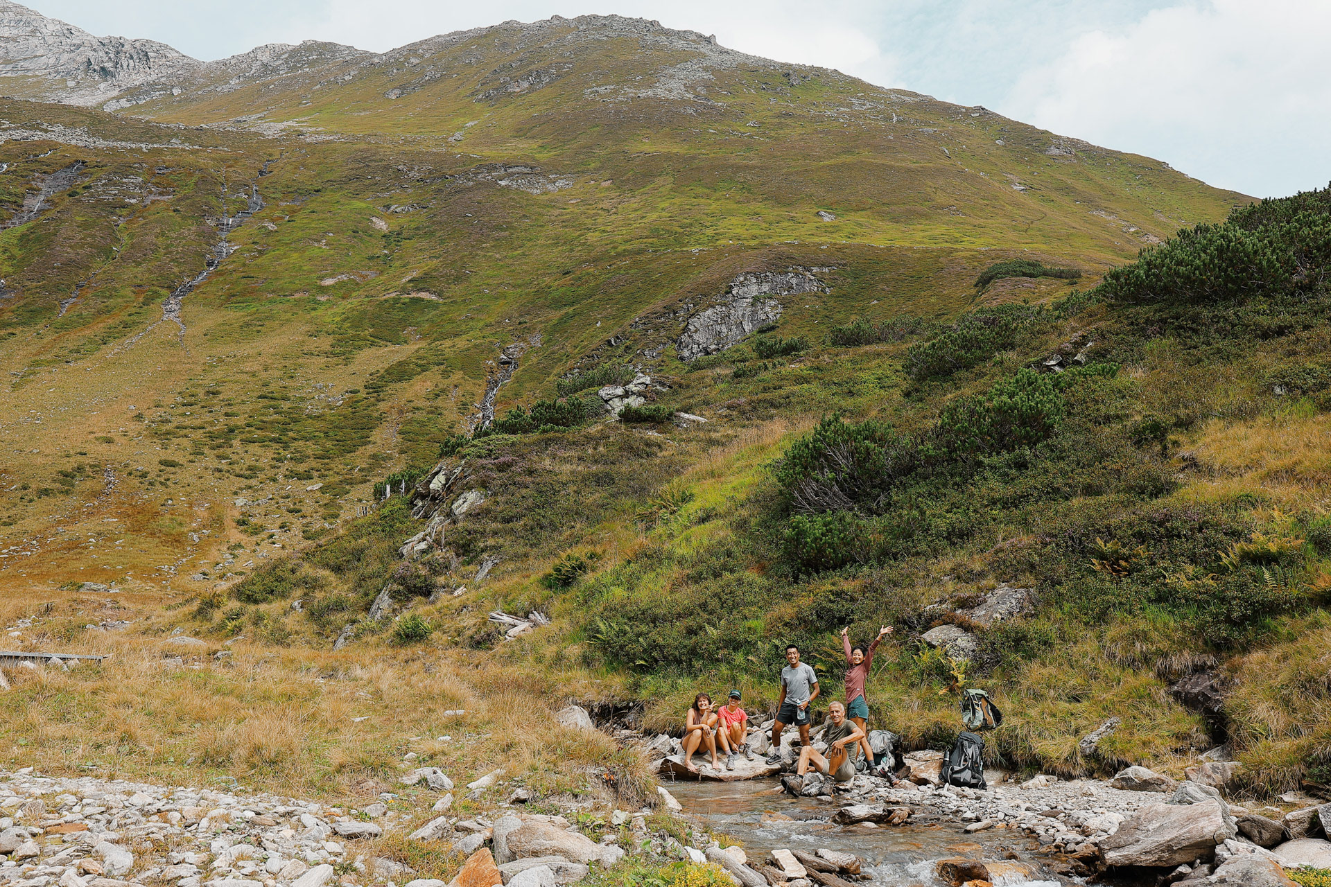 We head back on the trail to Greizer Hutte. When we see this flat area with a stream, we decide to have a quick lunch.
