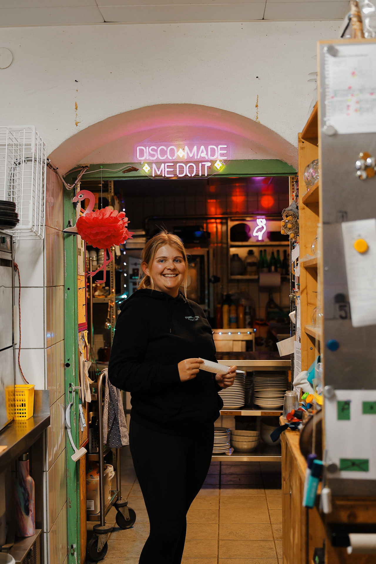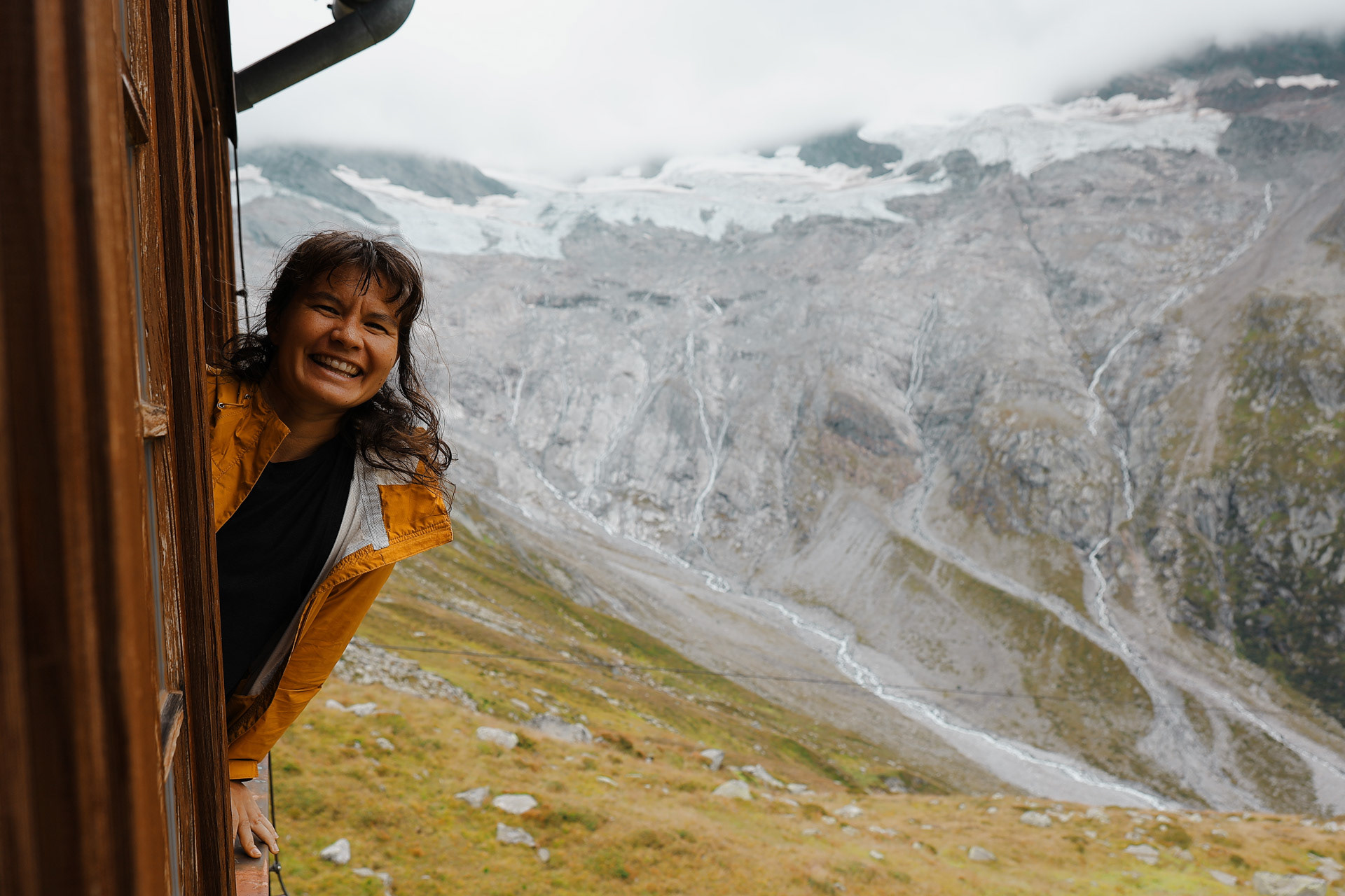 Young adults make up the majority of hut staffers who may work for for weeks to months at a time. This one said I could take her picture with the sign. We also learn that this hut is solely supplied by helicopter.