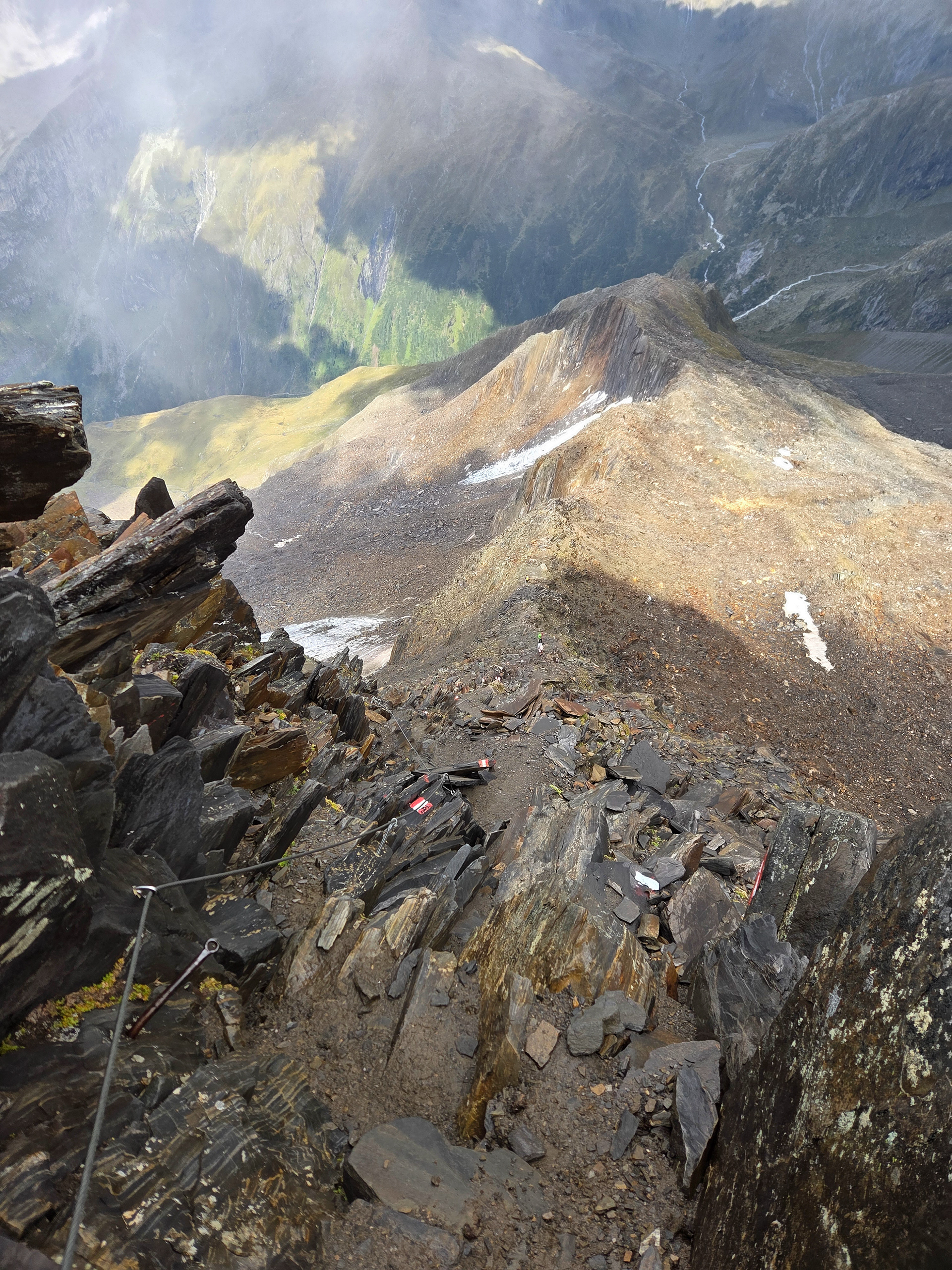 The view over the Mörchenscharte pass. You can see the next hut, Greizer Hutte in the middle of this picture. The leftmost peak is Gigalitz Peak which we hike to in Day 7 for a bonus hike! You can see a pass on the right side of the peak and that is the regular way for Stage 7. Today, we need to descend to the bottom of the valley and back up to the hut. At the bottom left you can see some of the metal cables.