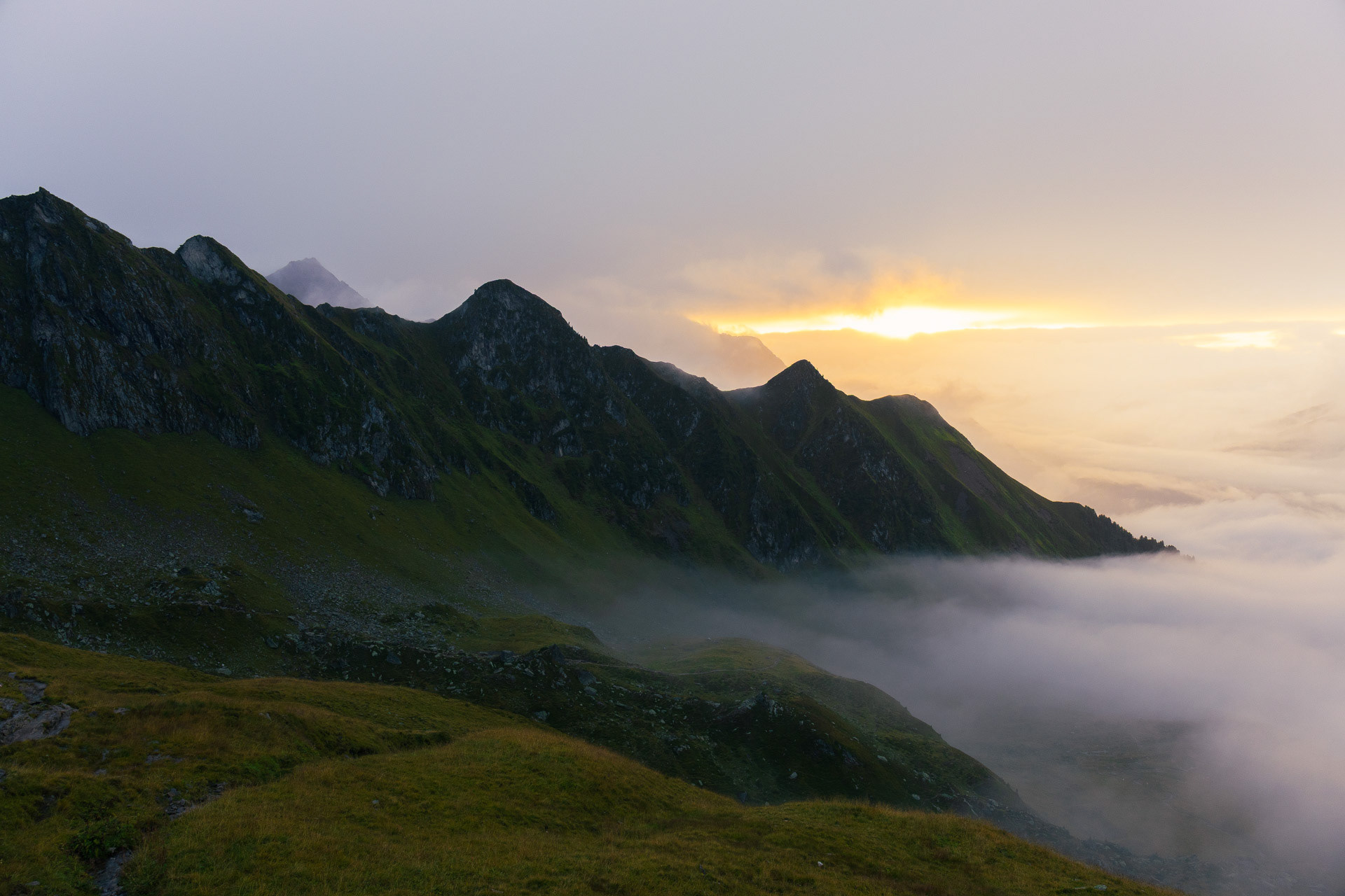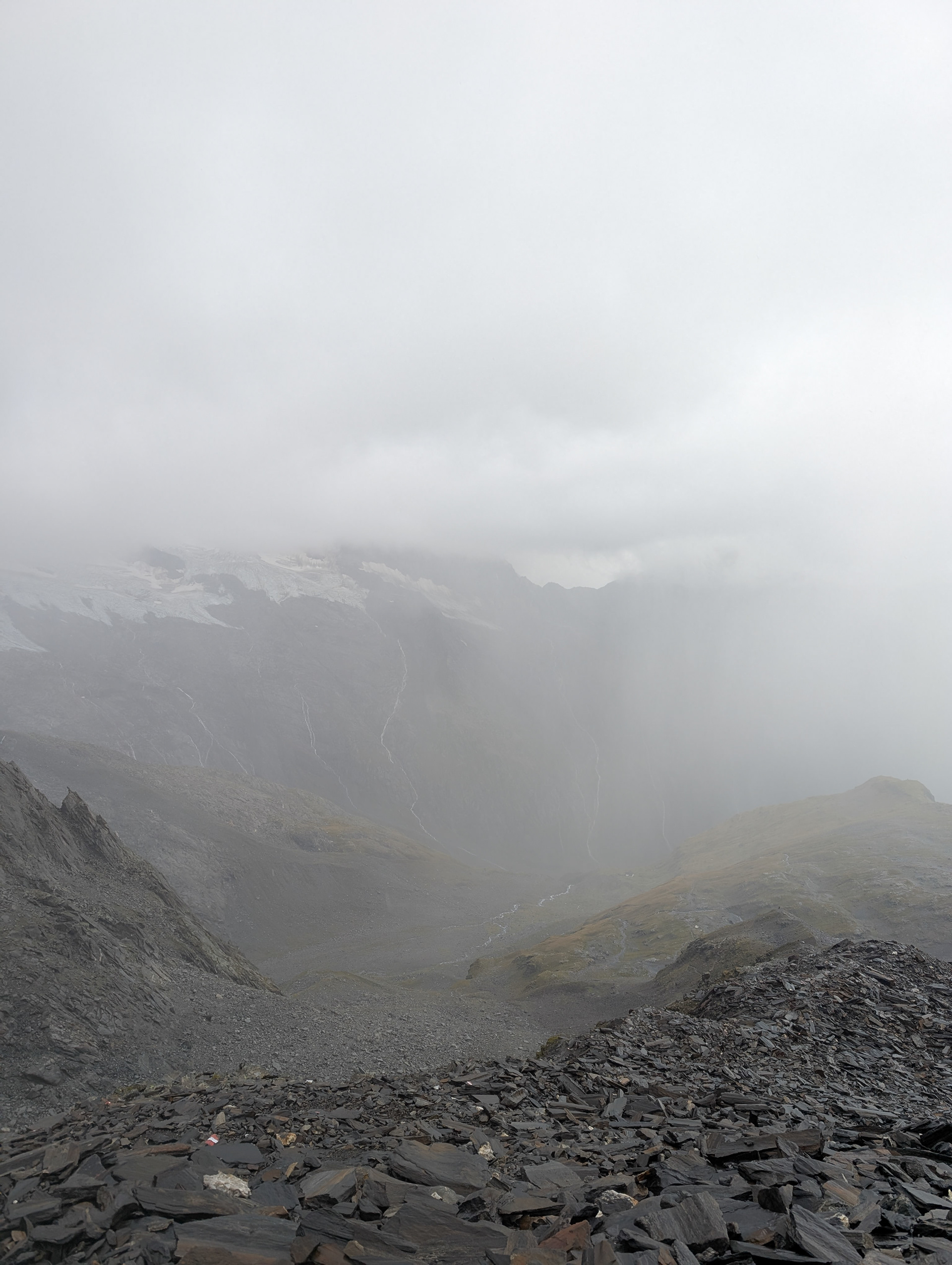 Okay some slivers of light. You can see the mouths of 3 different valleys from here. Also... clouds are below us! Also, we found out from the hut staff that there might be thunderstorms the next day...