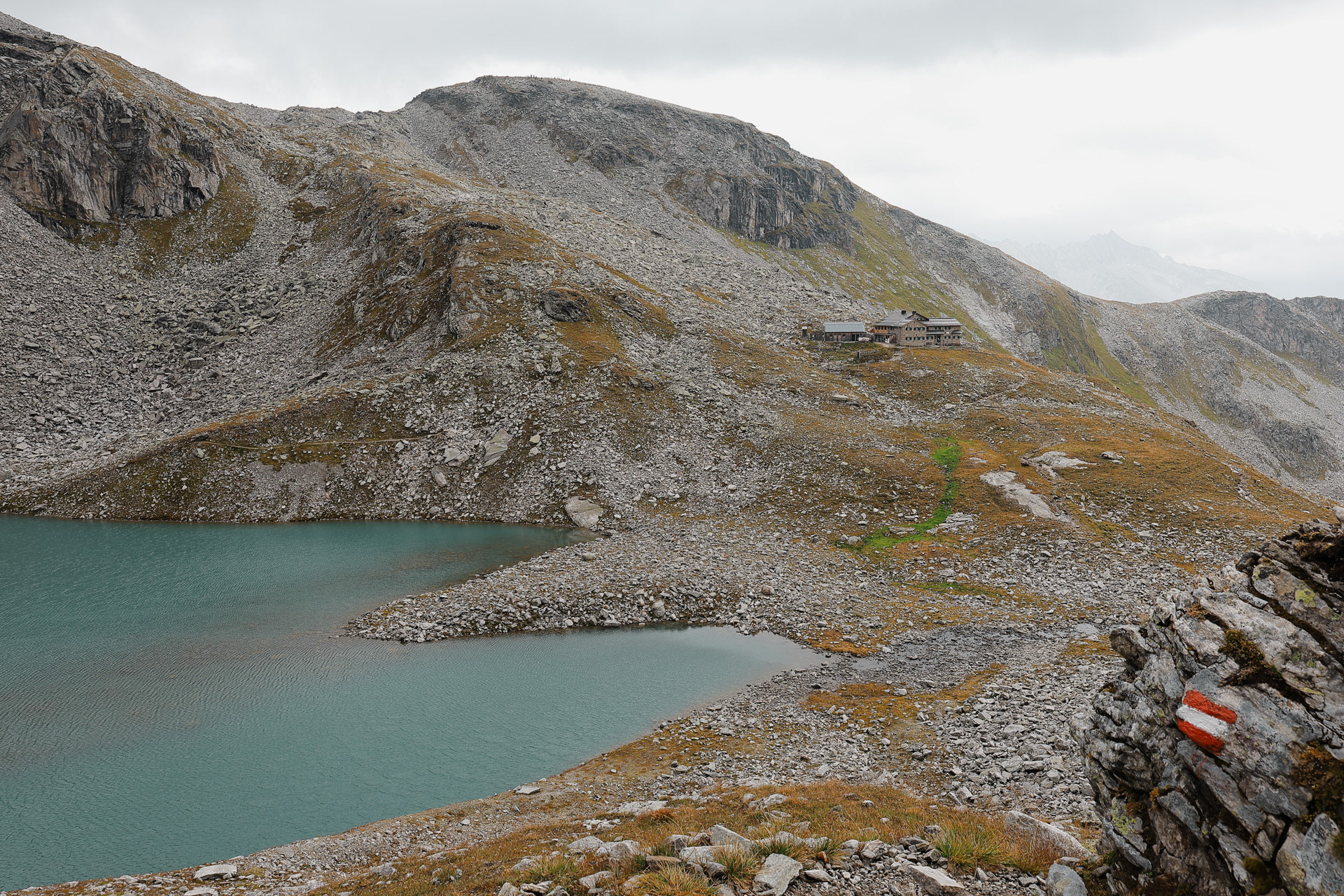 On the left is Friesenbergsee ("see" is lake in Deutsch), Friesenberhaus in the distance, and an Austrian flag trail marker on the right.