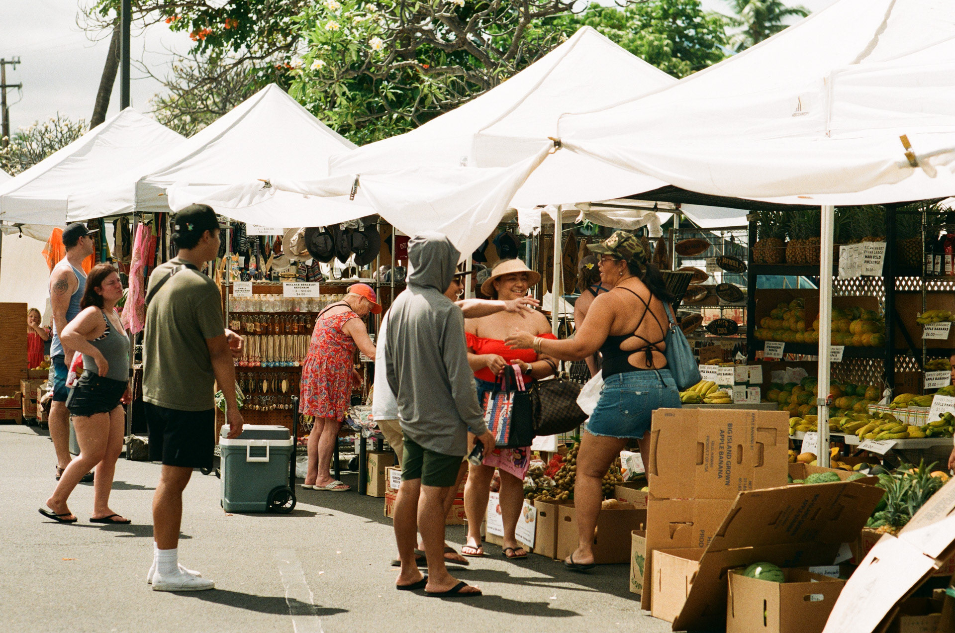 Kona Farmers market, a good mix of locals and tourists, produce and souvenirs.