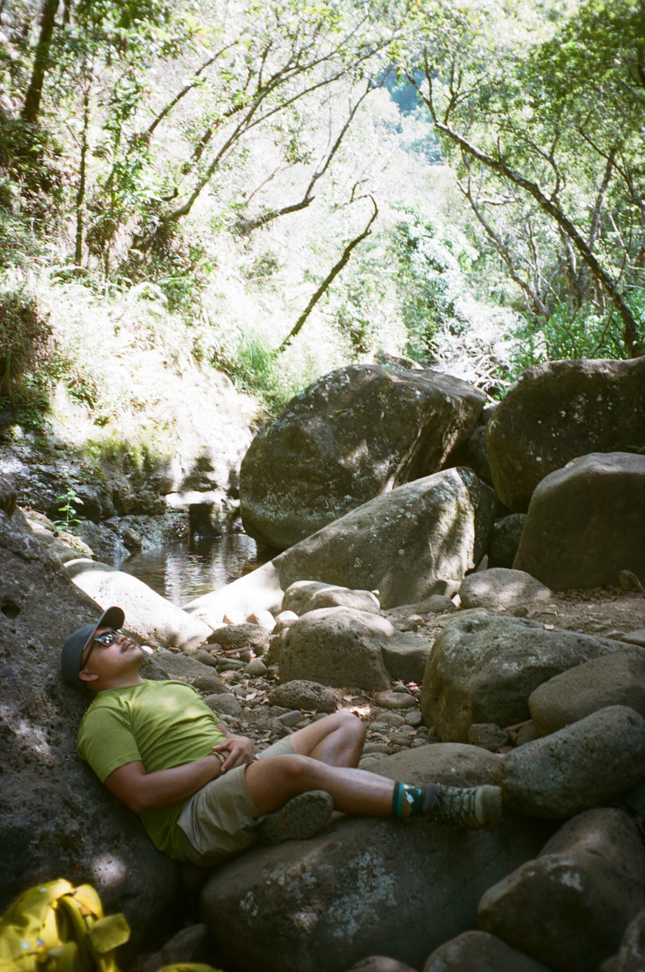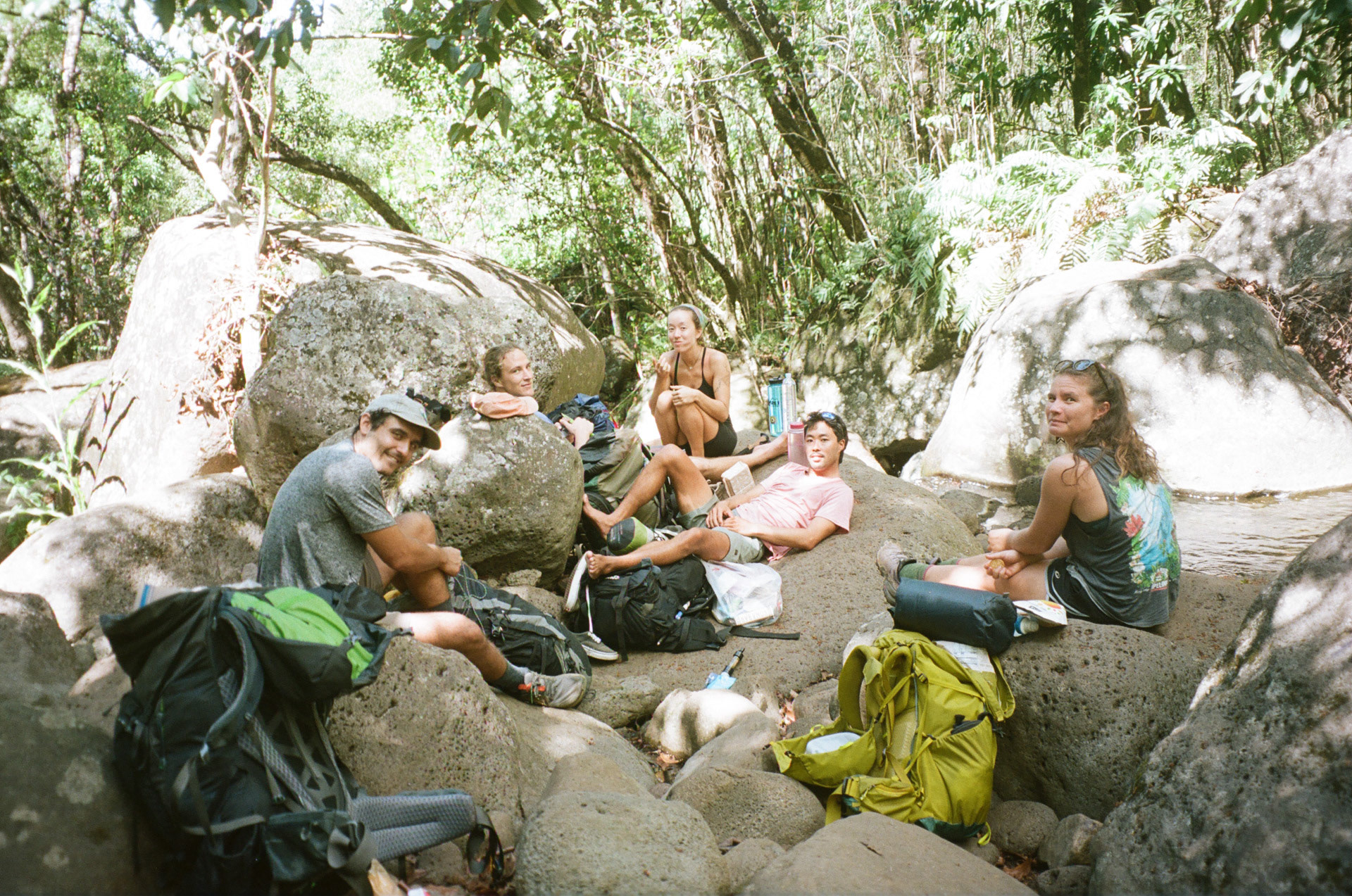 Resting for lunch at the midway point of the hike, Hanakoa Stream which comes in from Hanakoa Valley.