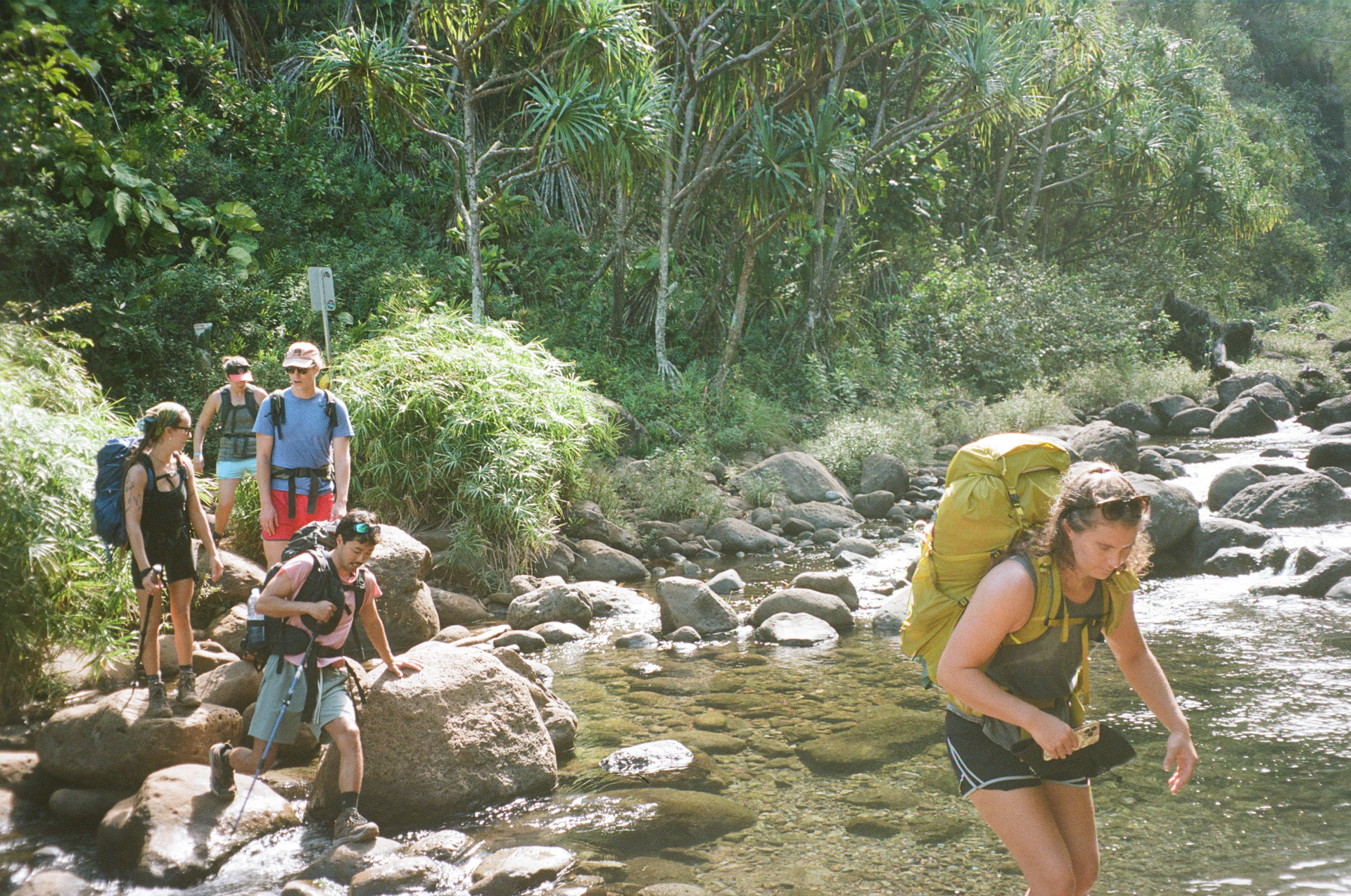 There are multiple stream crossings throughout the hike, this is the first one, Hanakāpīʻai Stream. Difficulty differs with how hard it's rained in the valley recently. Some people will opt to take their shoes off and wade in the water. This is also the first source of fresh running water from the start of the hike.