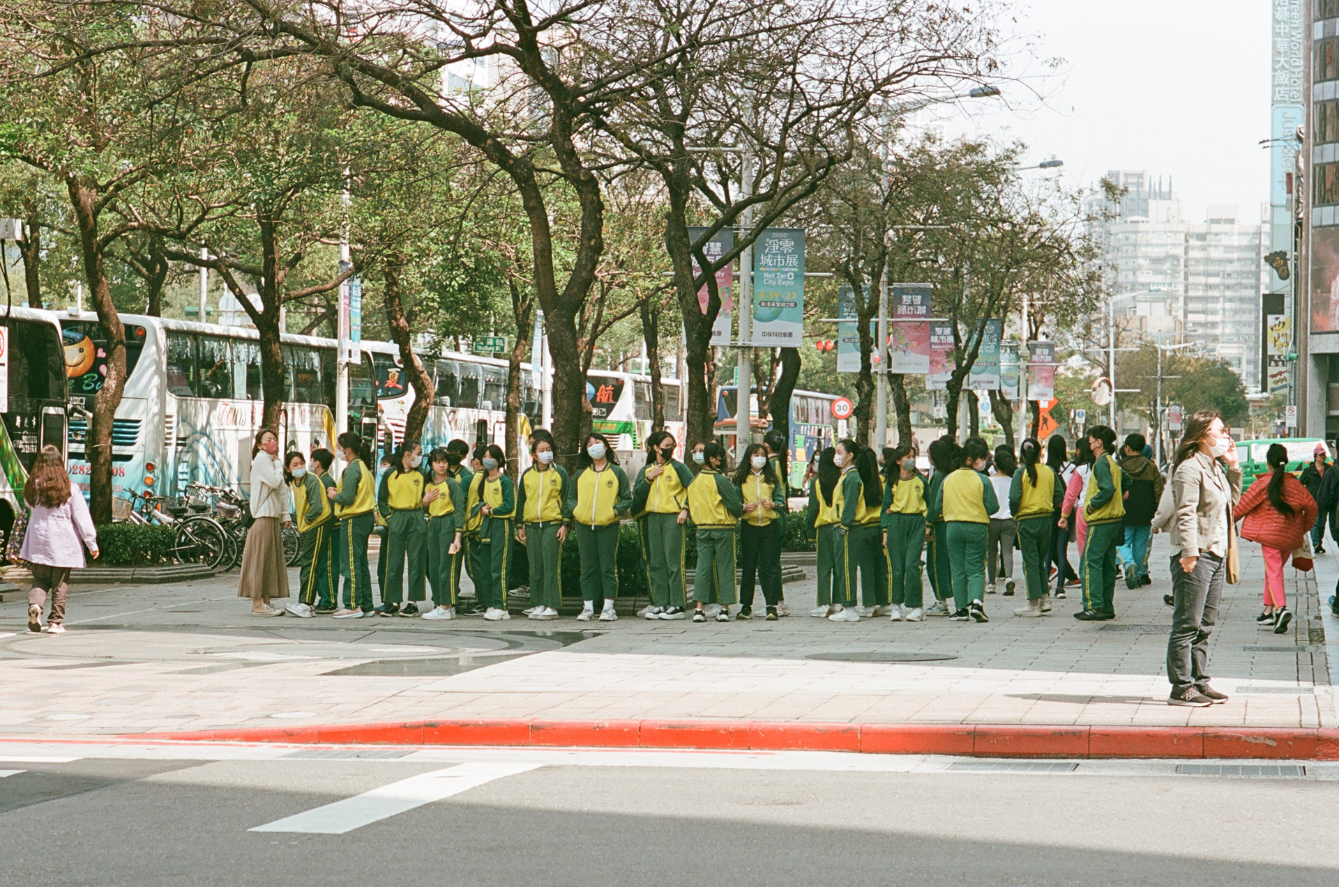 Groups of Taiwanese students waiting for busses. Are they going on a field trip? A group would get on a bus and another group would come out of the building. I was waiting for my friend and there were a lot of groups and a lot of busses.
