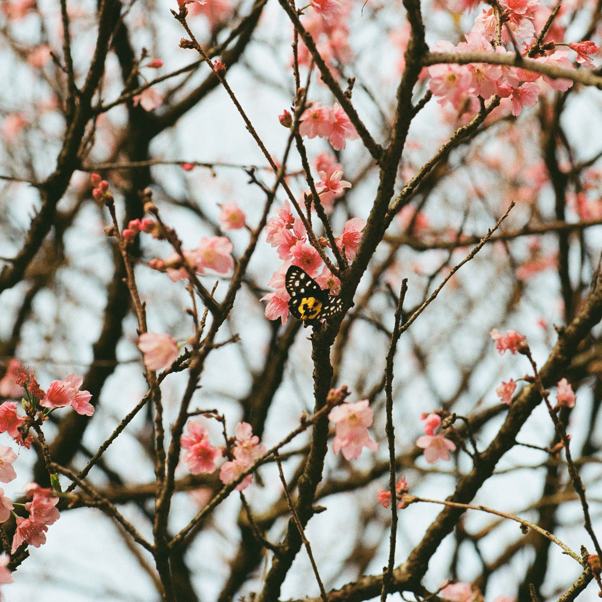A monarch-looking (but not quite one) but not one flying through the sakura leaves. Love the contrast of the pink sakura blossoms and the black and orange of the butterfly. Took one shot, definitely got lucky!