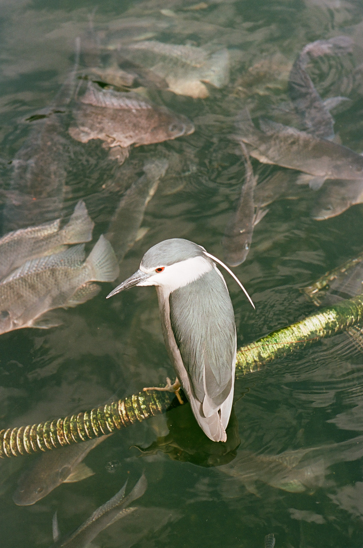 A Black-crowned Night Heron (nycticorax nycticorax) in pond of fish (species unknown).